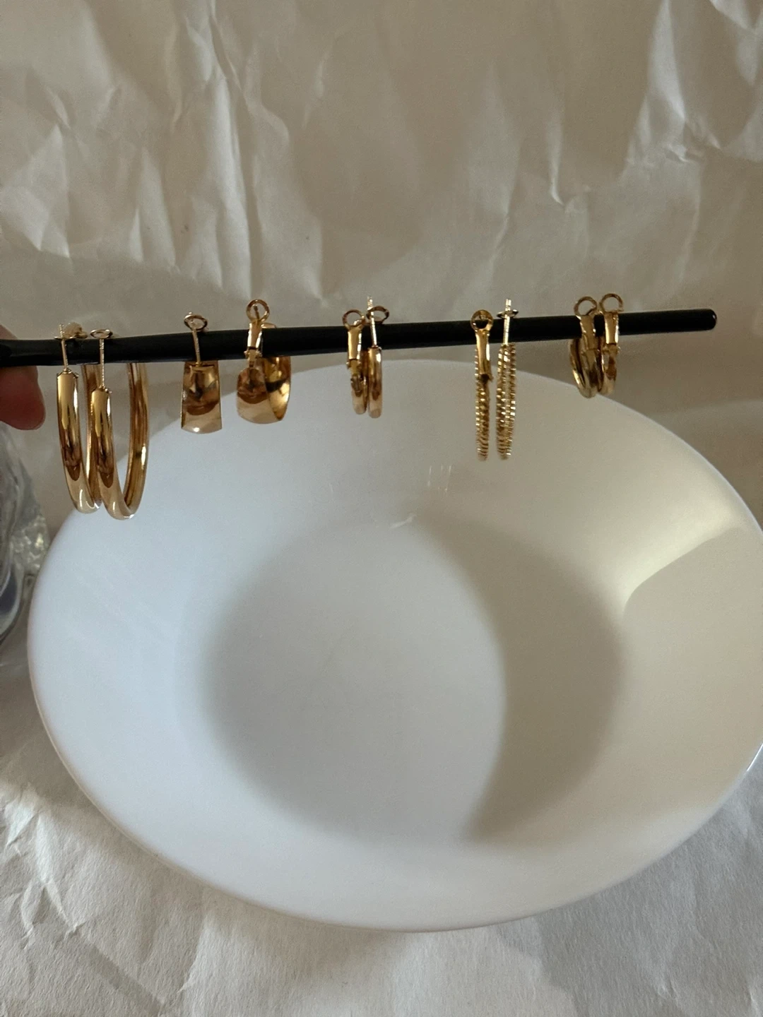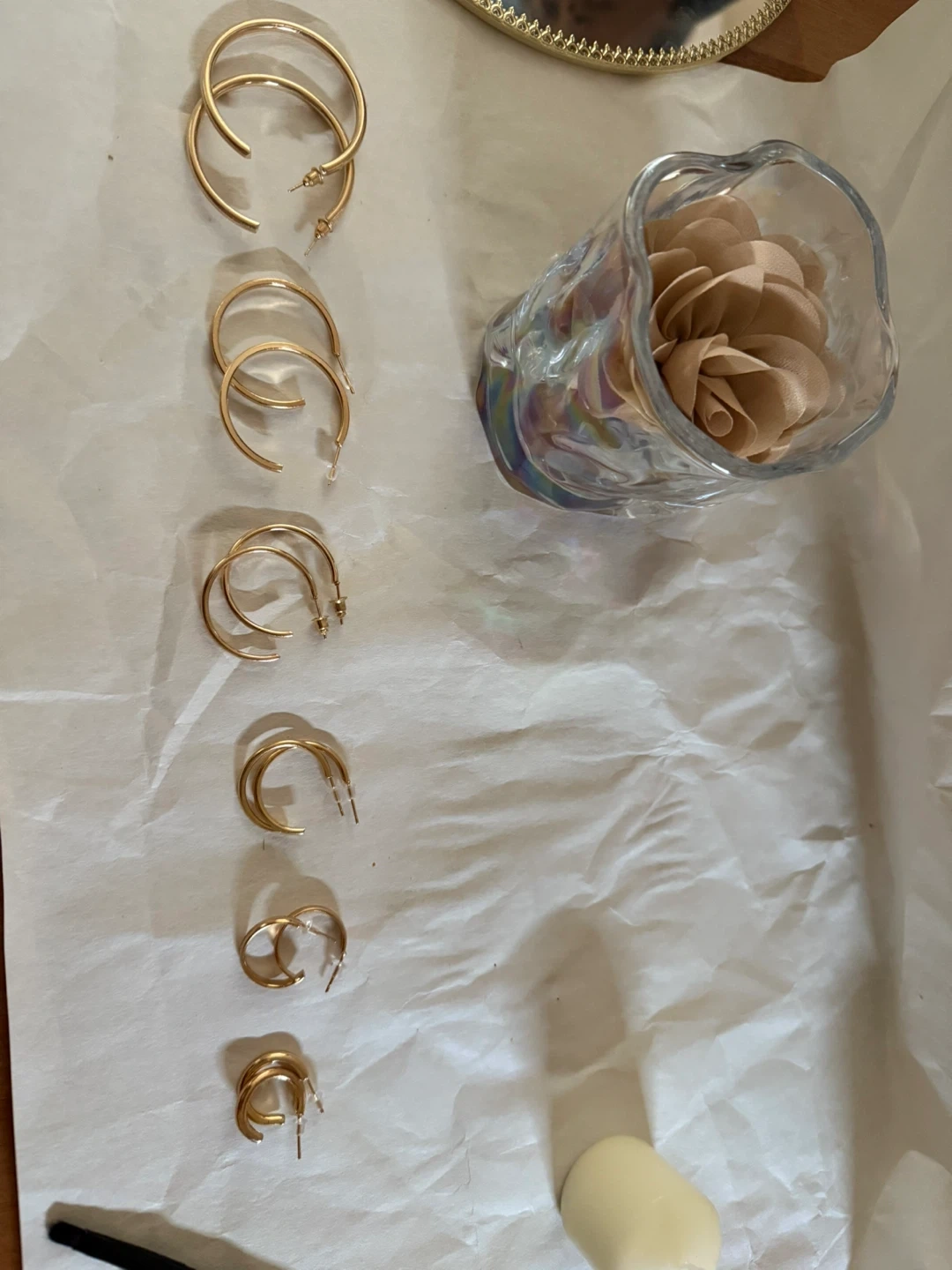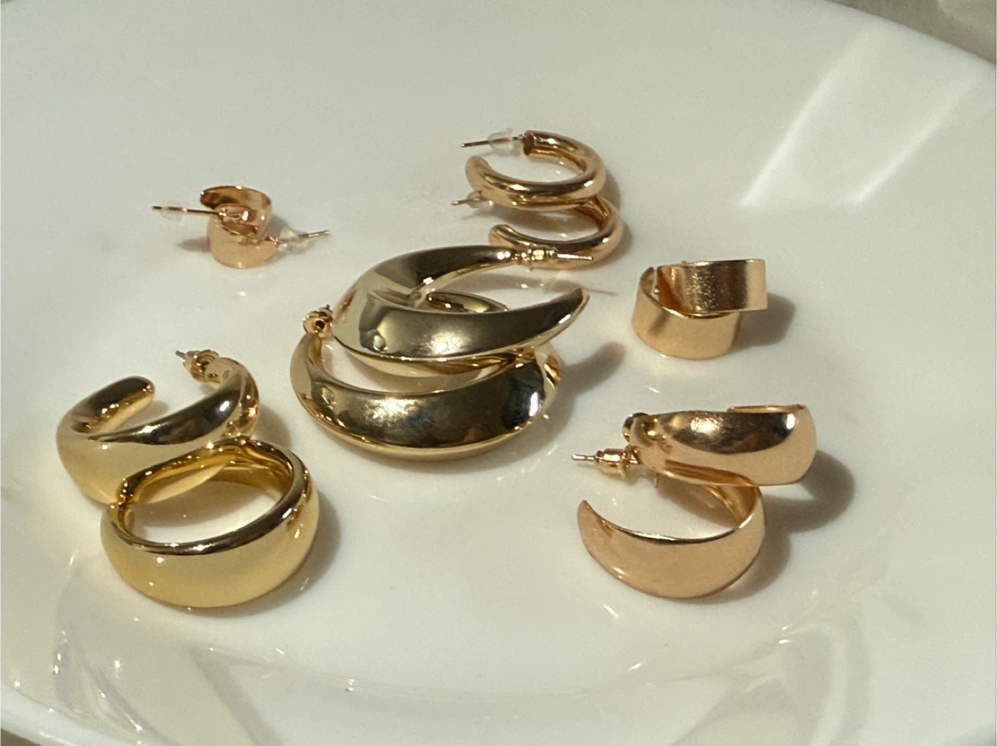 Selling a collection of gold hoop earrings. There's a variety of styles and sizes, perfect for adding a touch of sparkle to any outfit!Any 5 mix and match with any sizes.