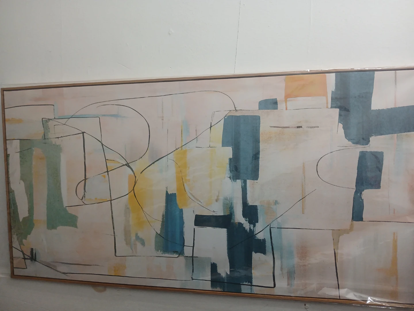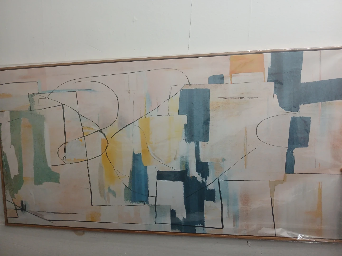 A beautiful piece of abstract wall art that will add a touch of modern elegance to any room. The colors are soft and calming, and the design is unique and eye-catching. It's in great condition and ready to hang!new in plastic cover.its big for my room.
