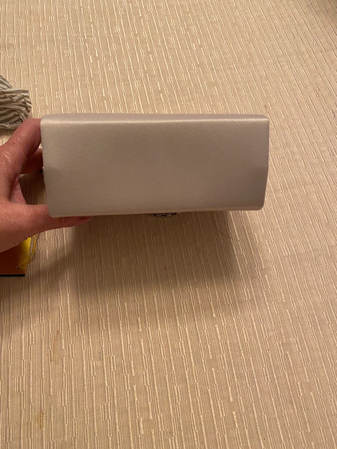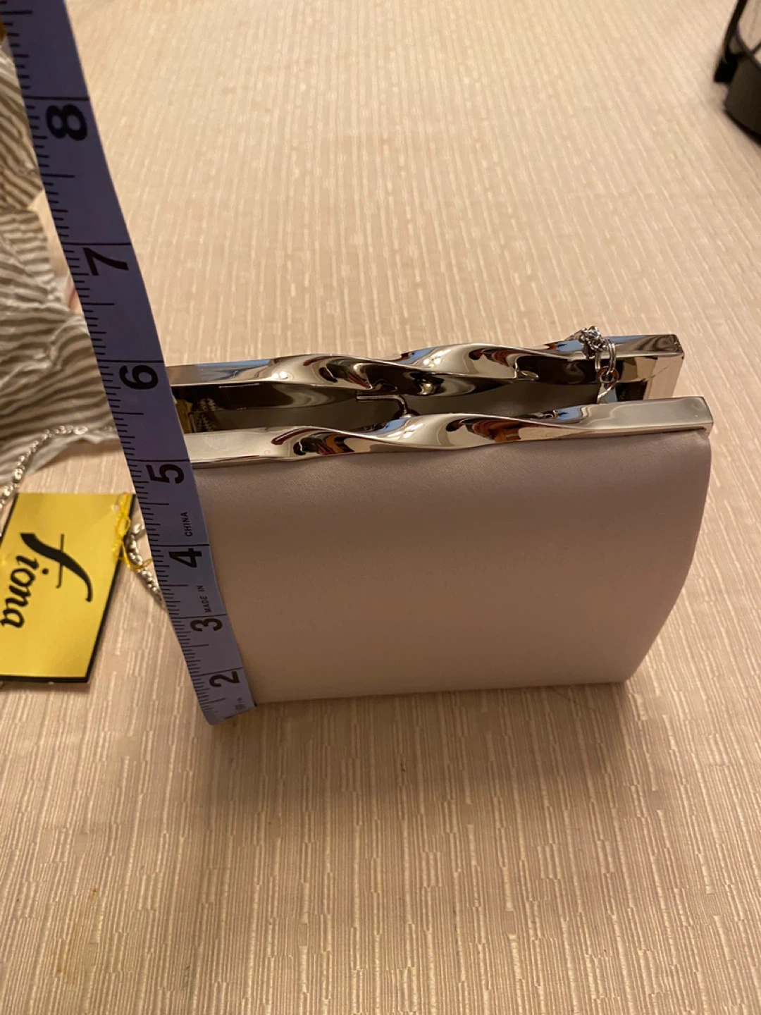 This Fiona evening bag features a silver chain and a sleek design. It's perfect for a night out or a special occasion! The bag is new.