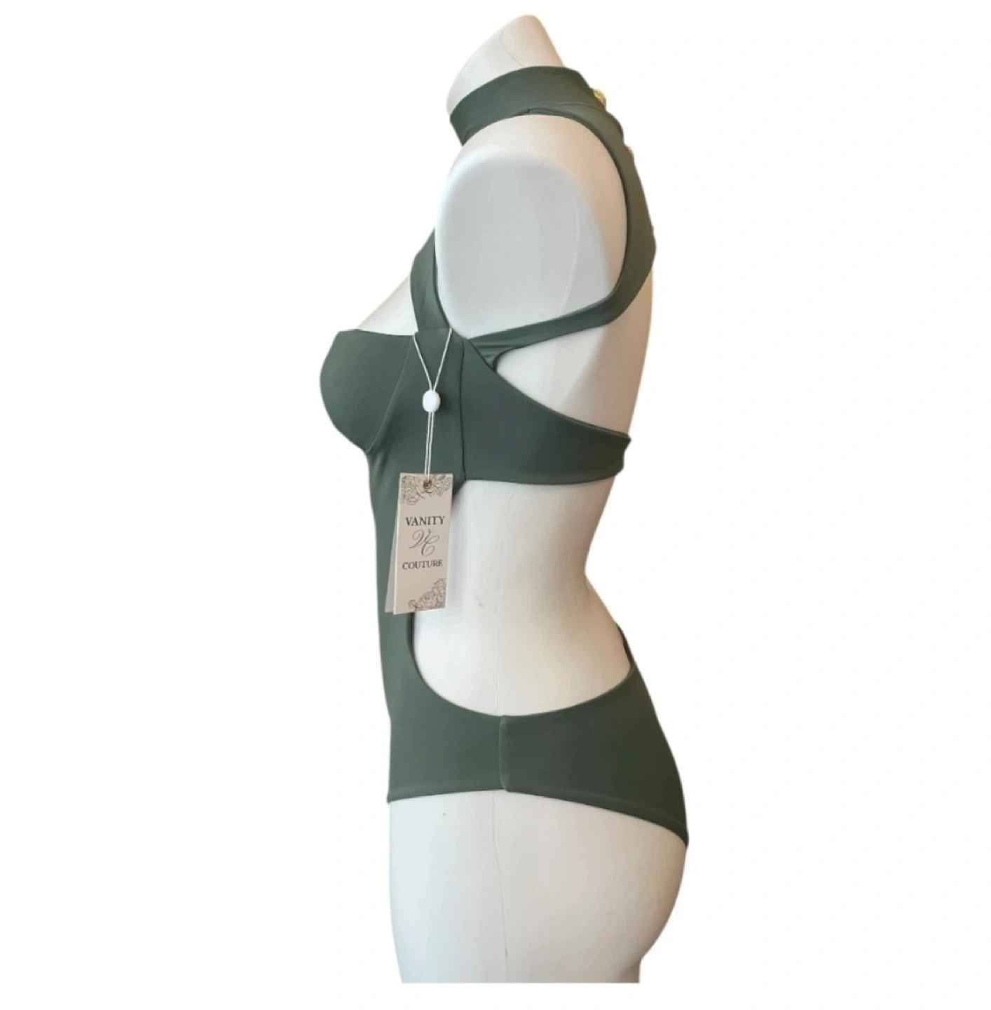 This is a Vanity Couture swimsuit in a lovely olive green colour. It has a unique design with cutouts and a high neckline. Great for making a statement at the beach or pool!