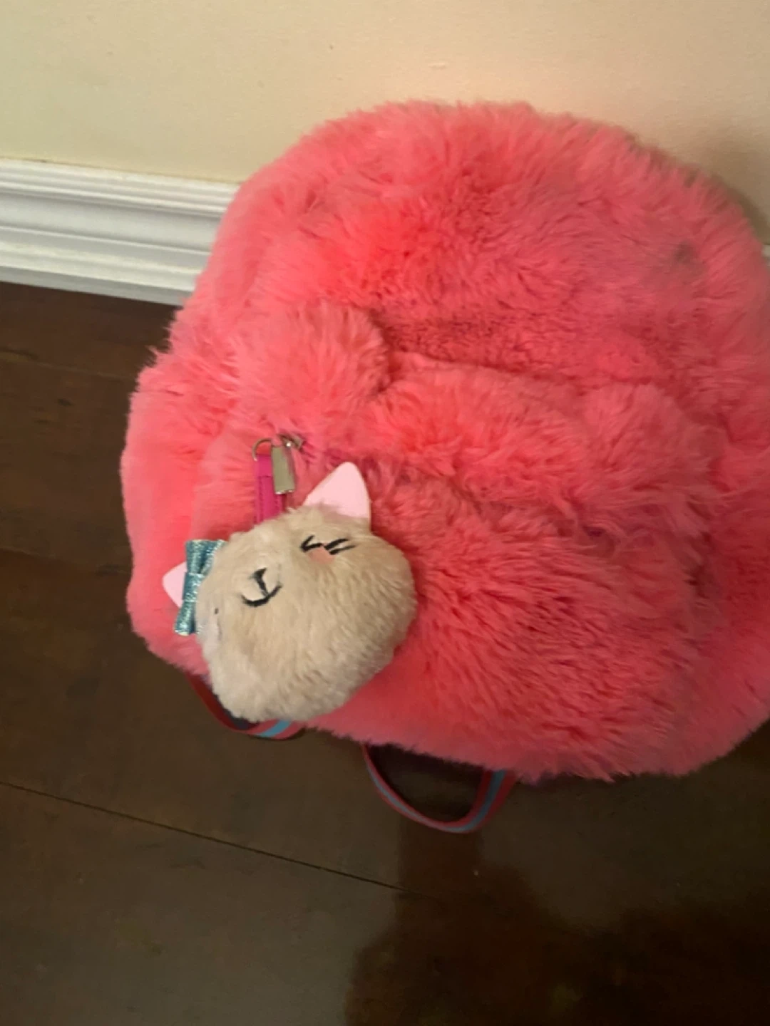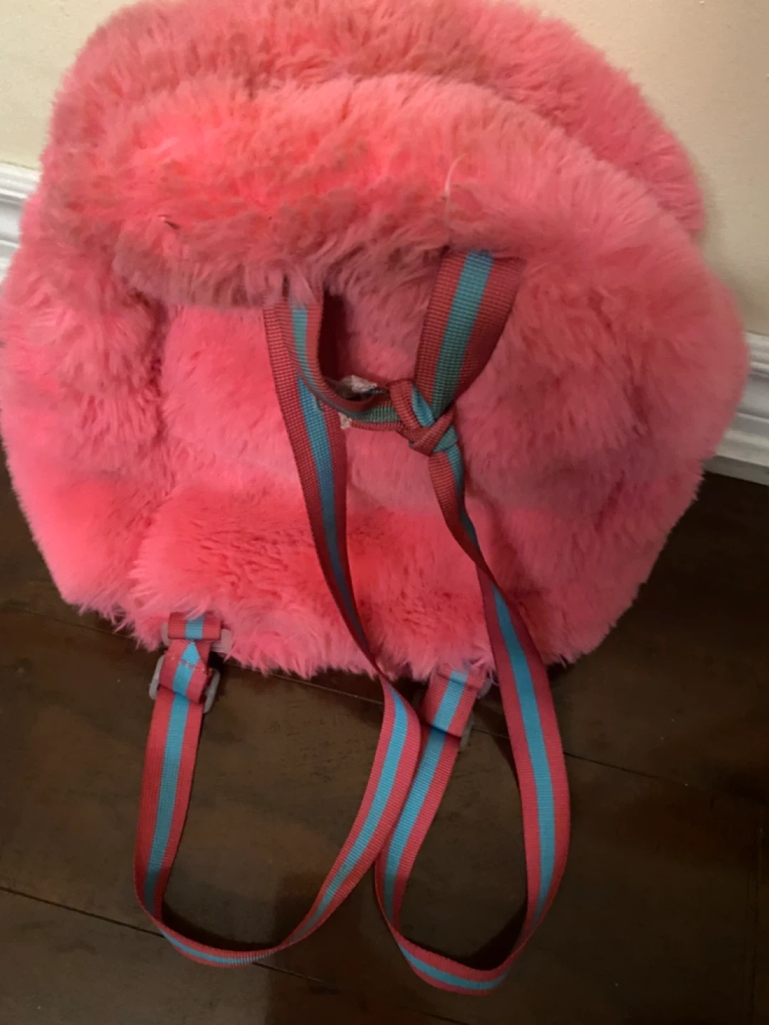Selling a super cute pink fuzzy backpack! It's in great condition and perfect for adding a fun touch to any outfit. The backpack features adjustable straps and a fun cat keychain
