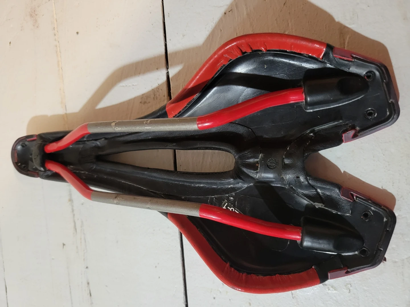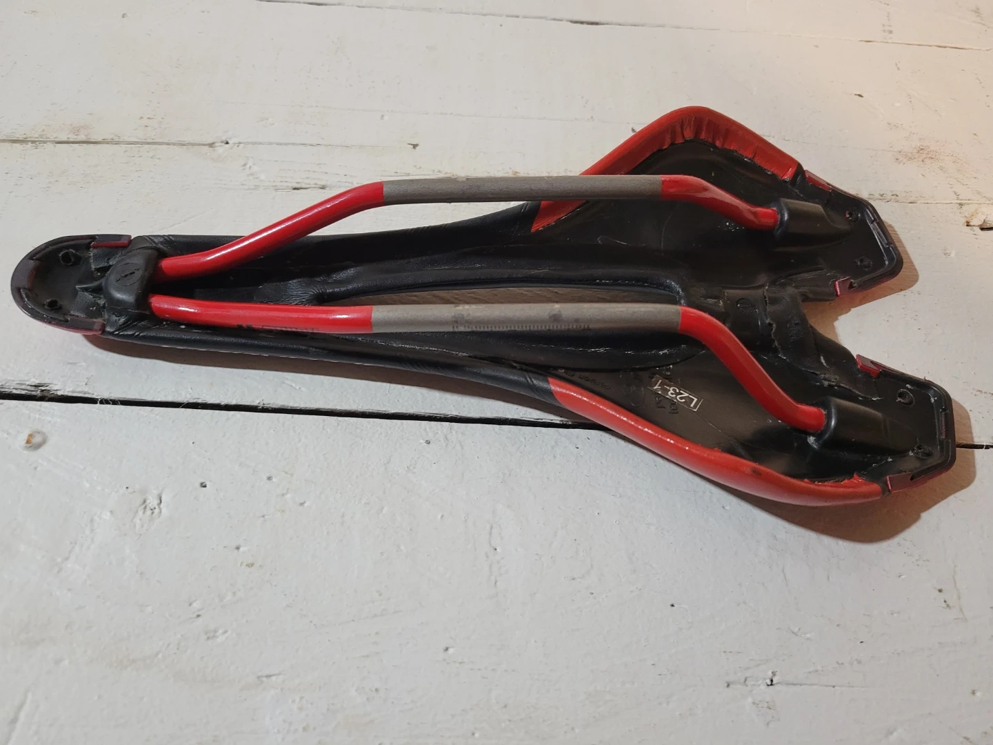 Selling a Specialized Toupe bike saddle in black and red. It's in new condition and ready for your next ride! Super light. Carbon fibre. Measures 12.5 cm at the widest point.