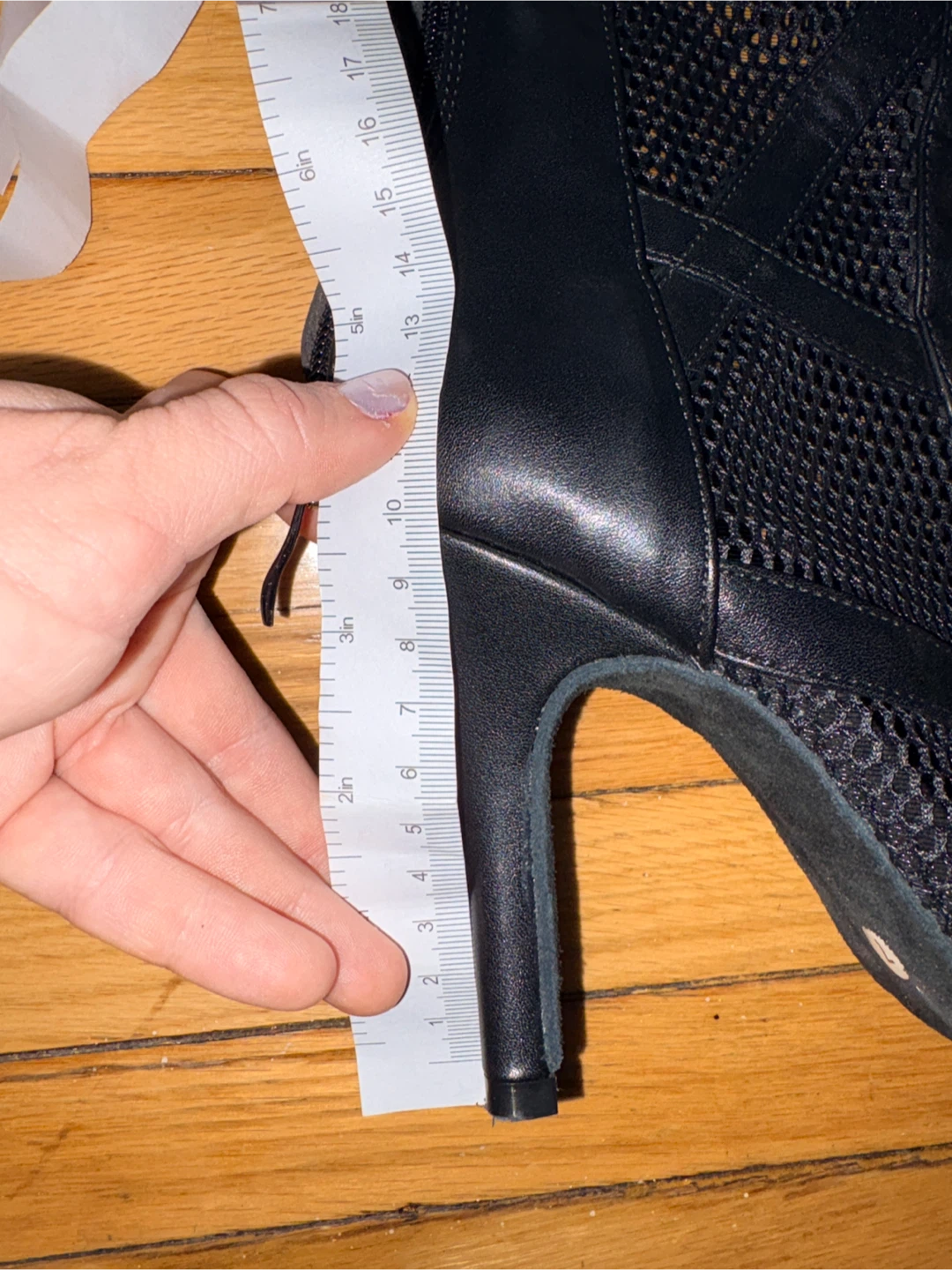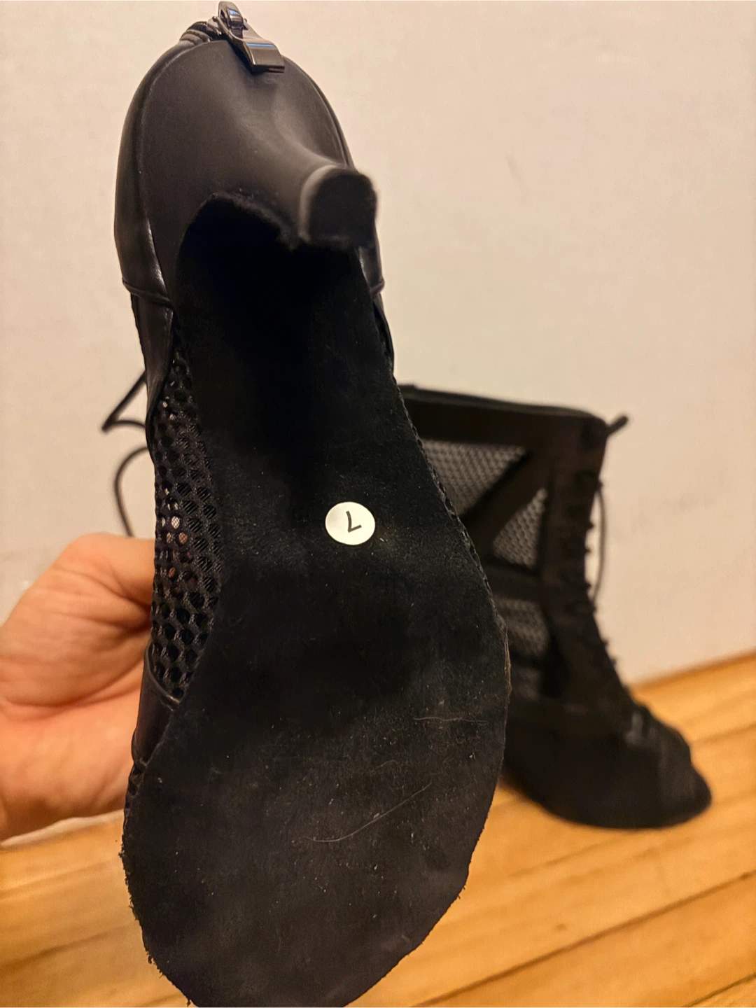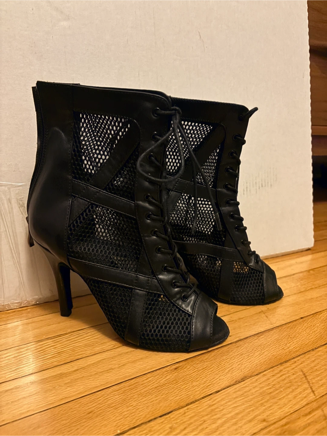 Selling a pair of black dance boots in size 7. They feature a stylish open-toe design with mesh detailing and lace-up fronts. The heel height is 3-4 inches. Perfect for dance practice or a night out!