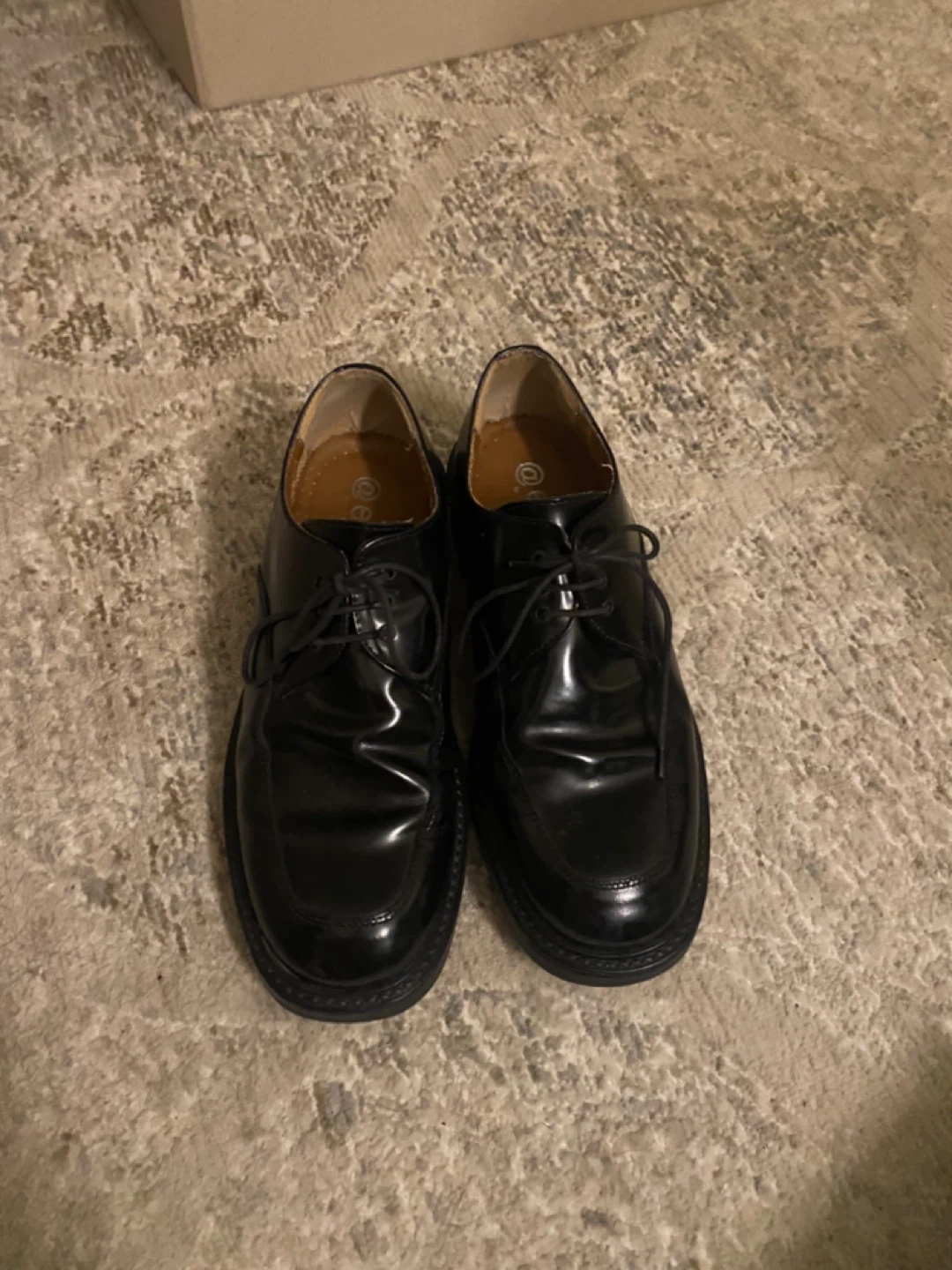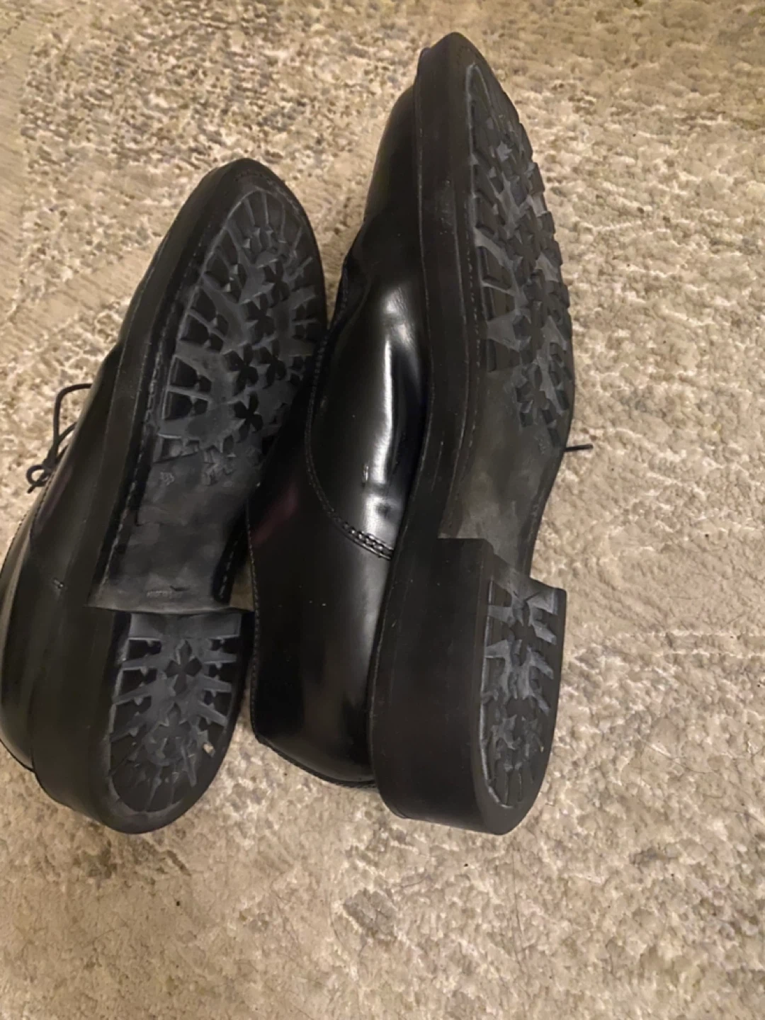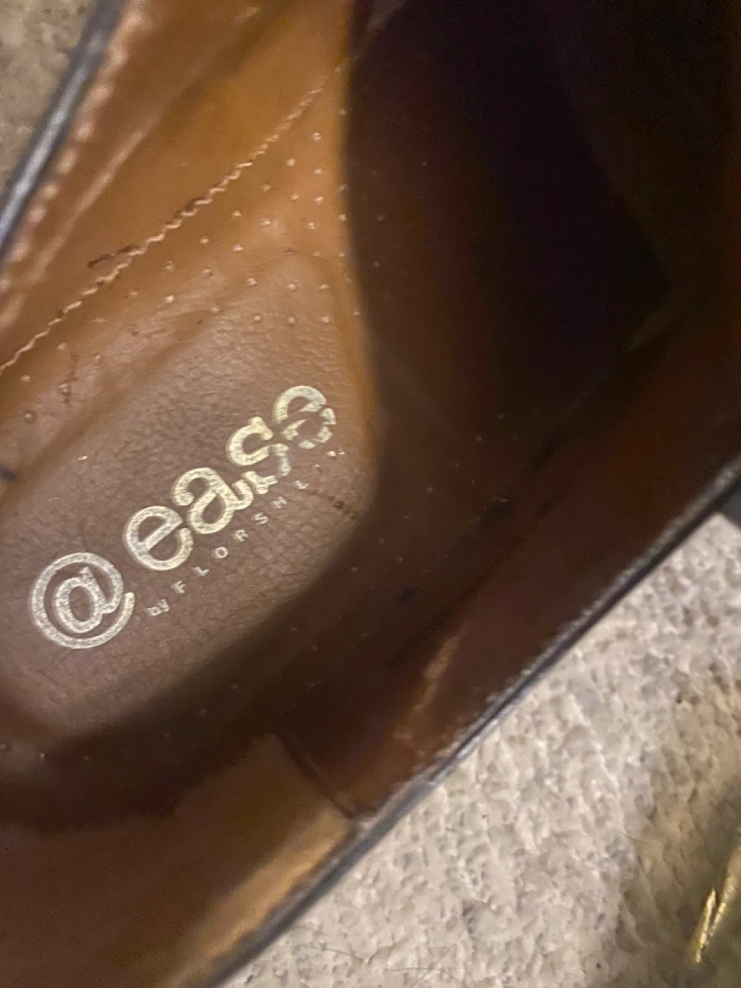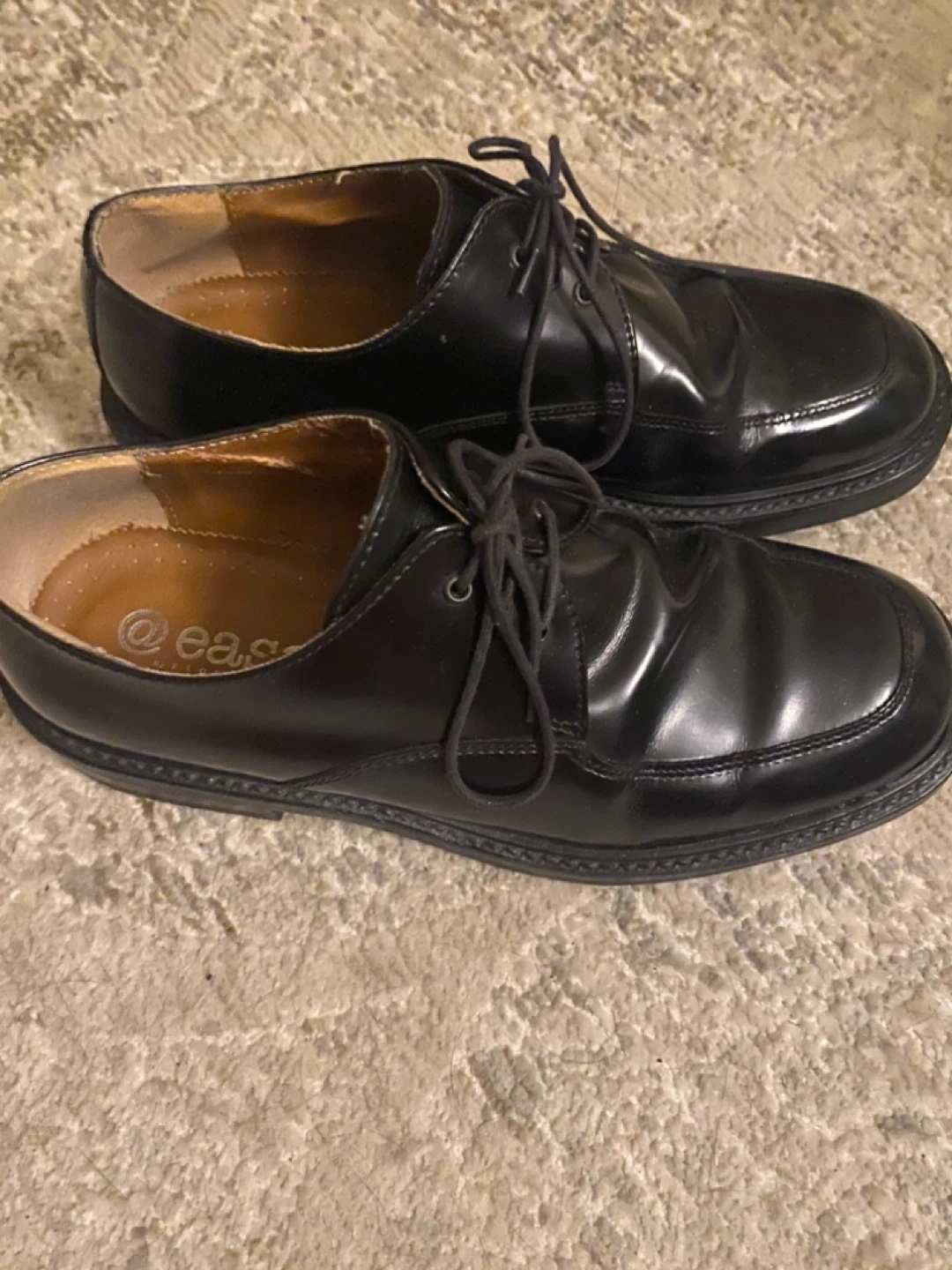 Classic black leather dress shoes by Ease by Florsheim! These shoes are made in Italy and have a sleek, polished look. The soles show some wear, but the uppers are in great shape. Perfect for any formal occasion or to dress up your everyday style