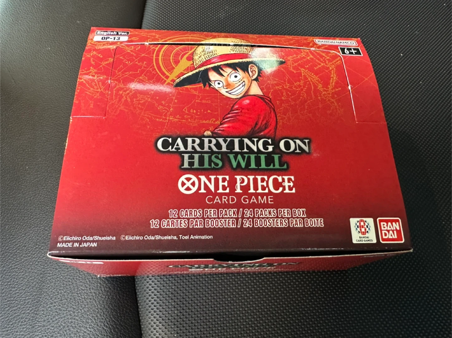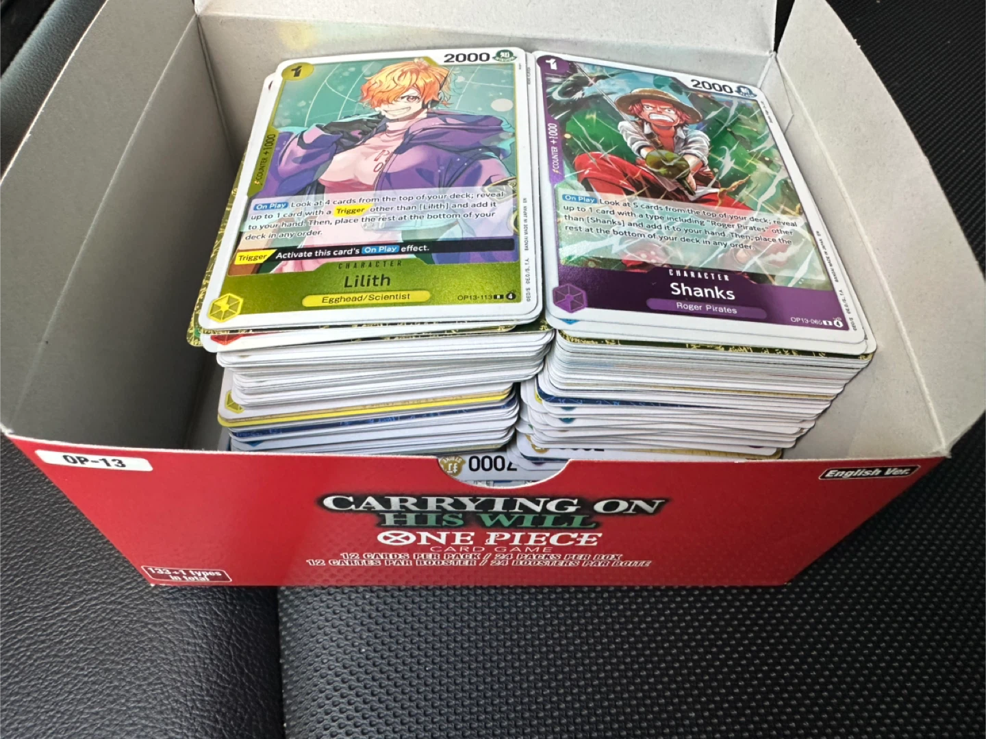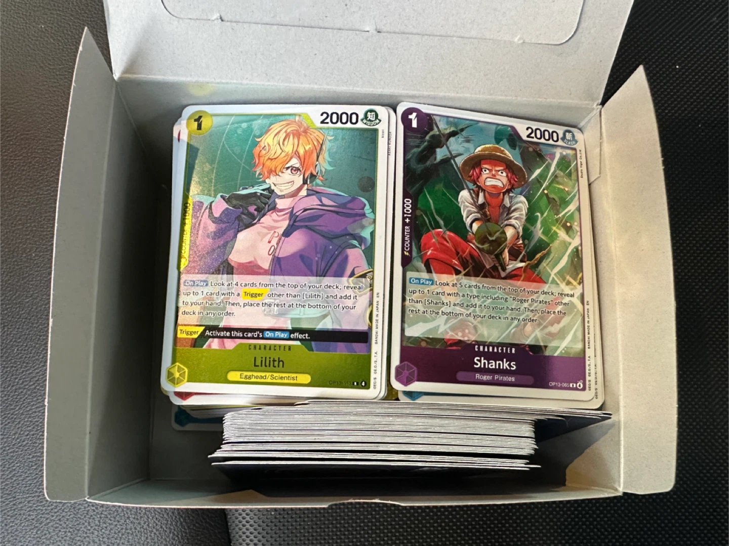 I have a box of mostly Op-13 cards with some OP-09 as well. A few cards are Japanese but almost all are English. Included are a couple SR cards and approximately 40+ holos/rares along with many more common bulk. All cards are NM or better.