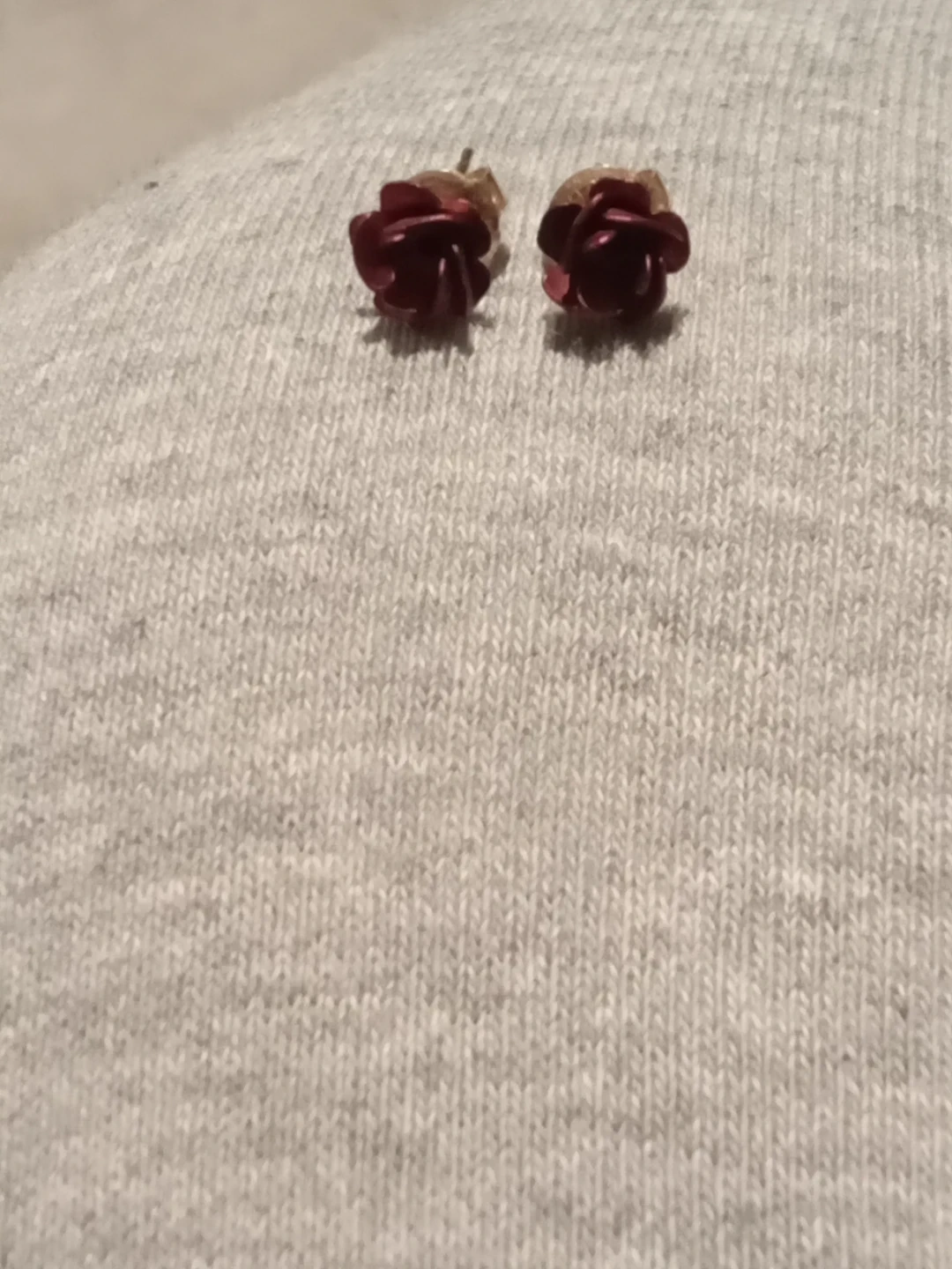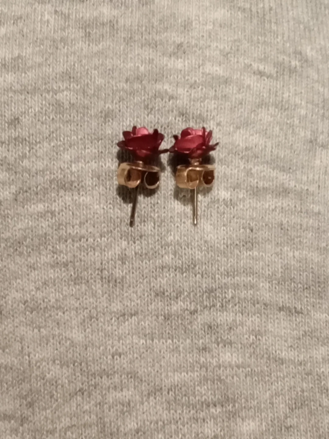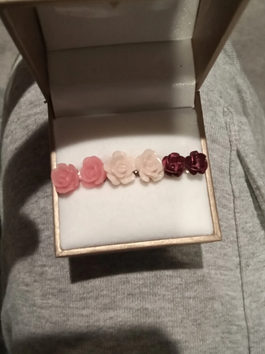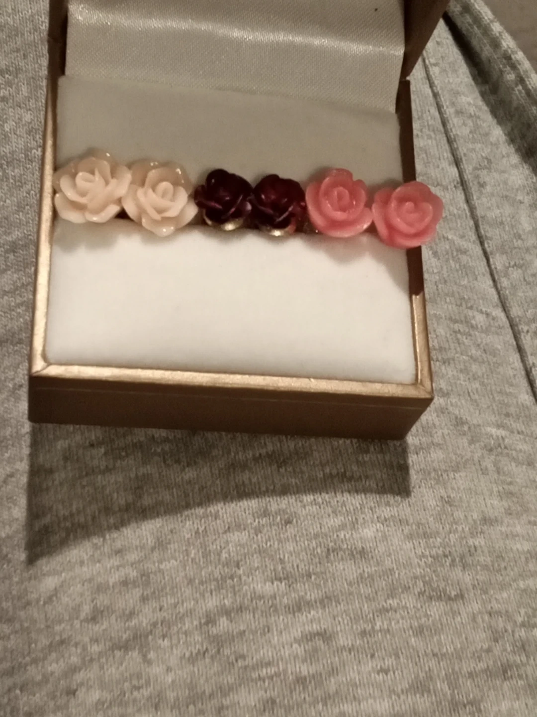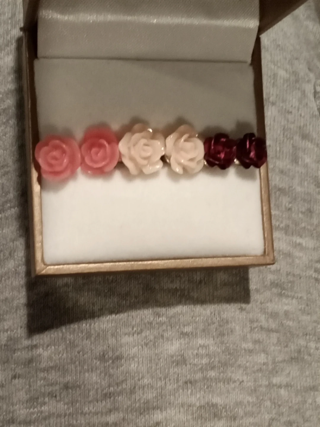 Selling a set of rose flower stud earrings. They come in a variety of colours, including pink, light pink, and burgundy one set is metal , one is ceramic, and the other is coral 2 in silver 1 in Gold . They are New Never Worn and come with a box