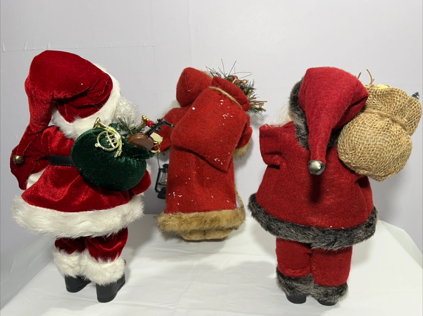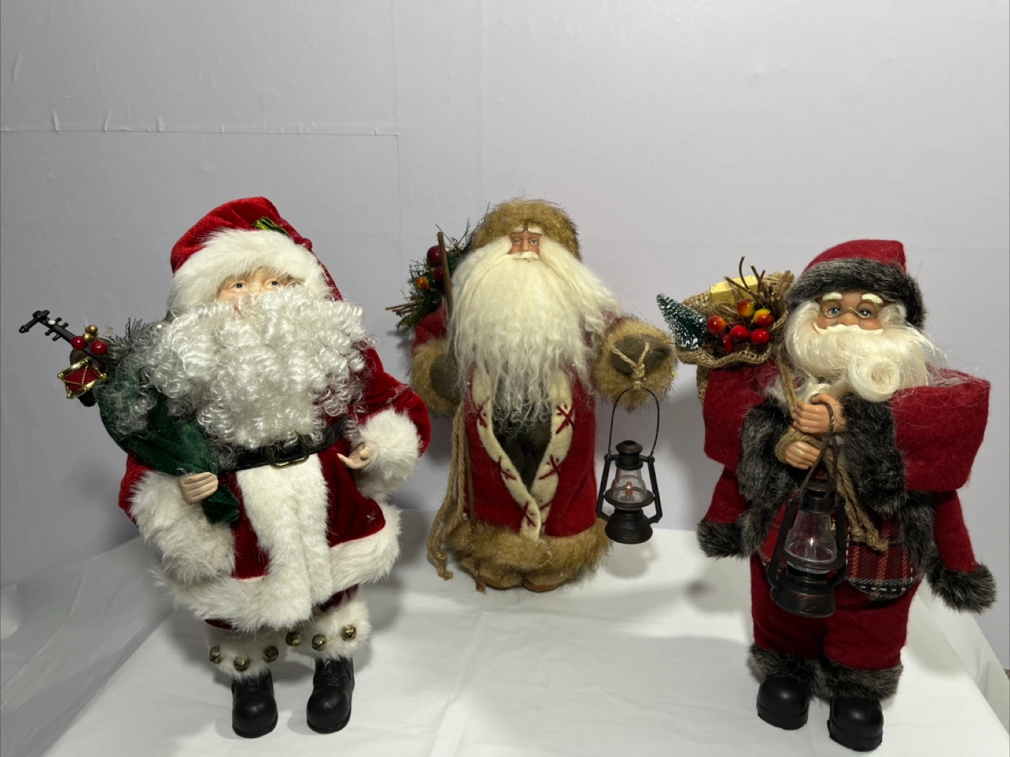 Here are three 12” Tall Santa Claus figurines! They are each dressed in festive outfits and carrying various accessories. They would be a great addition to your holiday decorations
