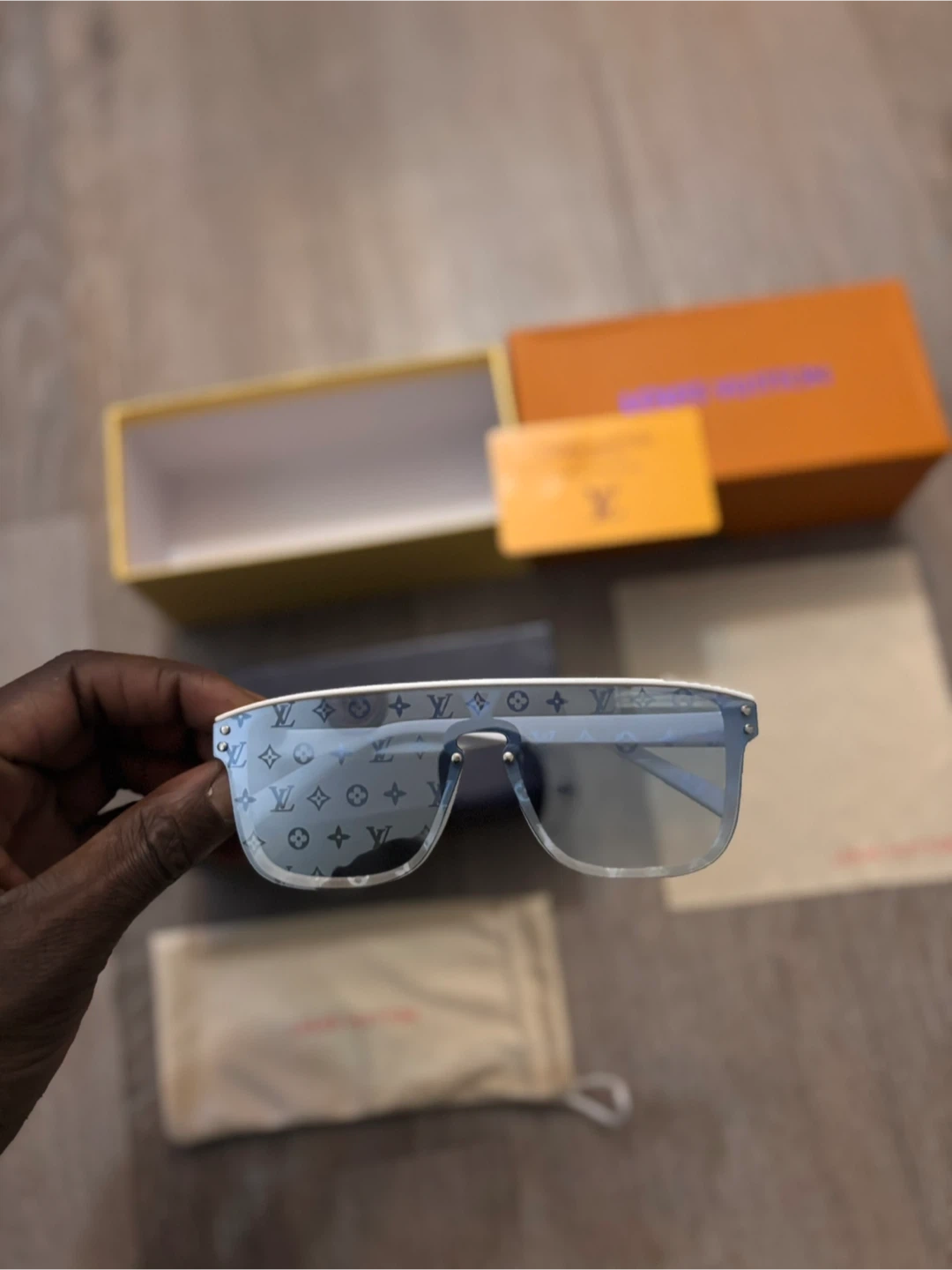 Selling a pair of Louis Vuitton sunglasses with a stylish white frame. They come with the original box and accessories, including a dust bag and cleaning cloth. Perfect for adding a touch of luxury to your look!