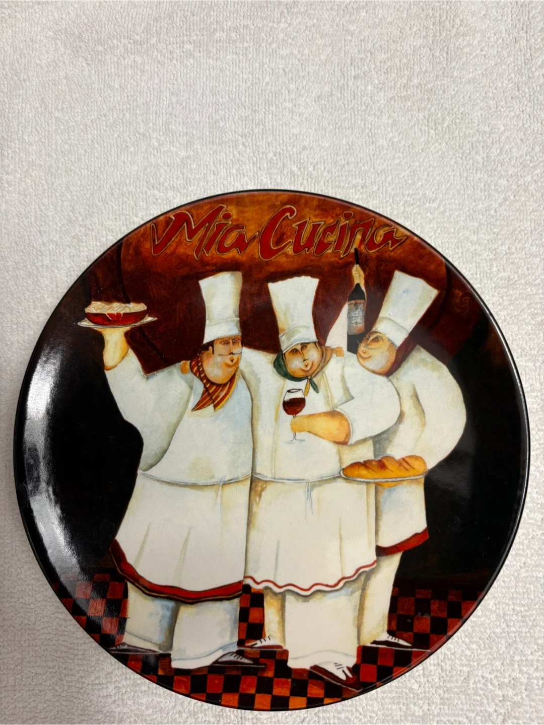 It's dishwasher and microwave safe, for reheating only. This plate features a chef design with the title Mia Cucina at the top. There is a small chip on the left-hand side, which is not noticeable from a distance.