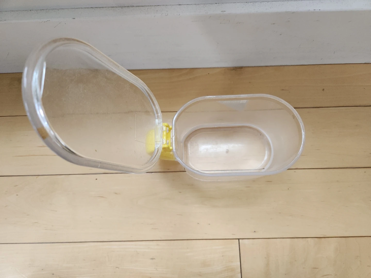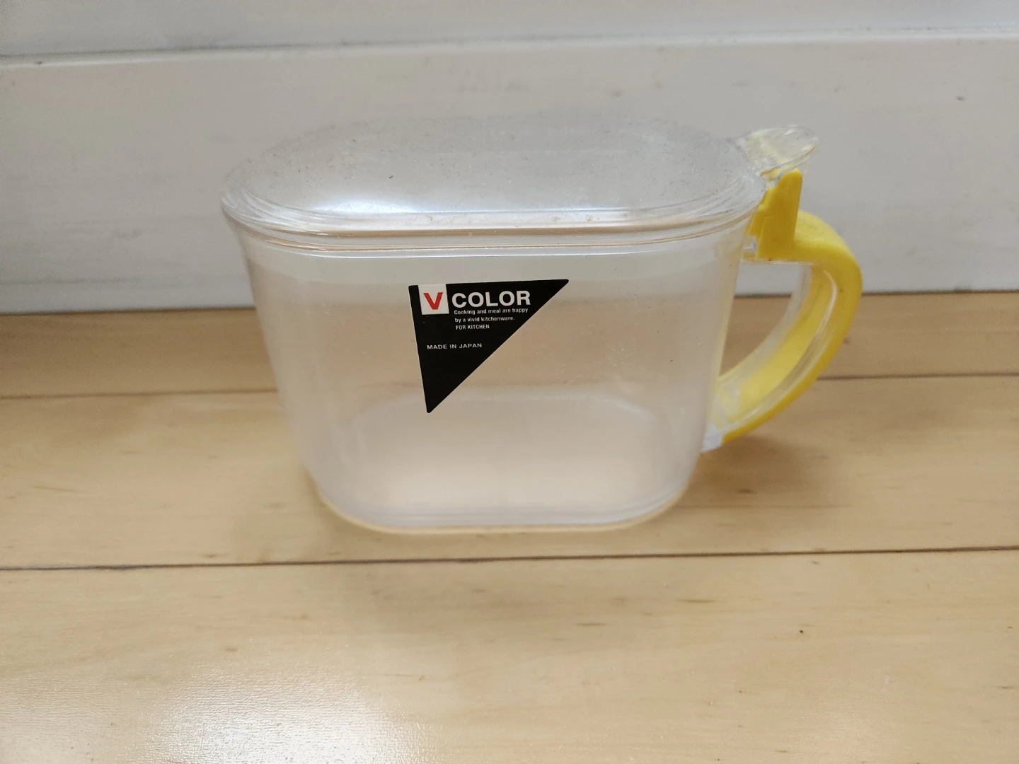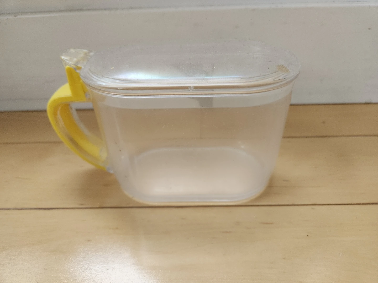 Selling a clear plastic storage container in good condition. It has a wide, bowl-like shape with a flip top lid and yellow handle. Great for storing your cooking essentials. Dimensions: 3" (L) x 5" (W) x 3.5" (H) Volume capacity: 600 mL
