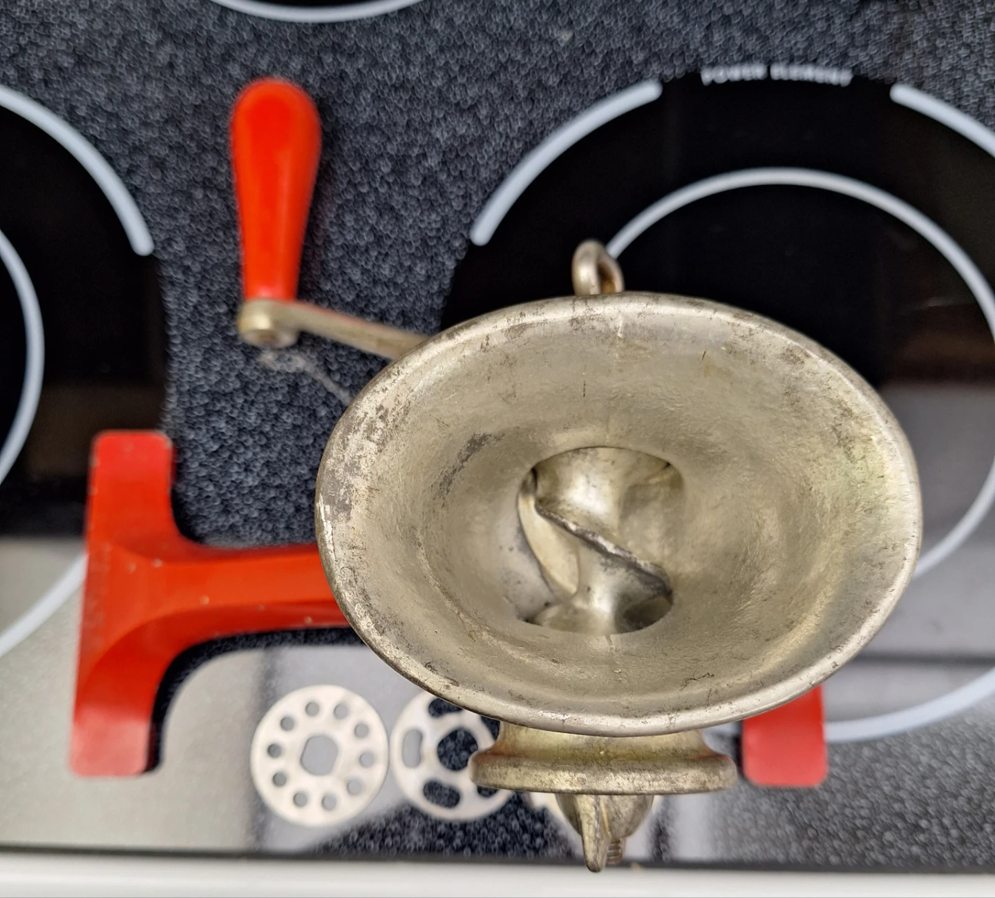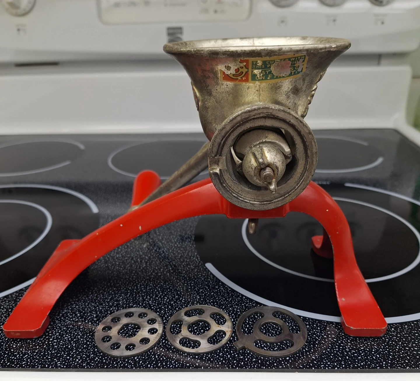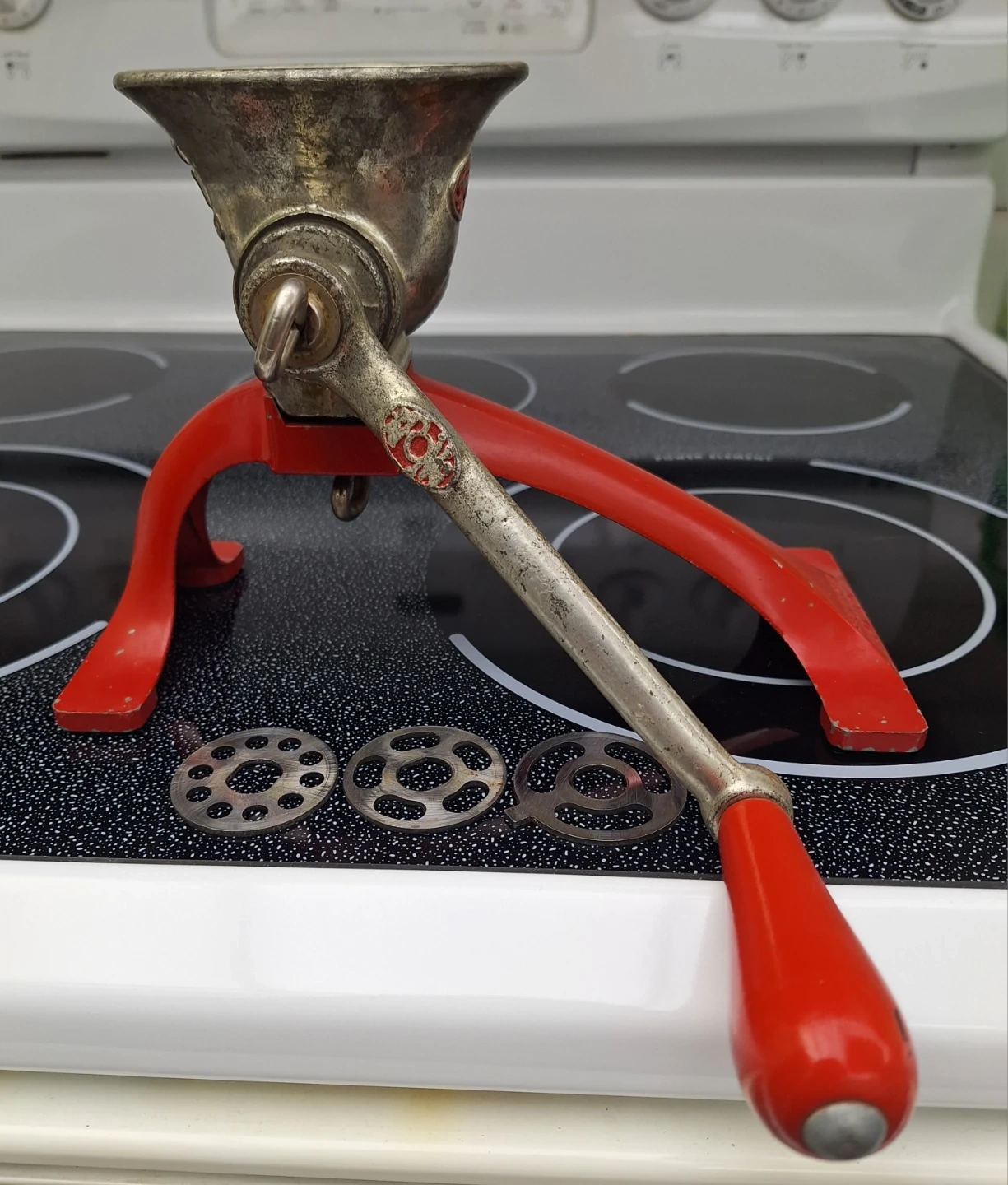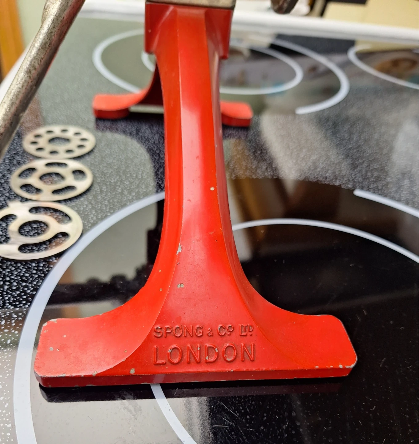 Vintage Cast Iron table top Meat Grinder. Made by Spong & Co. London, England. Includes three different grinding plates.