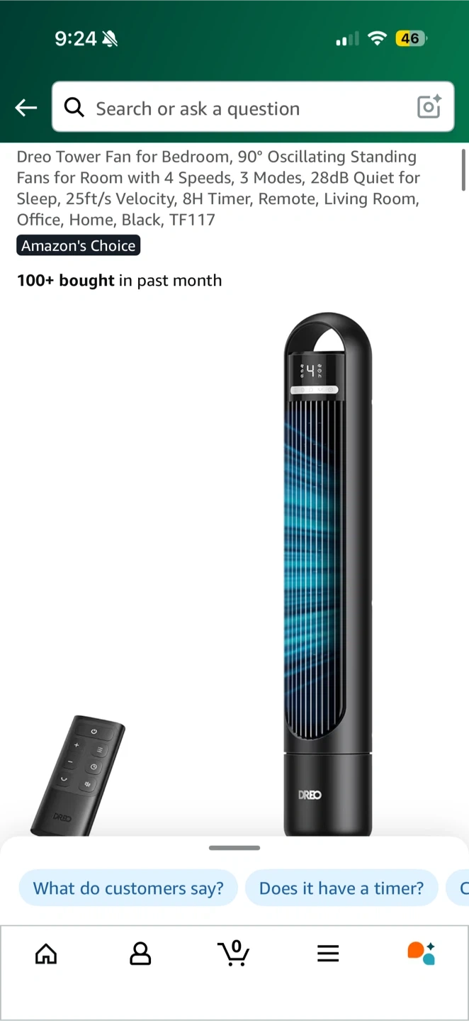Item Name: Dreo Tower Fan for Bedroom, 90° Oscillating Standing Fans for Room with 4 Speeds, 3 Modes, 28dB Quiet for Sleep, 25ft/s Velocity, 8H Timer, Remote, Black, TF117