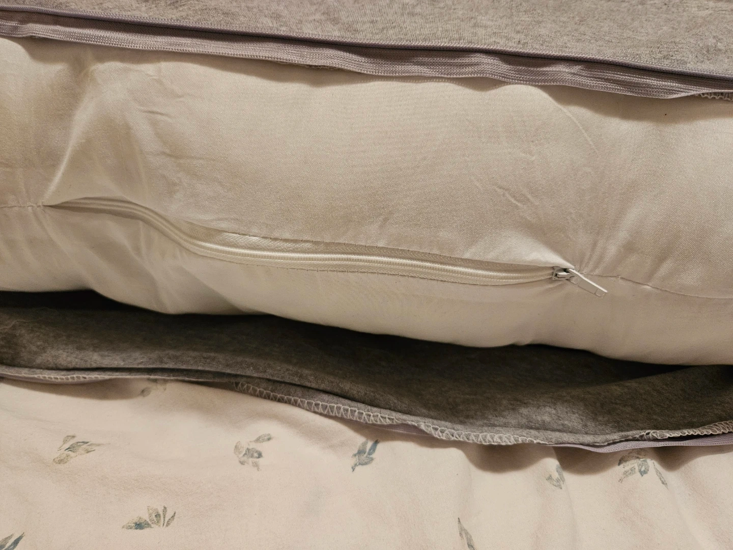 Has zipper for washing and an inner lining also with a zipper to keep the stuffing in place and secure.