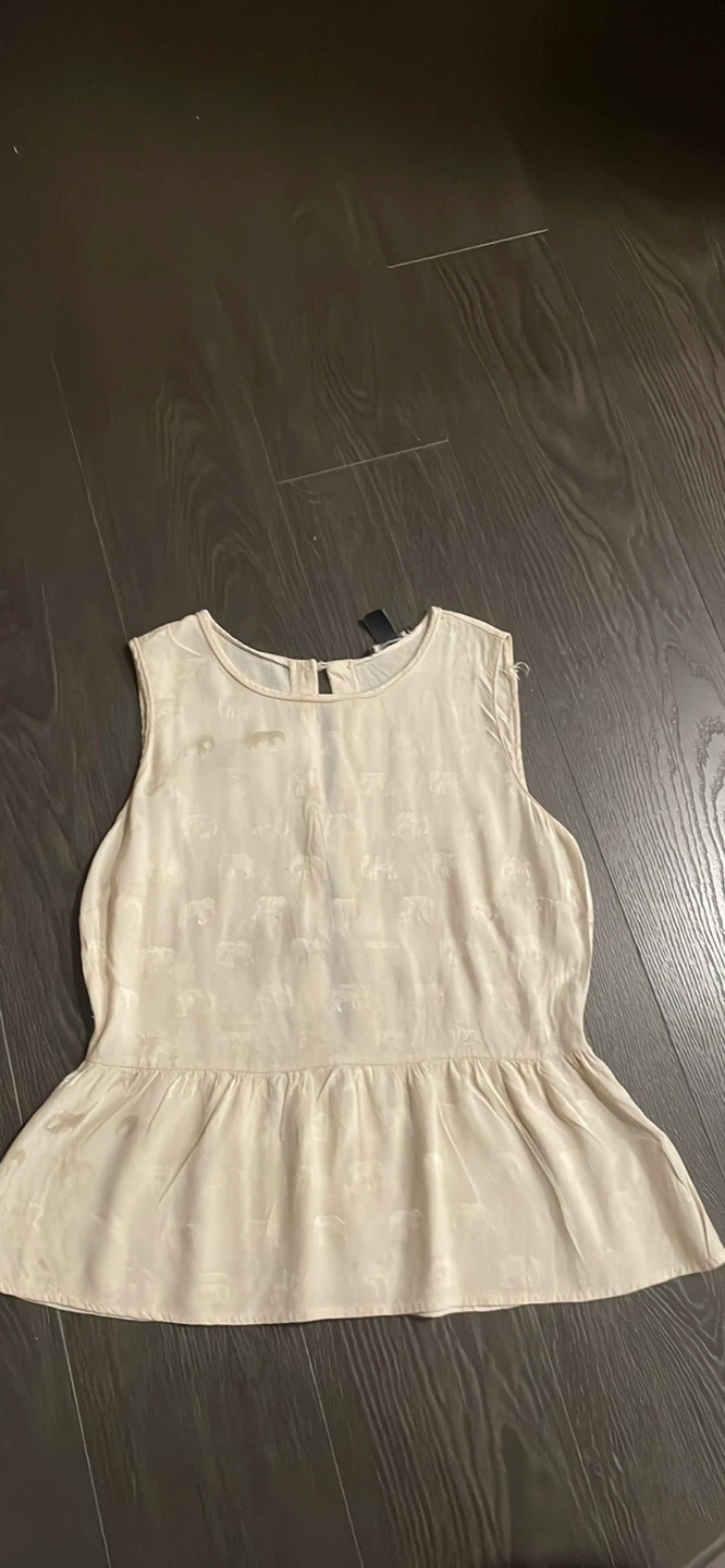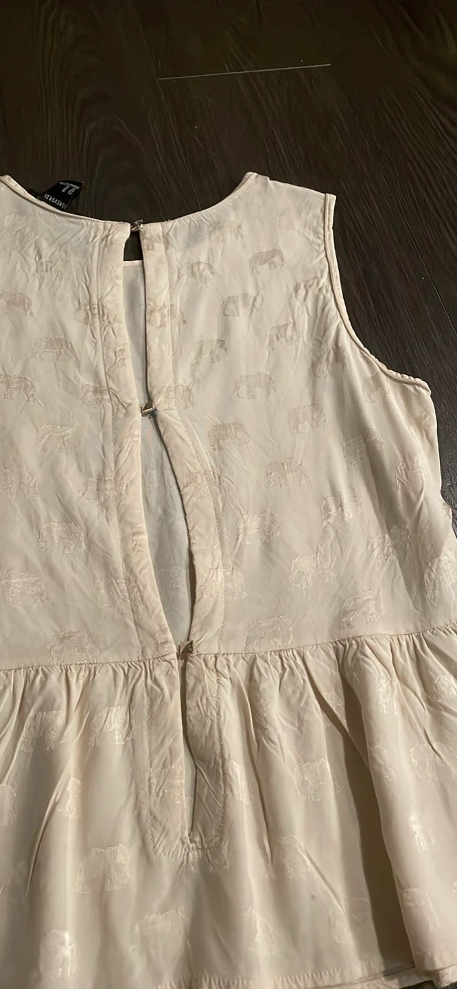 A cute Forever 21 top in size medium! It features a subtle elephant print and a flattering peplum style. The colour is a soft ivory. Perfect for a casual day out or dressing up for a night out