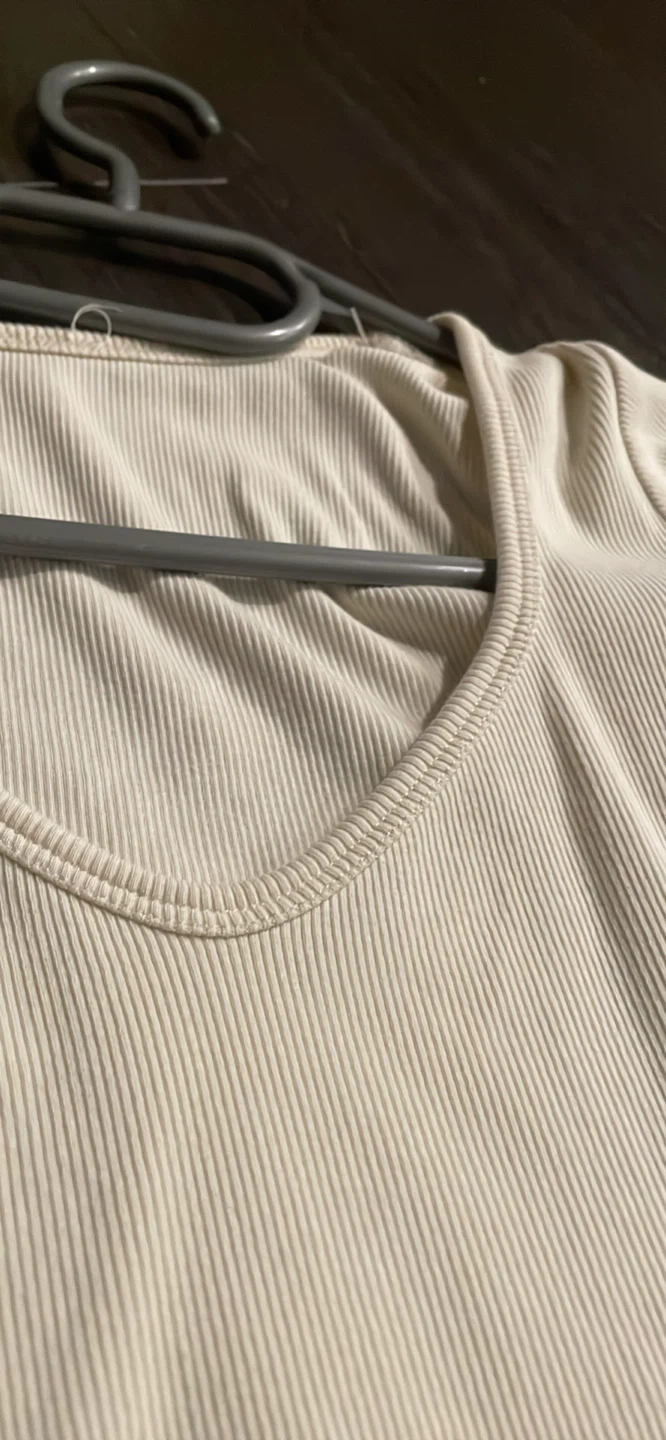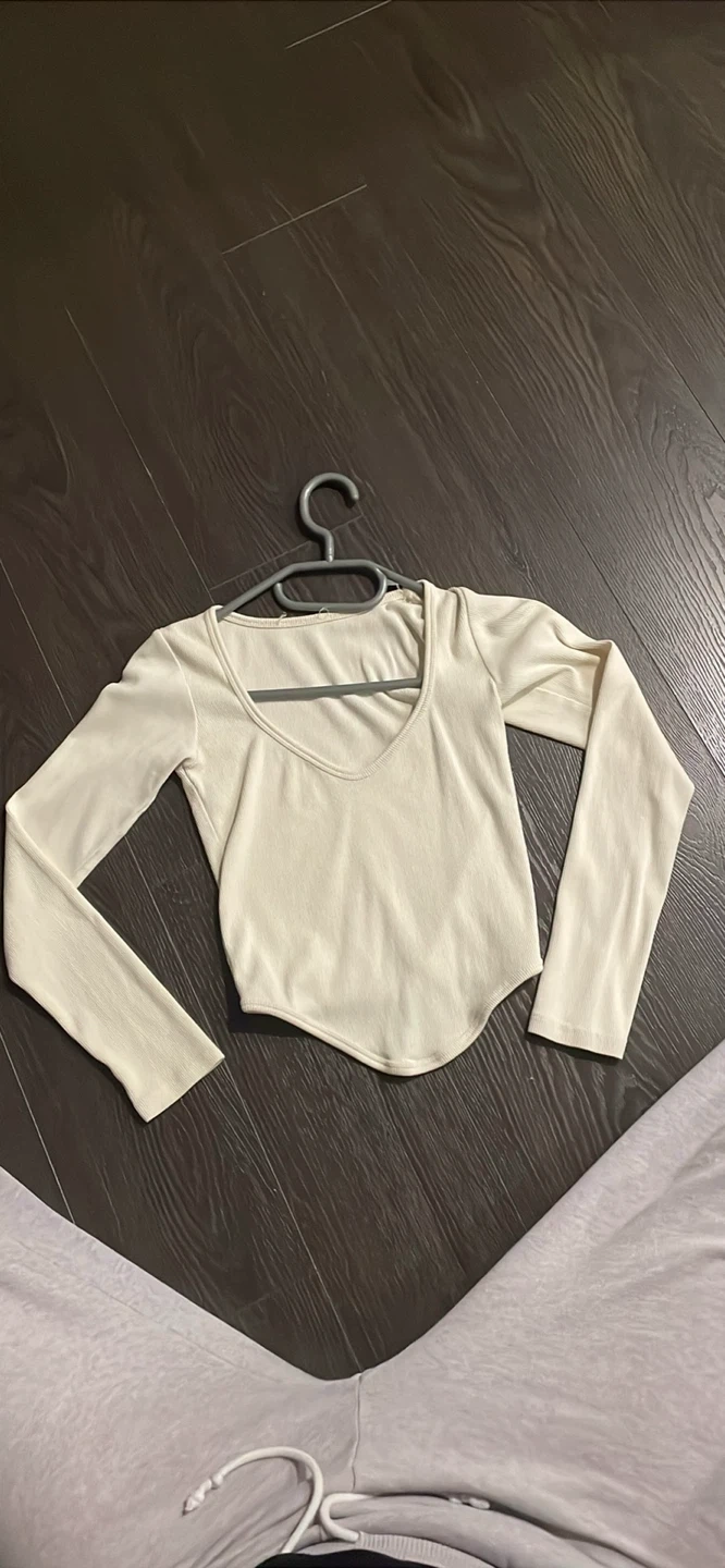 Selling a cream-coloured ribbed long sleeve top. It's in great condition and perfect for layering or wearing on its own! The ribbed texture adds a nice touch, and the long sleeves make it versatile for different seasons