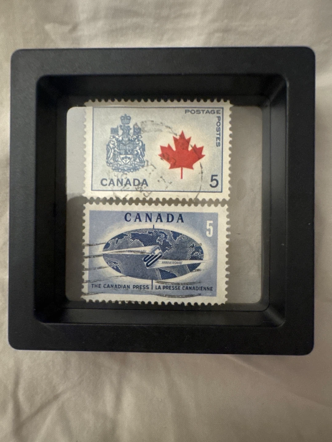 Here's a set of two vintage Canadian stamps, framed & in good condition for their age.