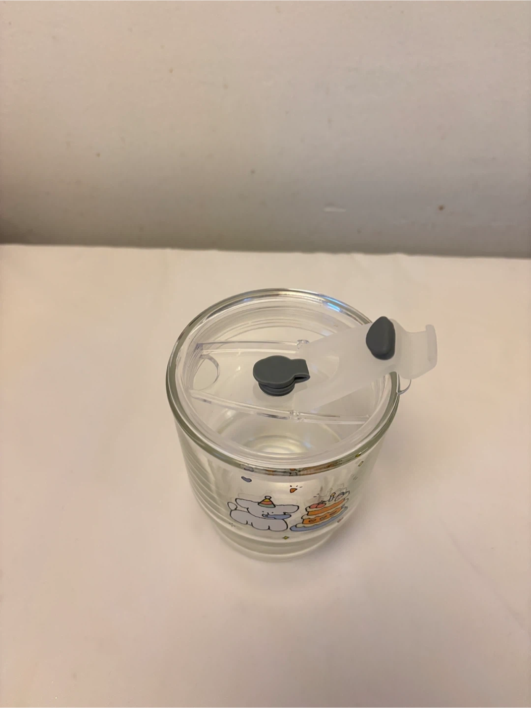 I'm selling a cute glass cup. It comes with a lid and straw; the lid is brand new. The glass cup and straw were used but have no signs of use.