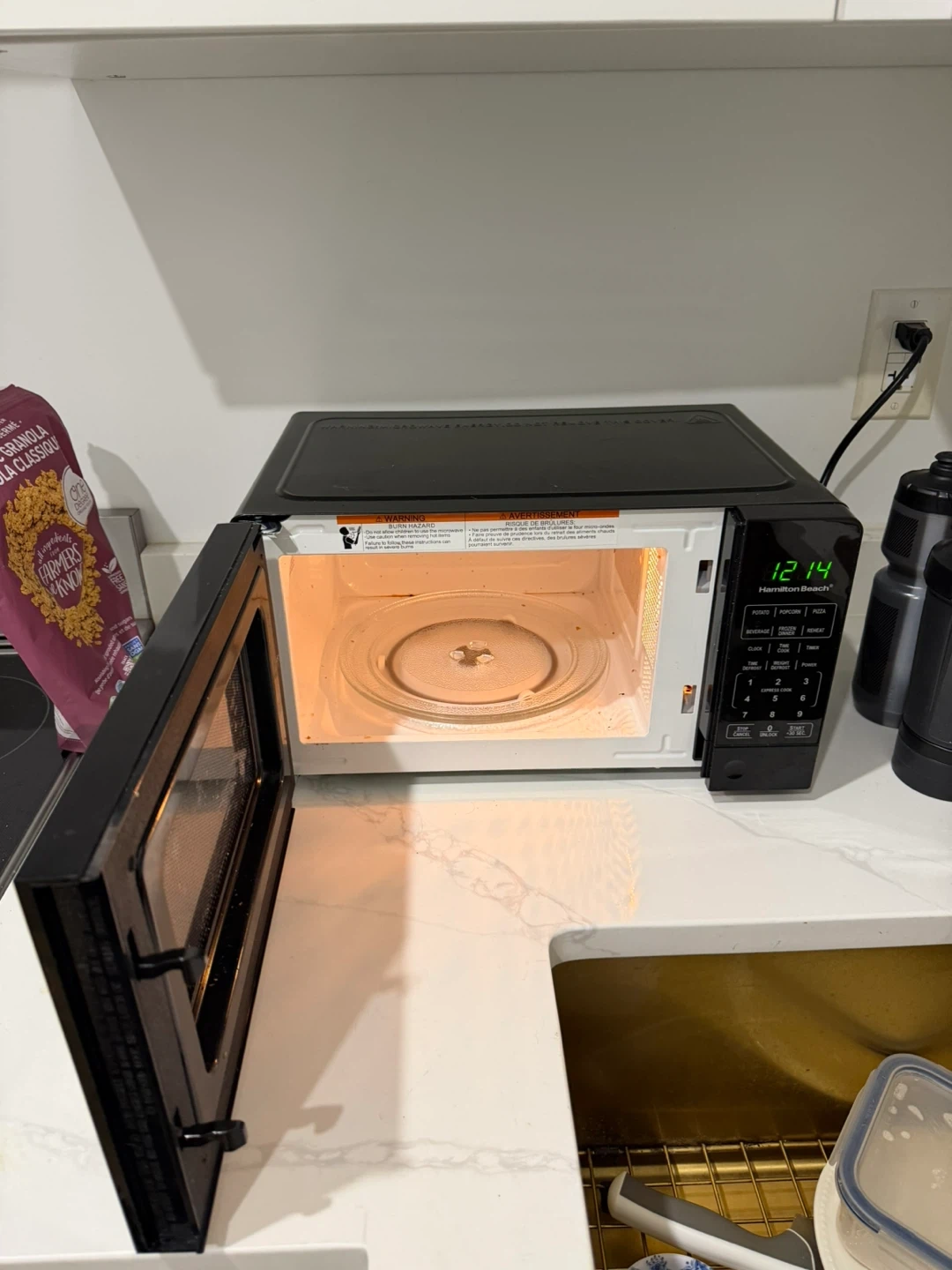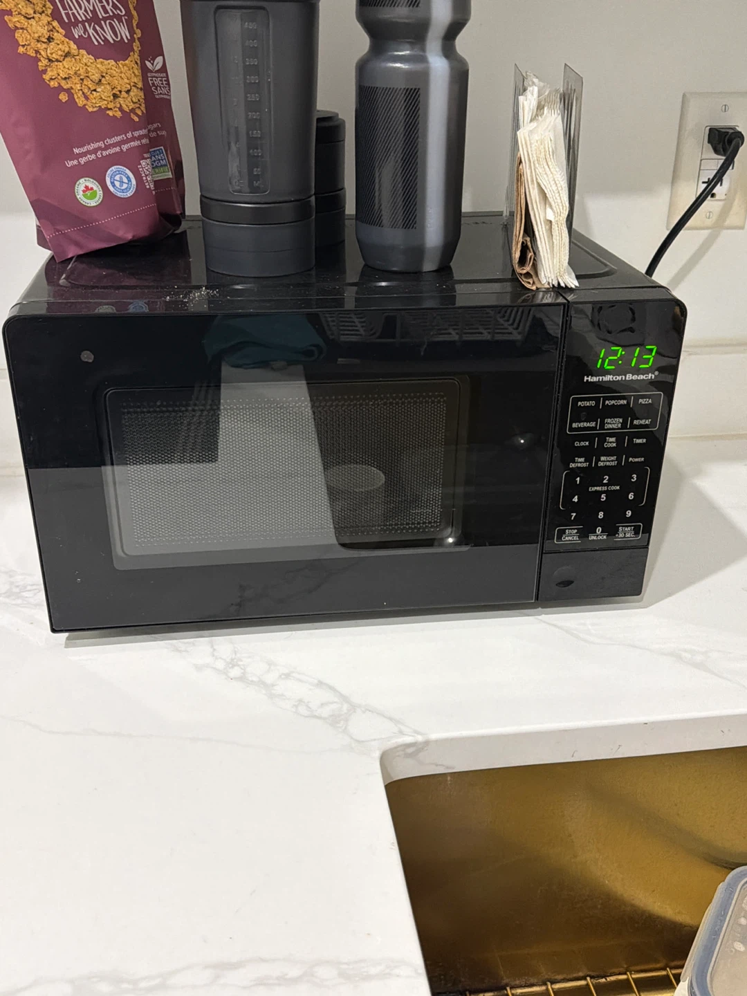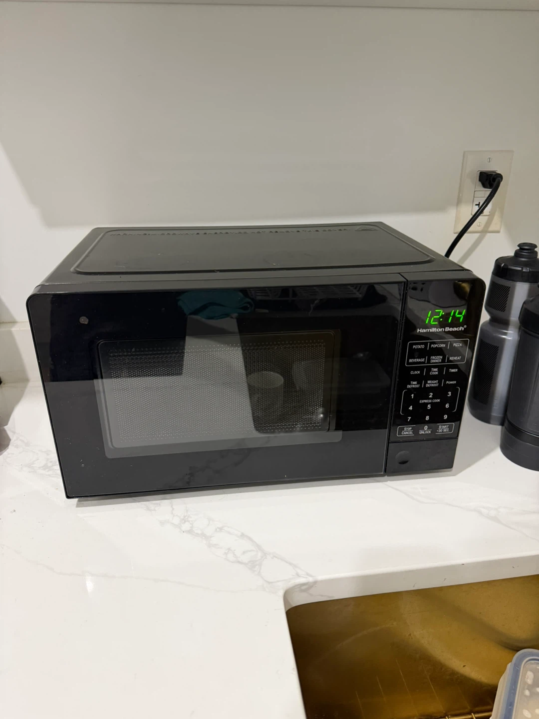 Selling a Hamilton Beach microwave in black. It's in good working condition and ready for a new kitchen. It has various settings for beverages, popcorn, pizza, and more. Perfect for quick meals and reheating!