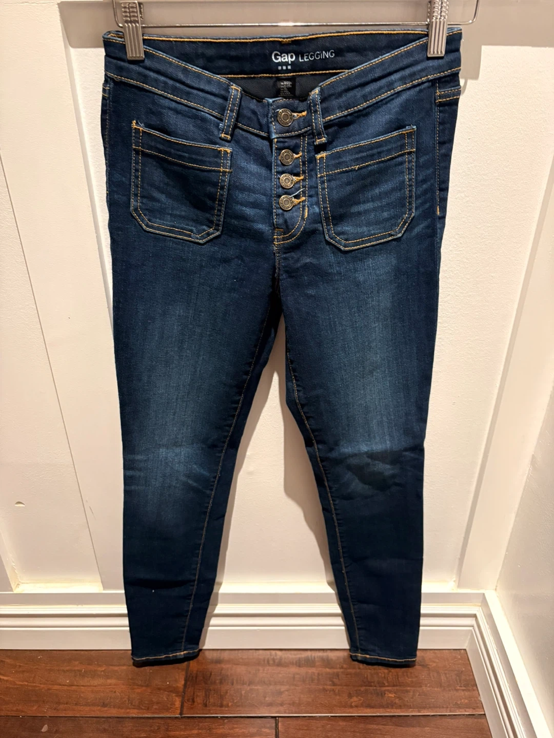 Selling a pair of Legging jeans! They're a dark wash and have unique button detailing. Great for everyday wear!