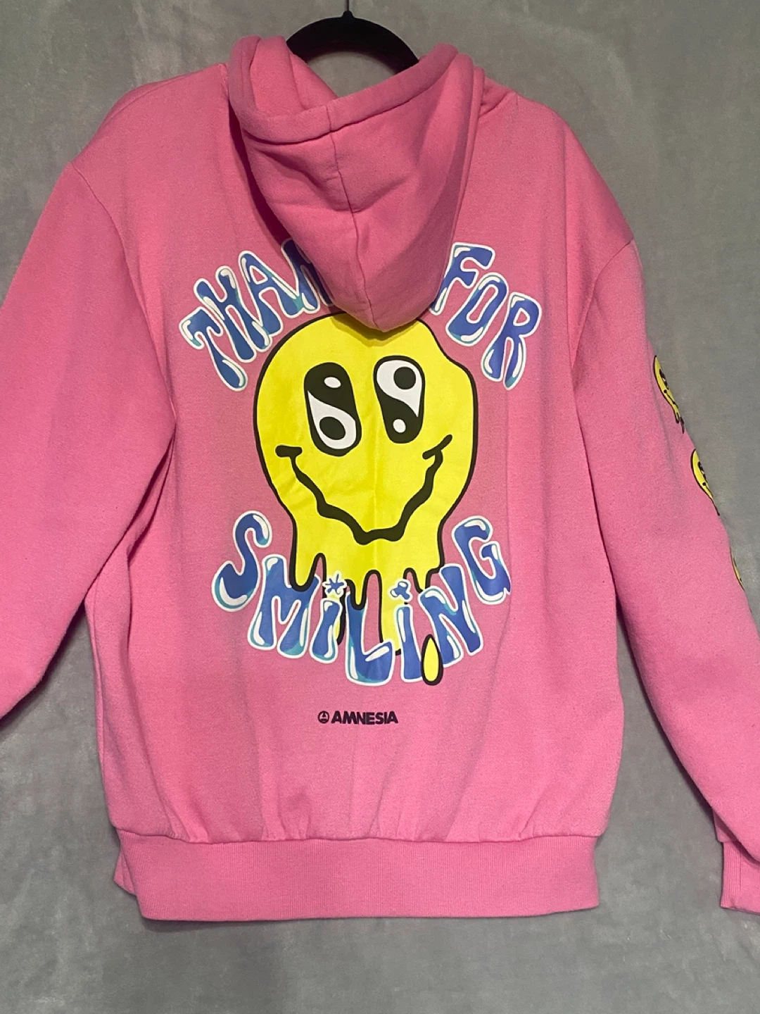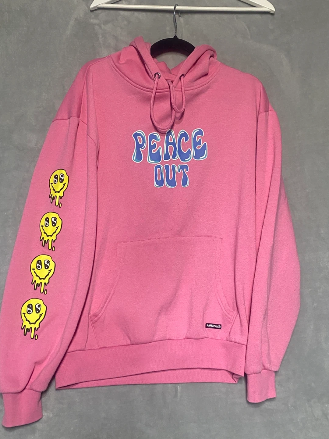 Selling a pink Amnesia hoodie, size large! It has a fun design on the back that says "Thanks for Smiling" and "Peace Out" on the front. The sleeves also have a cool smiley face design. Perfect for adding a pop of colour to your wardrobe!