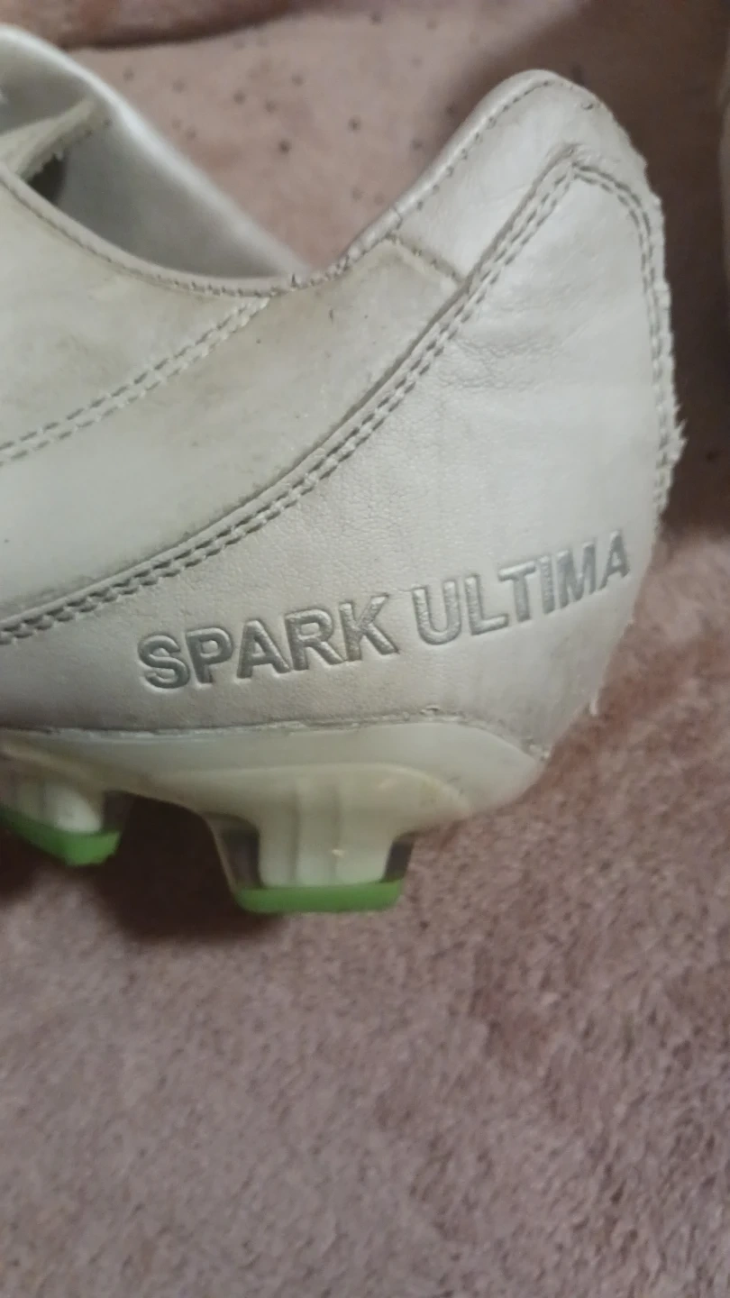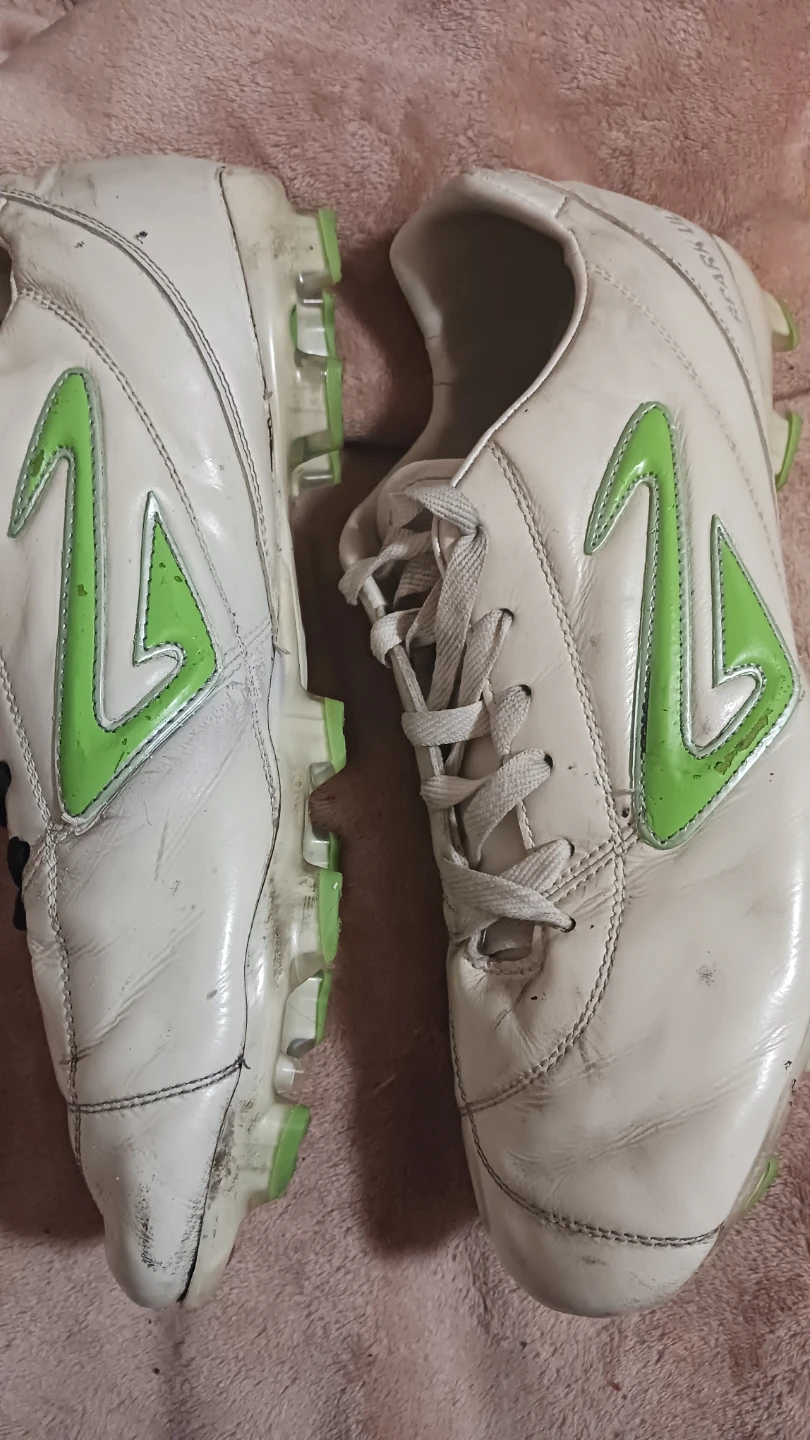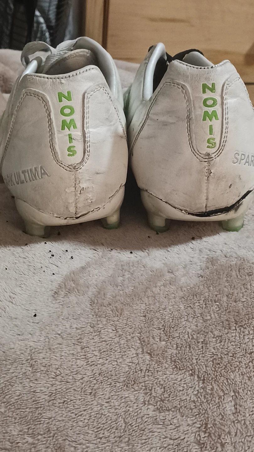 Giving away a pair of Nomis Spark Ultima soccer cleats. They are white with green accents and show some signs of wear from use on the field and black shoe glue, but all is secure. Please see photos for details, last one shows before & after some TLC. Originally sells for $35.