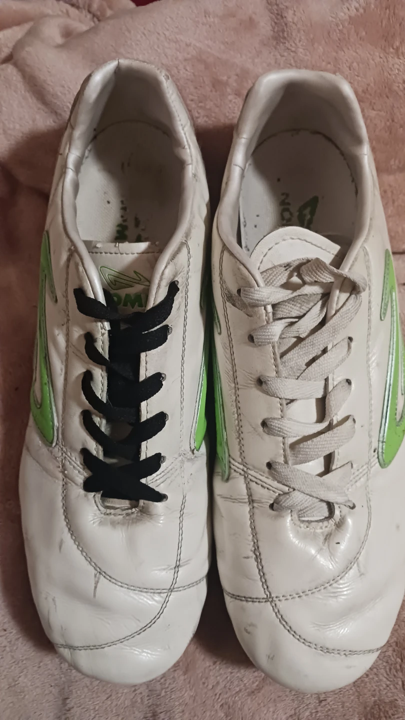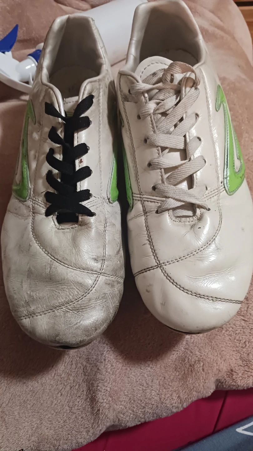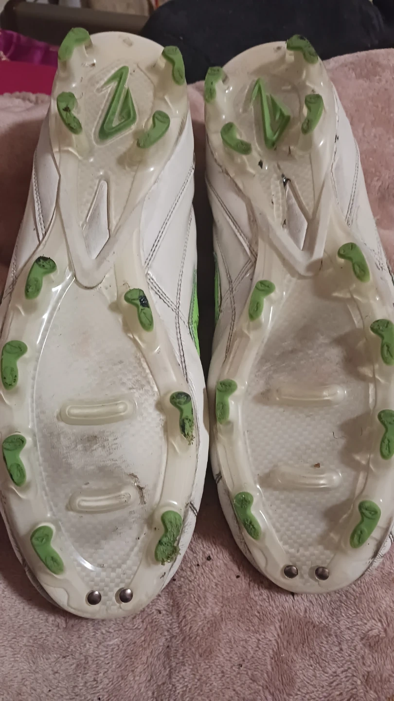 Giving away a pair of Nomis Spark Ultima soccer cleats. They are white with green accents and show some signs of wear from use on the field and black shoe glue, but all is secure. Please see photos for details, last one shows before & after some TLC. Originally sells for $35.