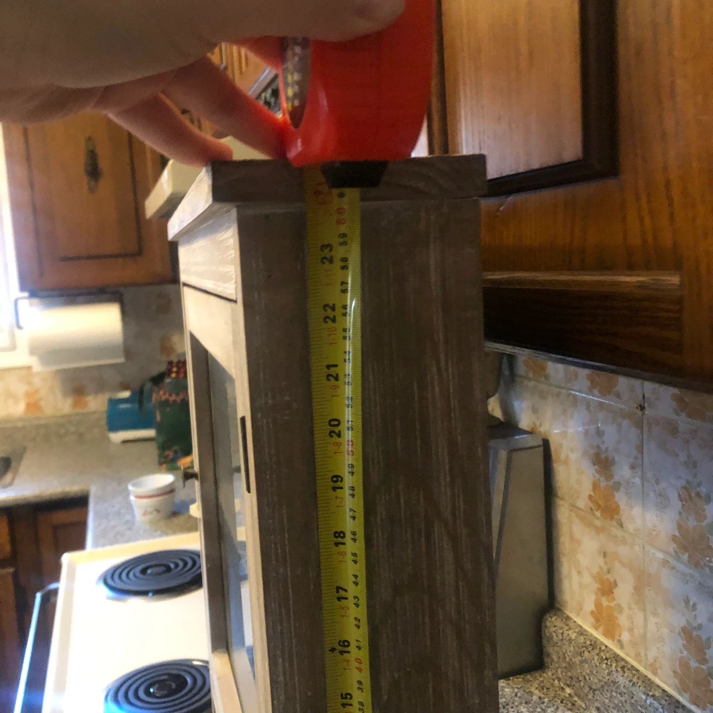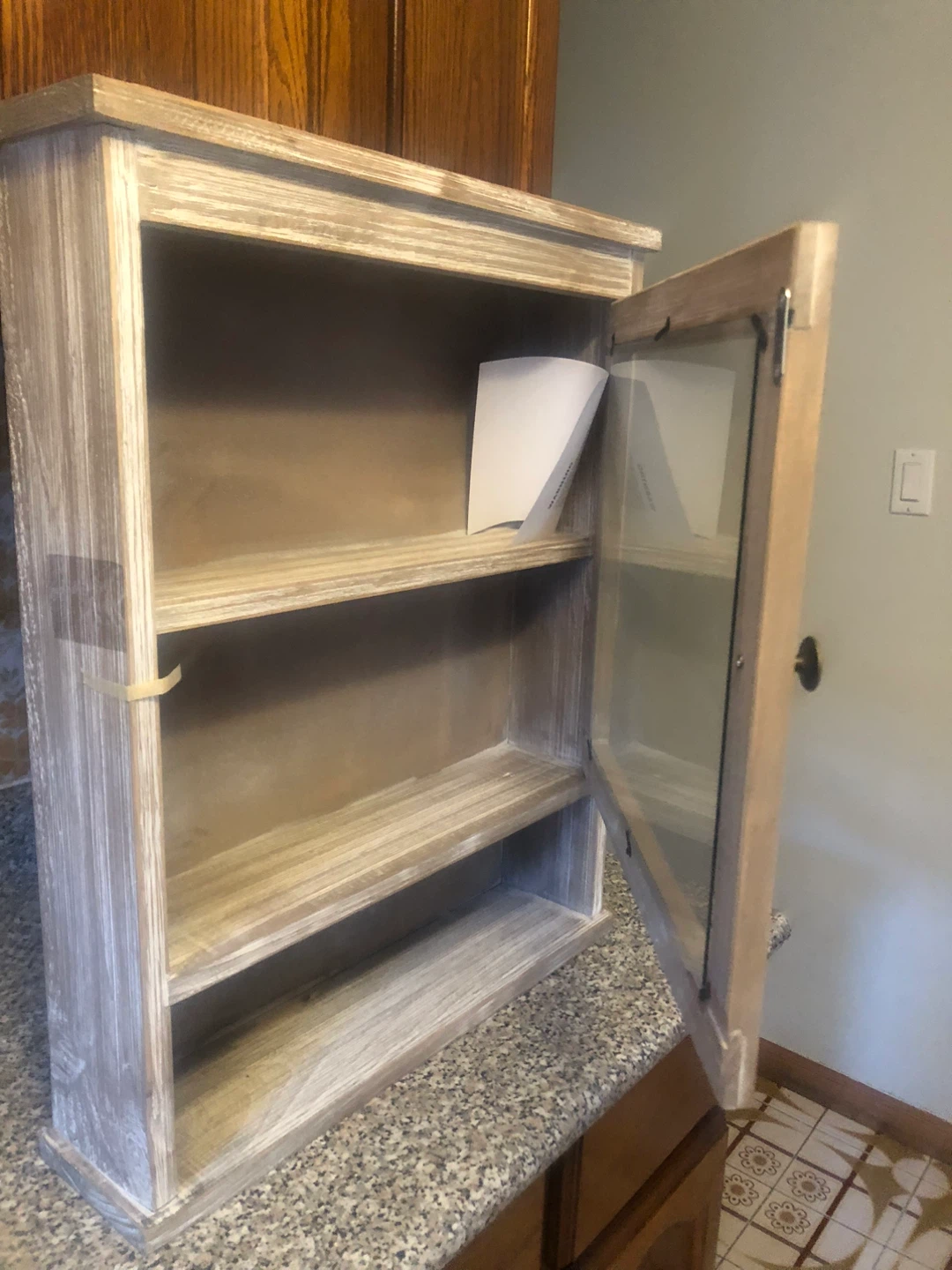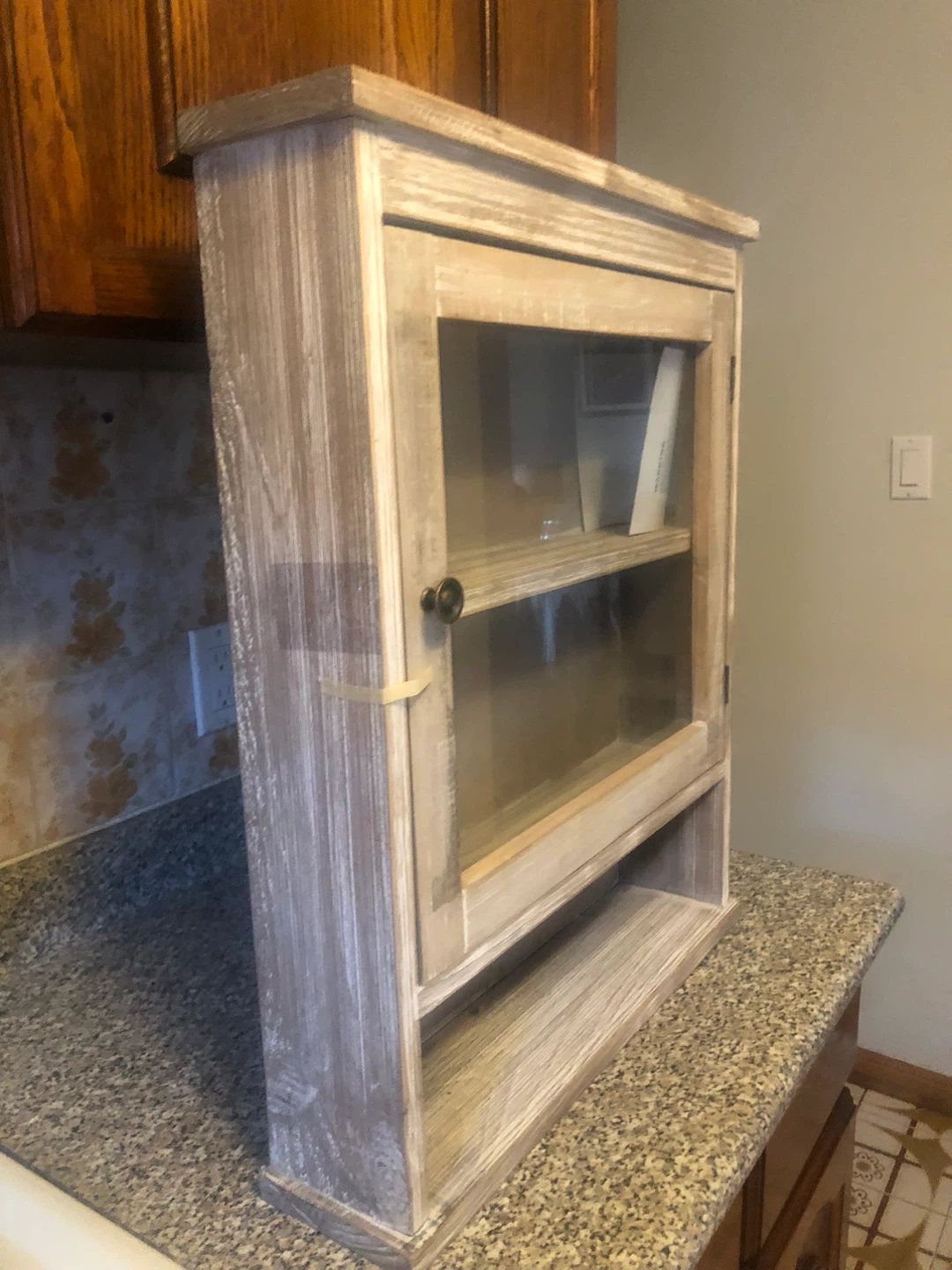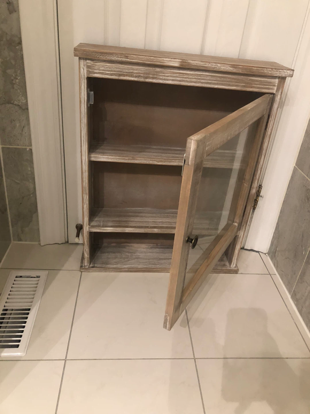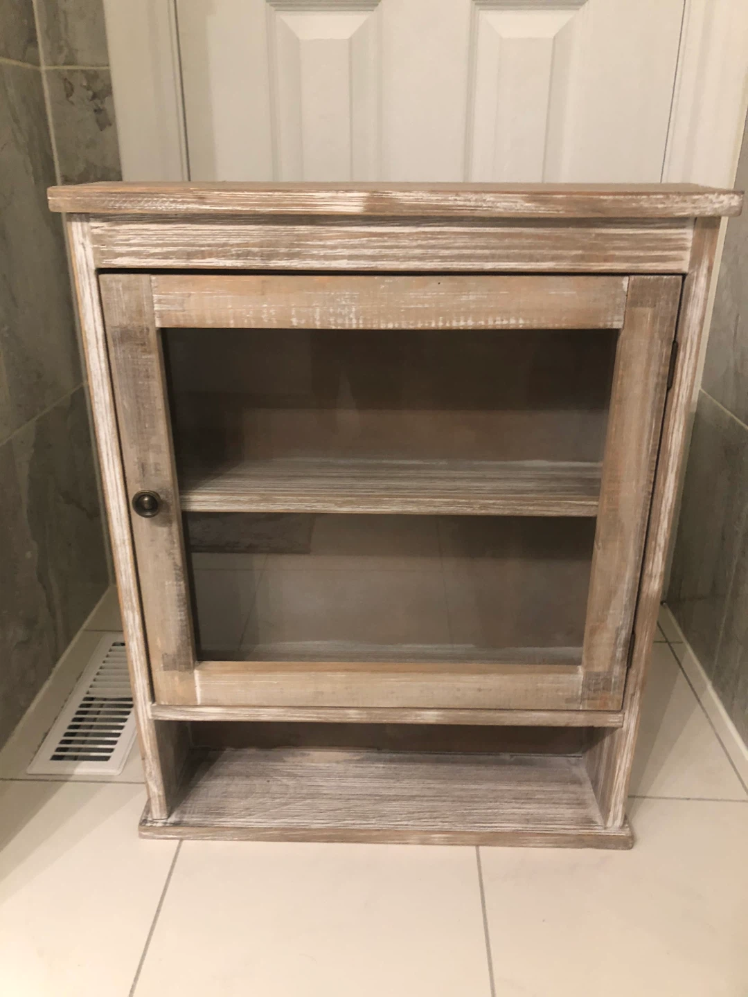 Selling a cute wooden wall cabinet! It has a glass door and a shelf underneath. It's in good condition and would be perfect for a bathroom or kitchen