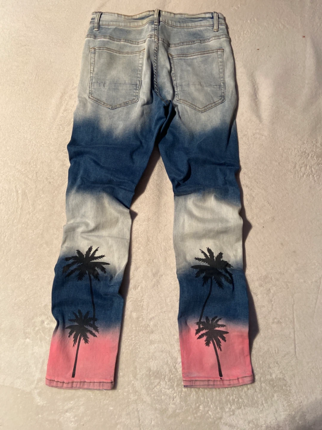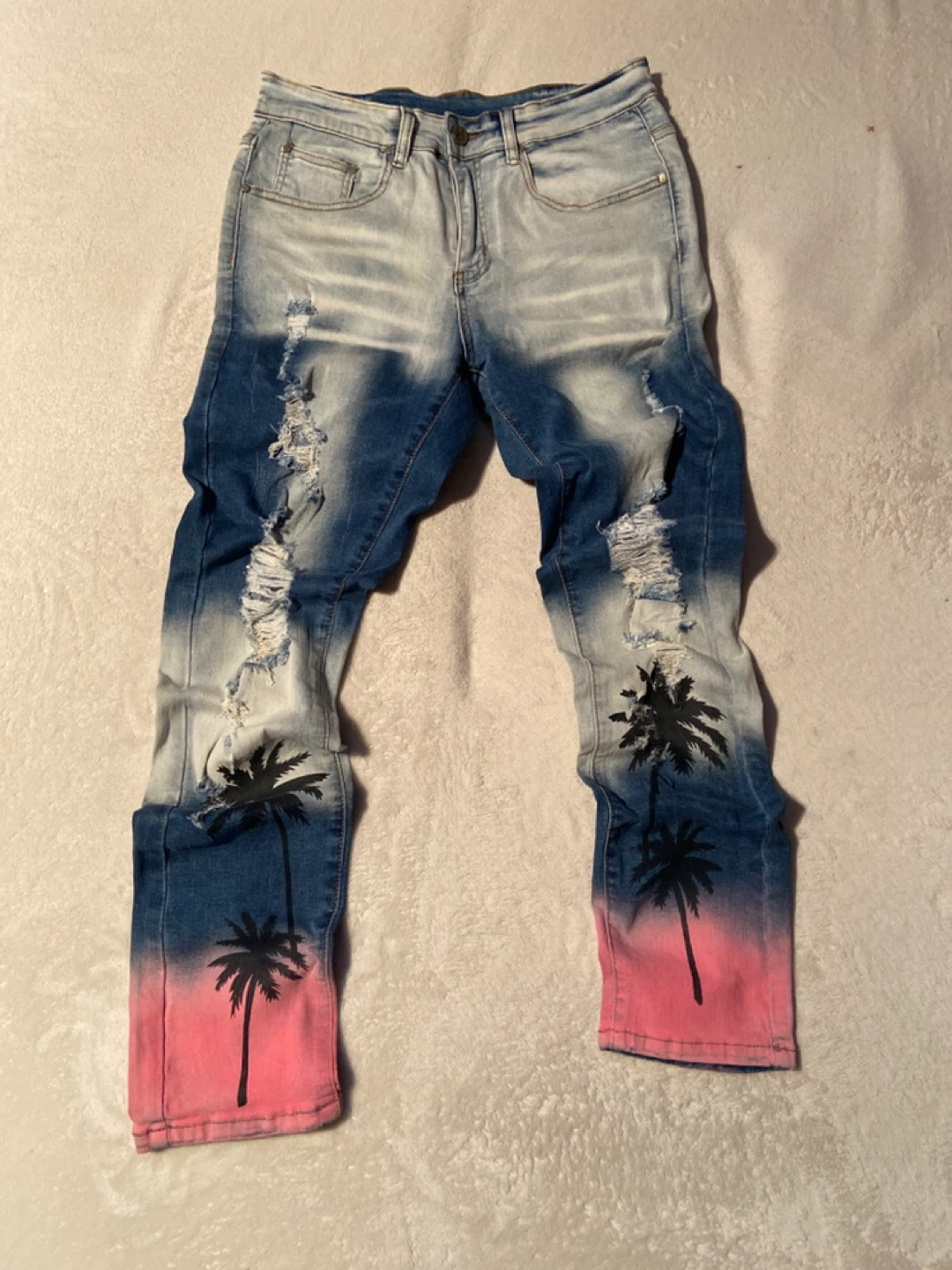 These jeans have a unique distressed look with a cool palm tree design. They're perfect for adding a bit of flair to your wardrobe!