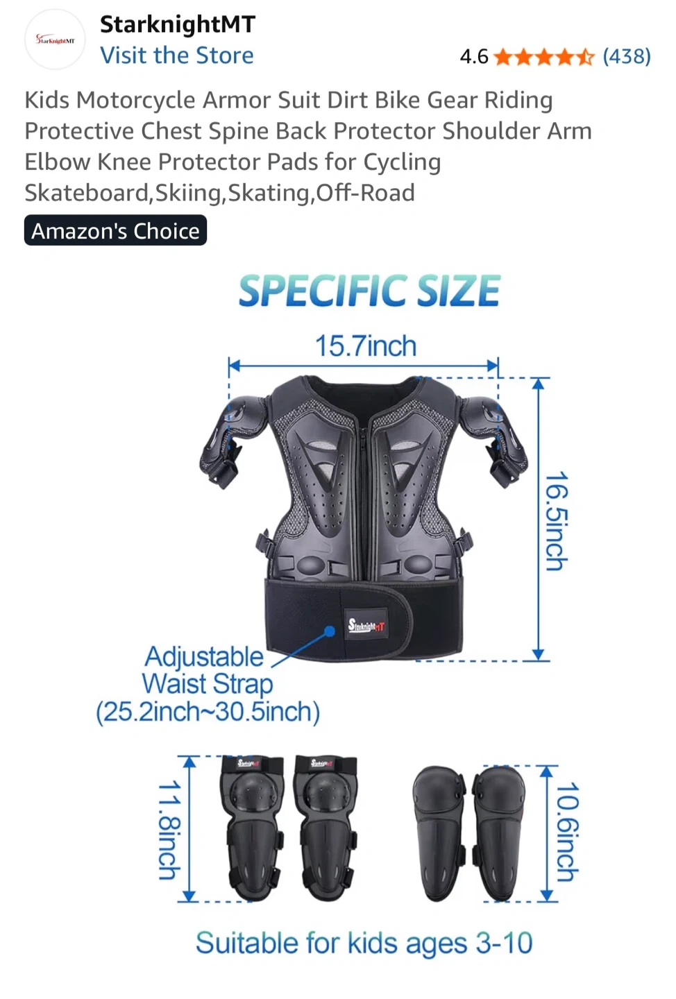 StarknightMT Kids Motorcycle Armor Suit Dirt Bike Gear Riding Protective Chest Spine Back Protector Shoulder Arm Elbow Knee Protector Pads for Cycling Skateboard,Skiing,Skating,Off-Road