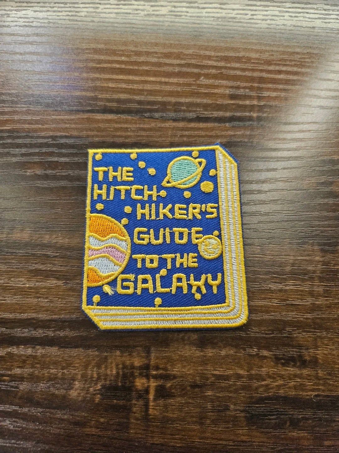 Selling a patch that says "The Hitchhiker's Guide to the Galaxy" with a cool design! It's in great condition and would look awesome on a jacket or backpack