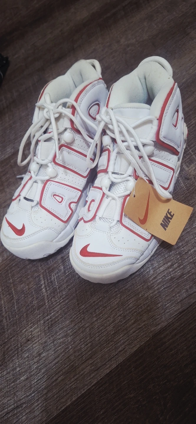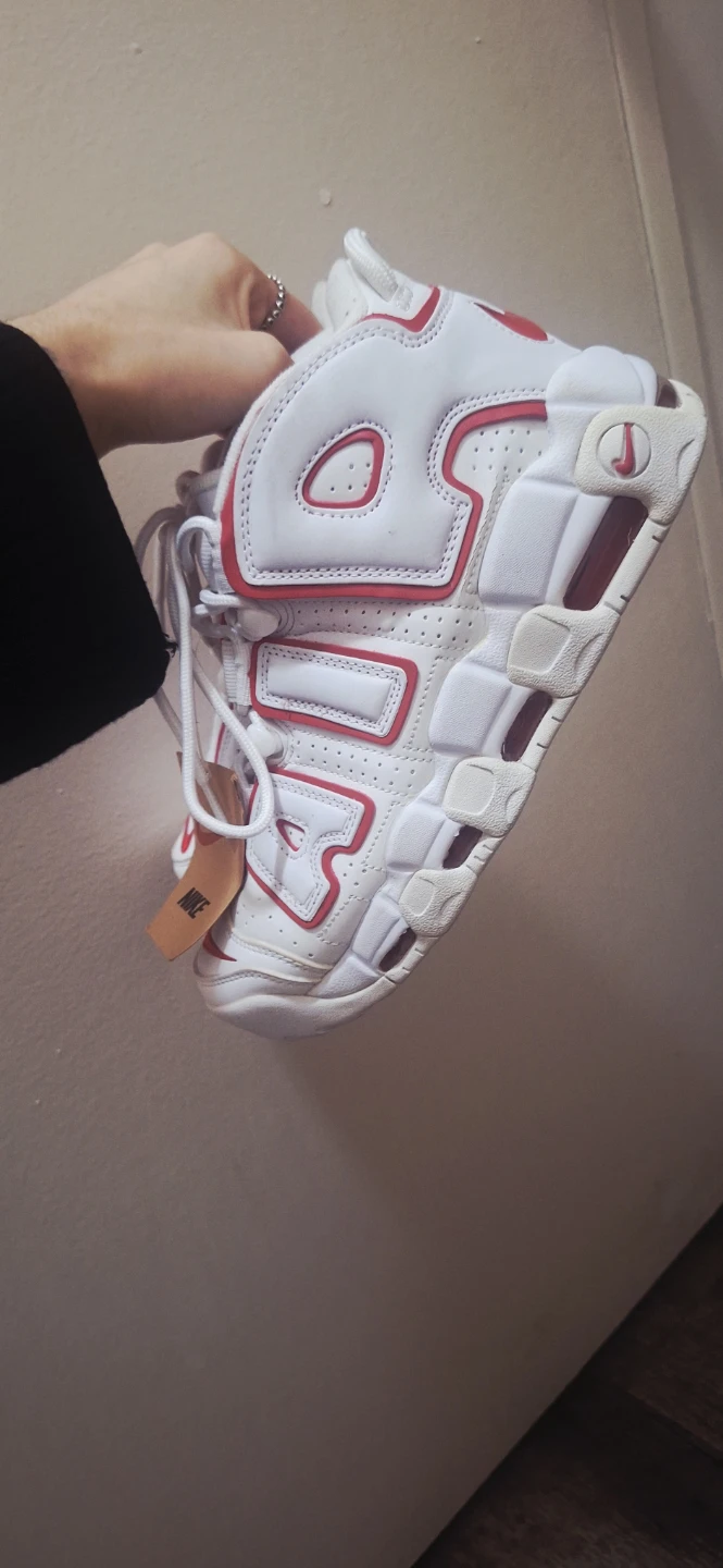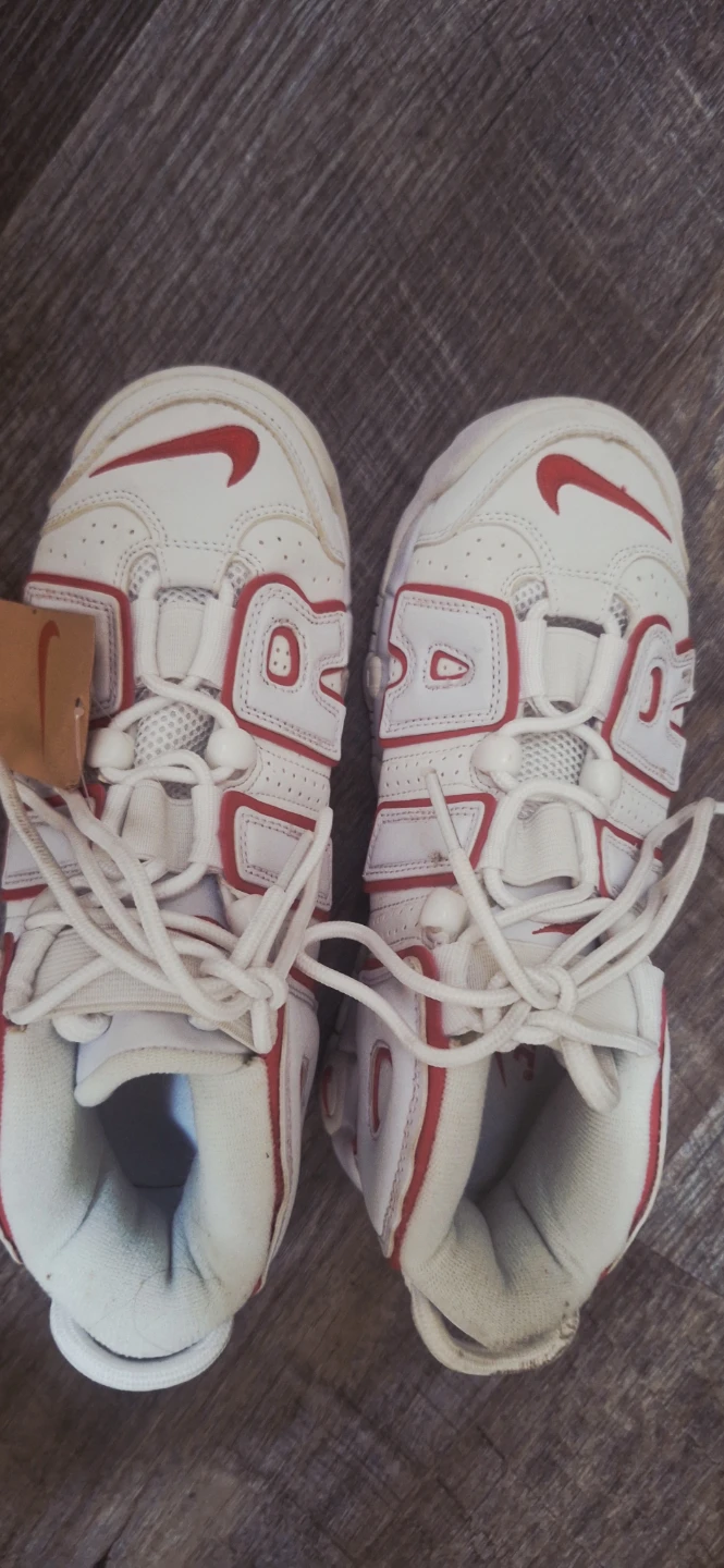 Selling a pair of Nike Air More Uptempo shoes in white and red. They are in good condition and ready for a new owner