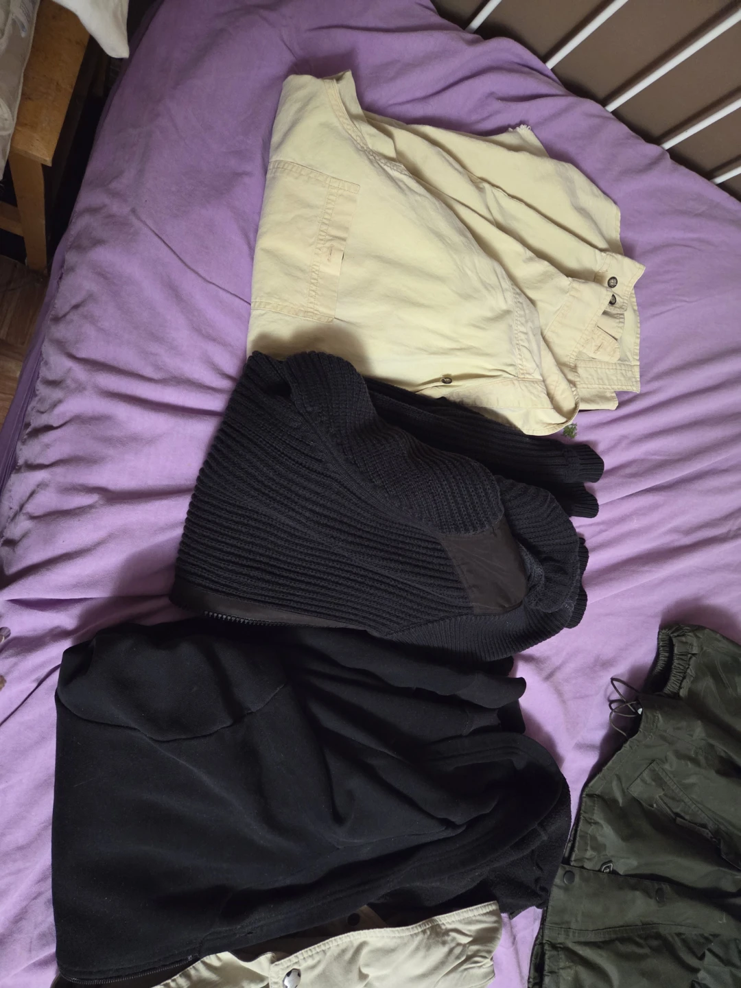 Selling a bundle of assorted clothing items. Includes a yellow shirt, black sweater, and a black jacket. All in good condition!