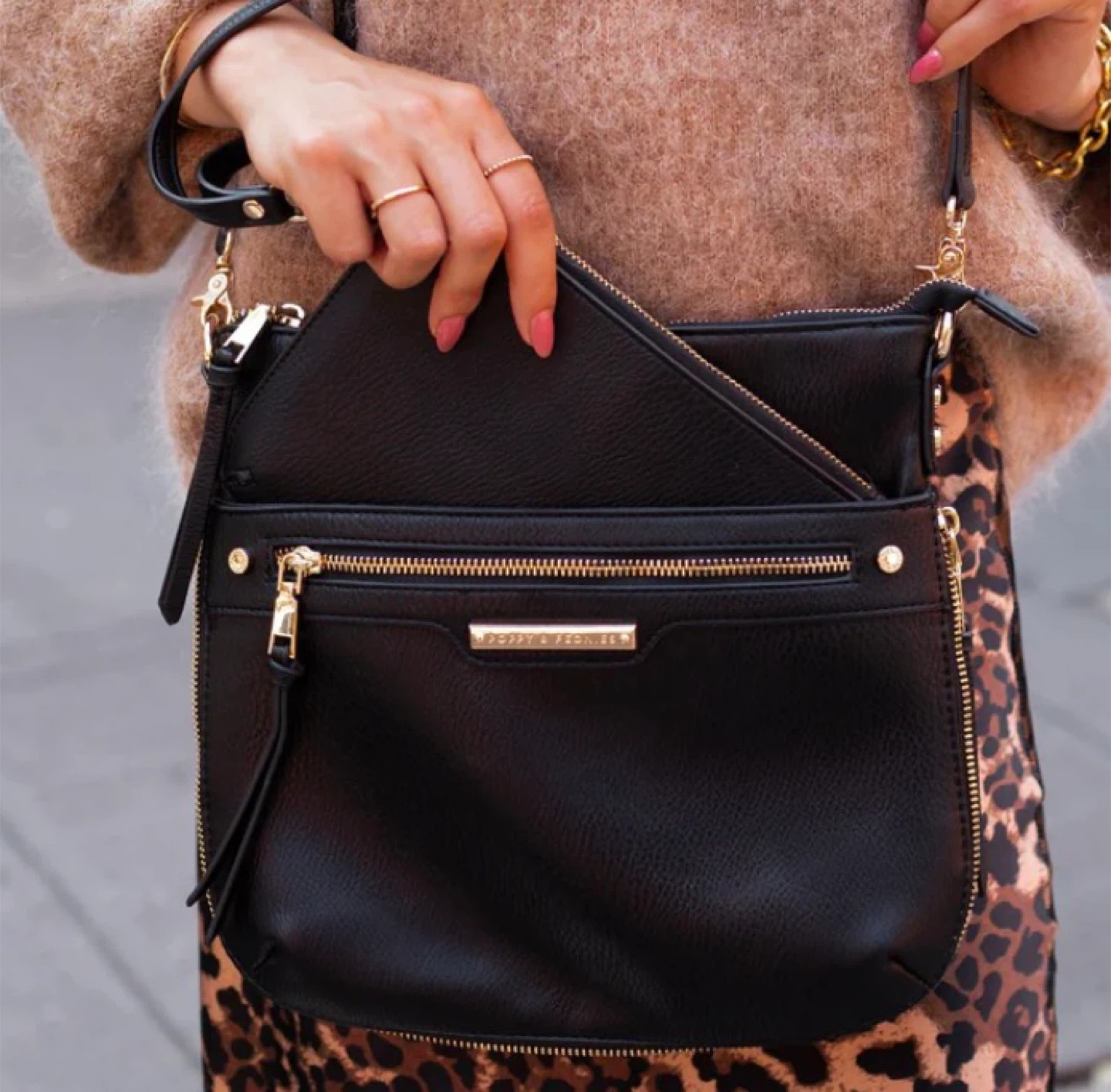 Selling a stylish black crossbody bag from Poppy & Peonies! It's Brand and comes with its original pink dust bag. The bag features gold-tone hardware and multiple zippered compartments for easy organization. Perfect for everyday use!