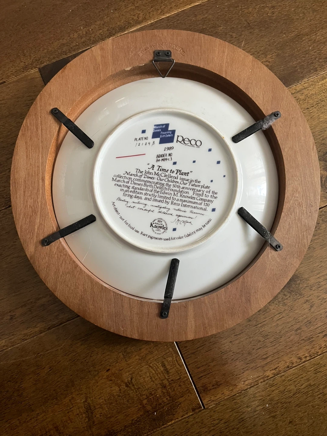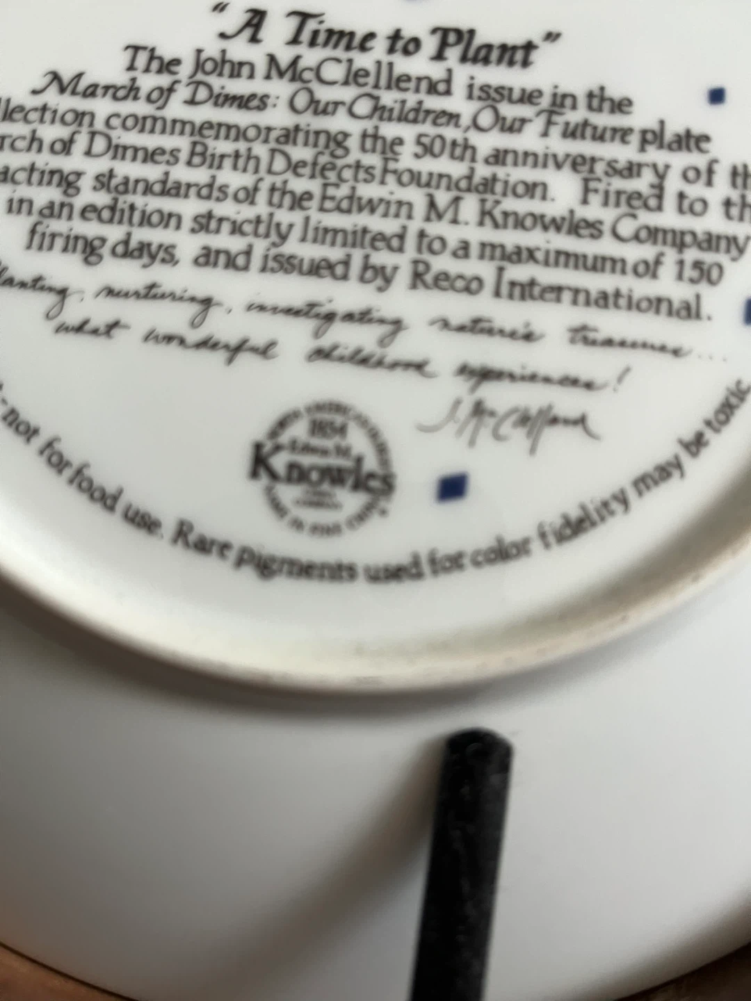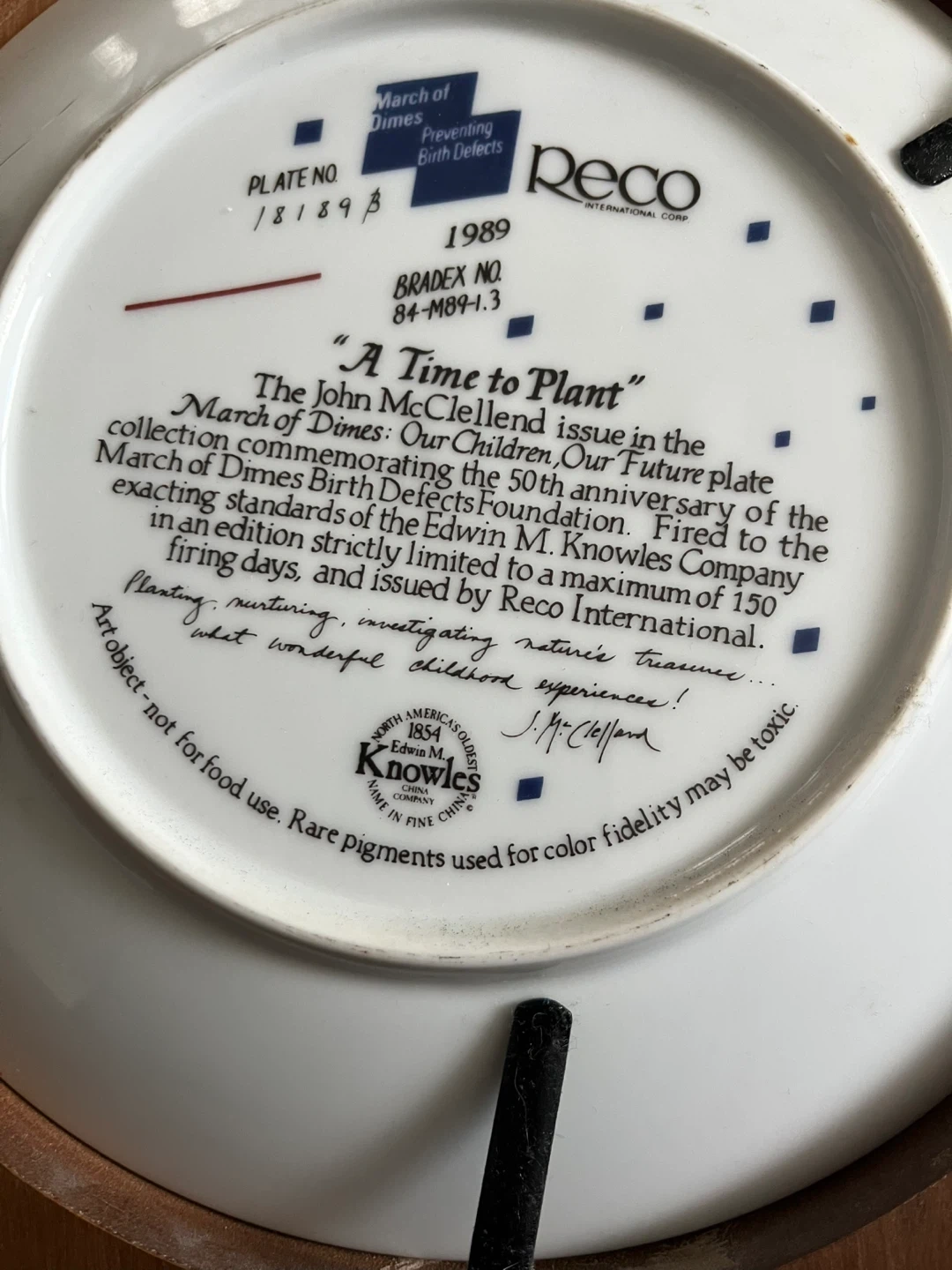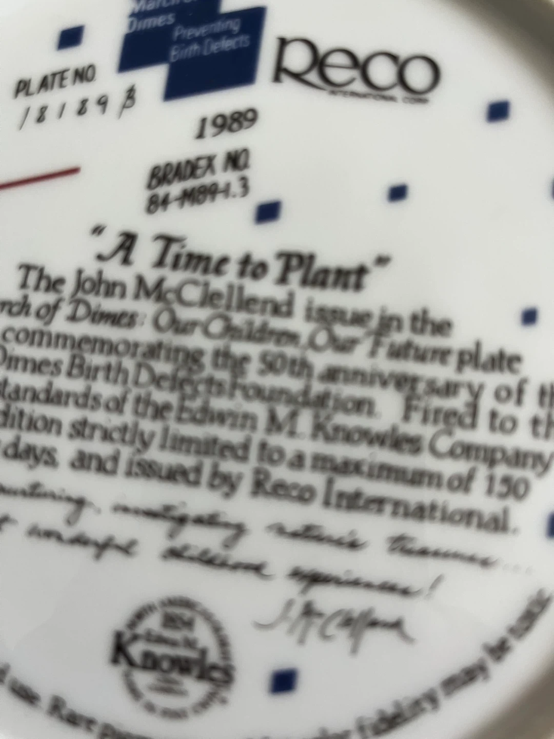 Selling a Reco International Corp. collector plate titled 'A Time to Plant'. It's from the March of Dimes: Our Children, Our Future plate collection, commemorating the 50th anniversary of the March of Dimes Birth Defects Foundation. This plate was issued by Reco International in 1989