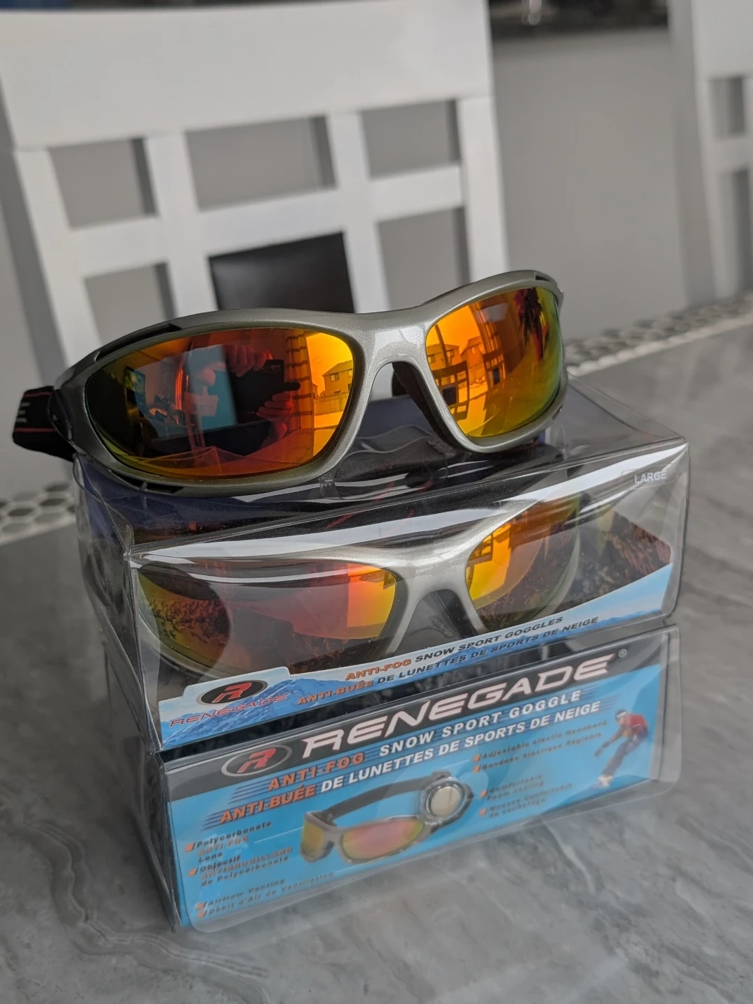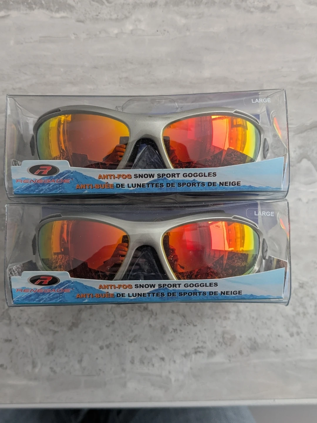 Selling a pair (2 sets) of Renegade Anti-Fog Snow Sport Goggles in size Large. They are silver with a red/orange mirrored lens. Comes with the original box