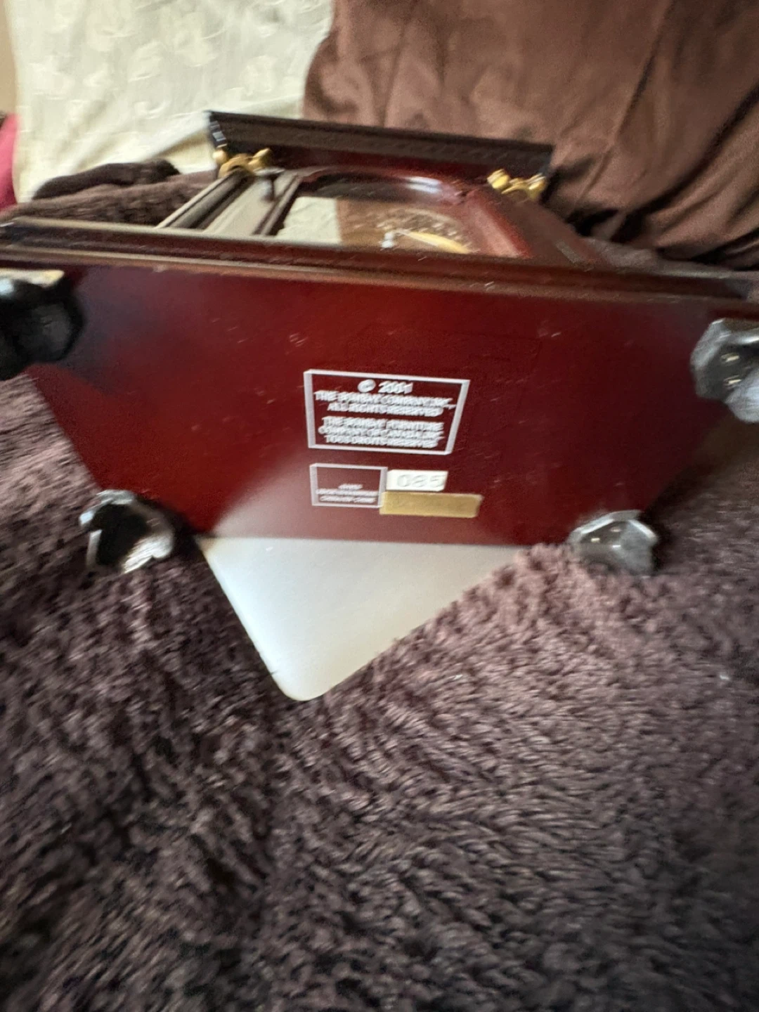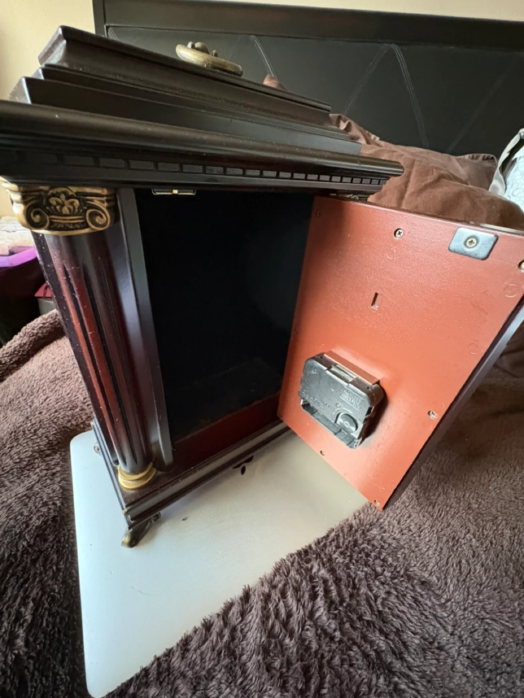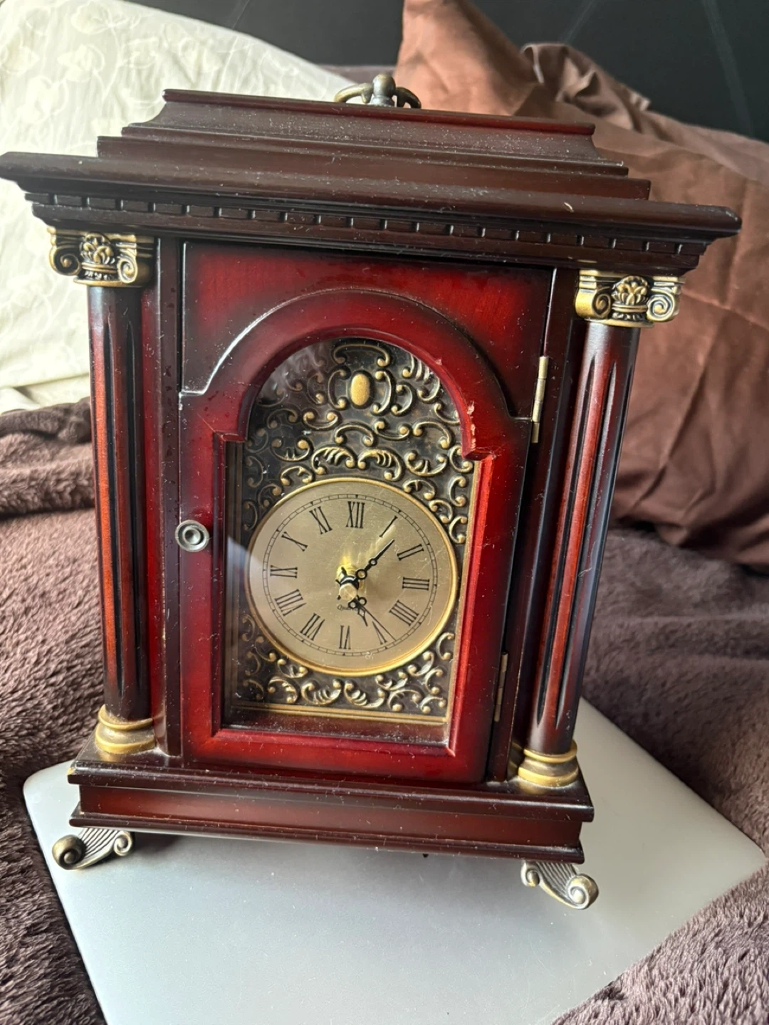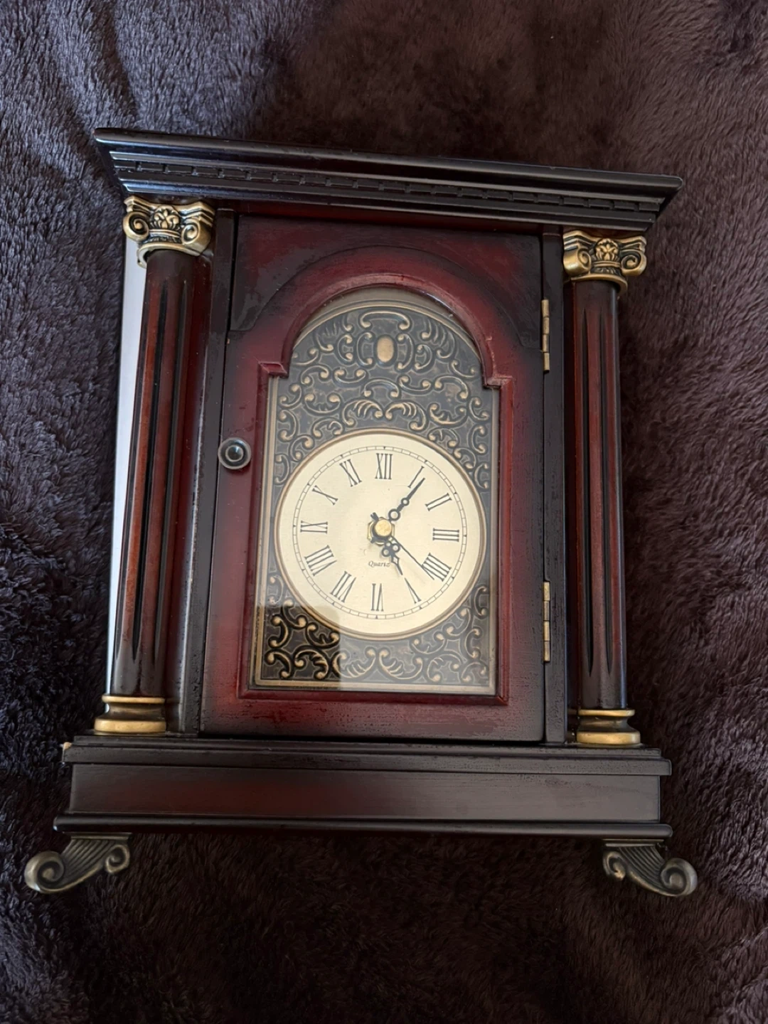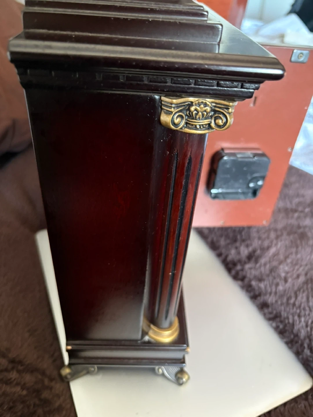 Selling a decorative mantle clock by the Bombay Company,with a classic design. It features Roman numerals and a dark wood finish with gold accents. Great for adding a touch of elegance to any room! Will require a new battery for the clock . A few small imperfections.