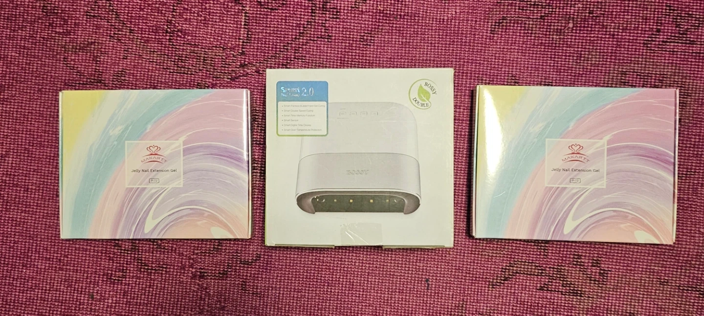 Selling a Makartt Jelly Nail Extension Gel Kit, complete with two boxes of the gel and a Bossy Double 2-in-1 Cordless LED/UV Lamp. The lamp features intelligent infrared sensor operation and is 48W. Perfect for getting salon-quality nails at home!