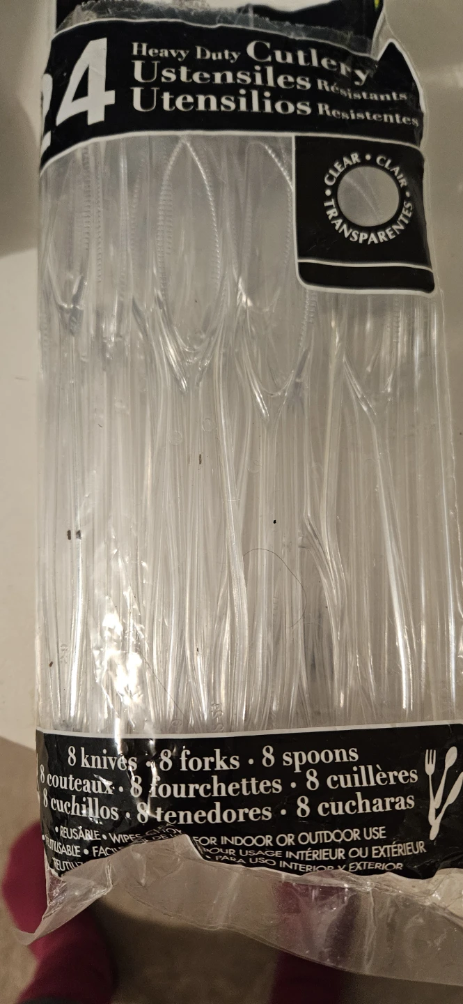 #gifting Selling a pack of 24 heavy-duty clear cutlery pieces! The set includes 8 knives, 8 forks, and 8 spoons. Perfect for indoor or outdoor use and reusable too