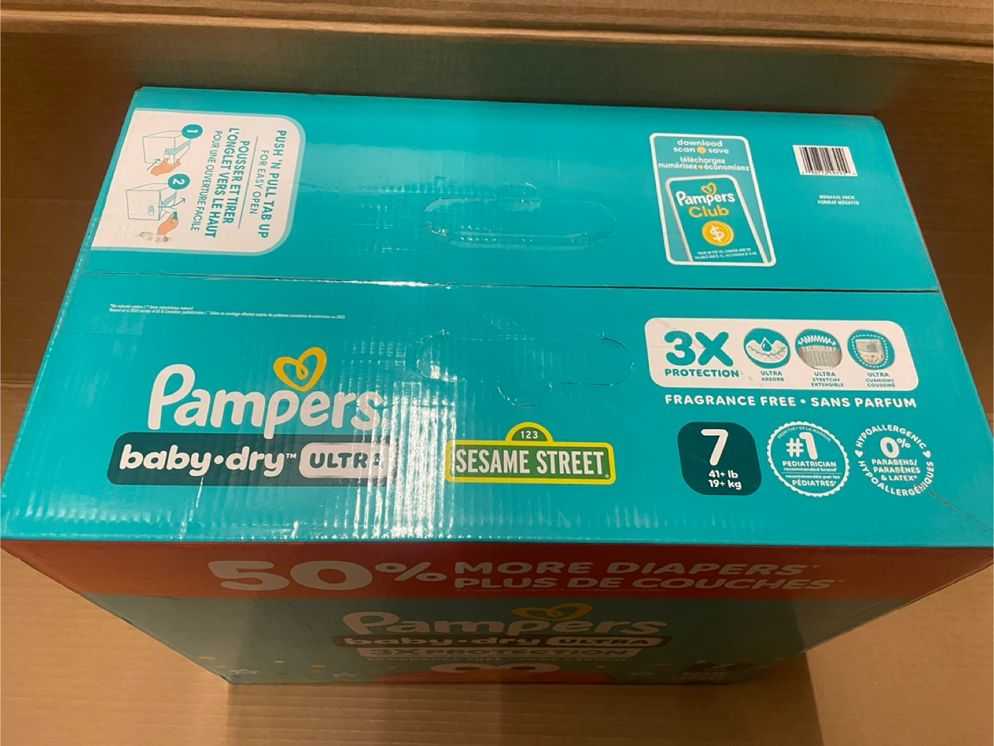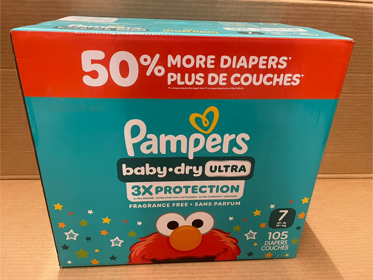 Selling a box of Pampers Baby Dry Ultra diapers, size 7. The box contains 105 diapers. They offer 3x protection, are fragrance-free, and hypoallergenic. Great for babies 41+ lb or 19+ kg!