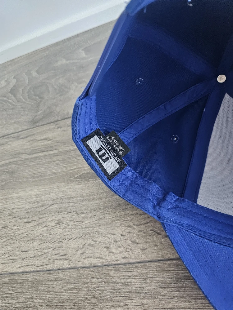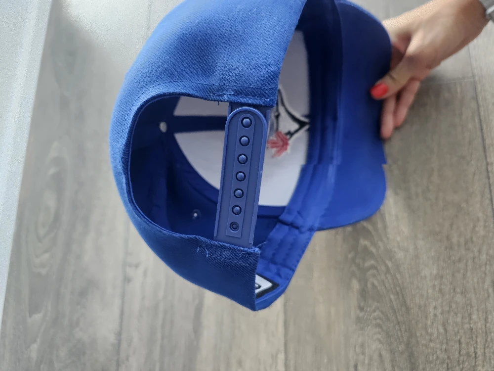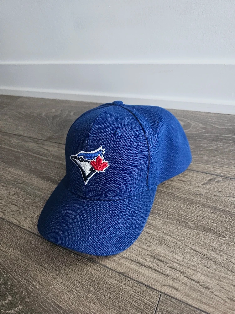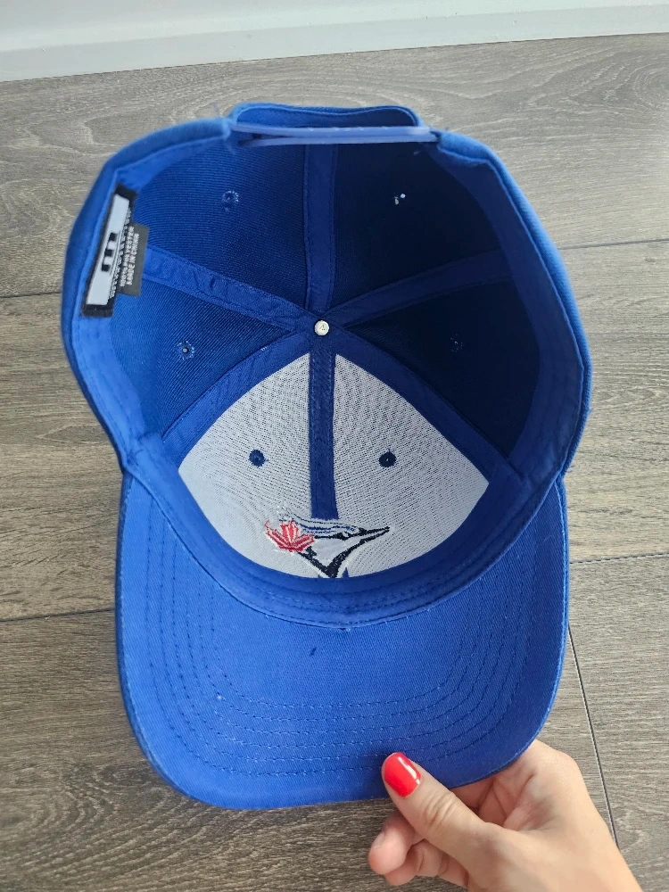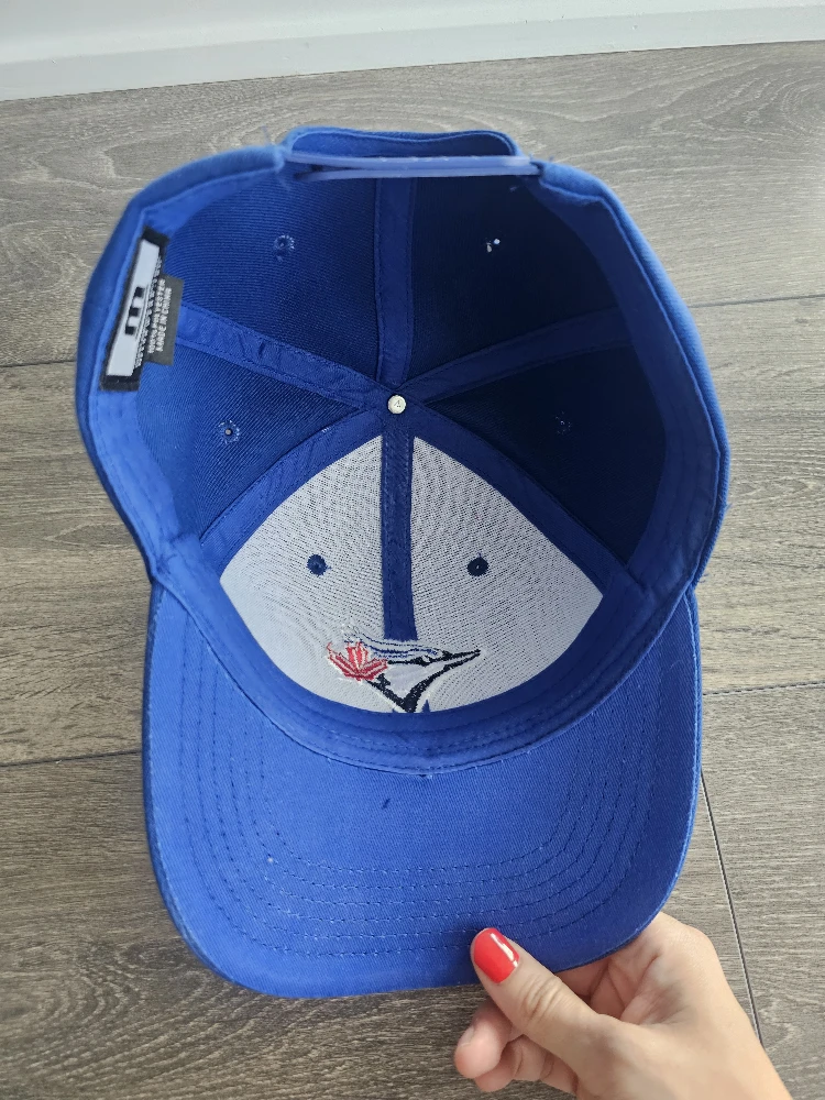 The cap is blue and features the Blue Jays logo. It's adjustable for a comfortable fit.