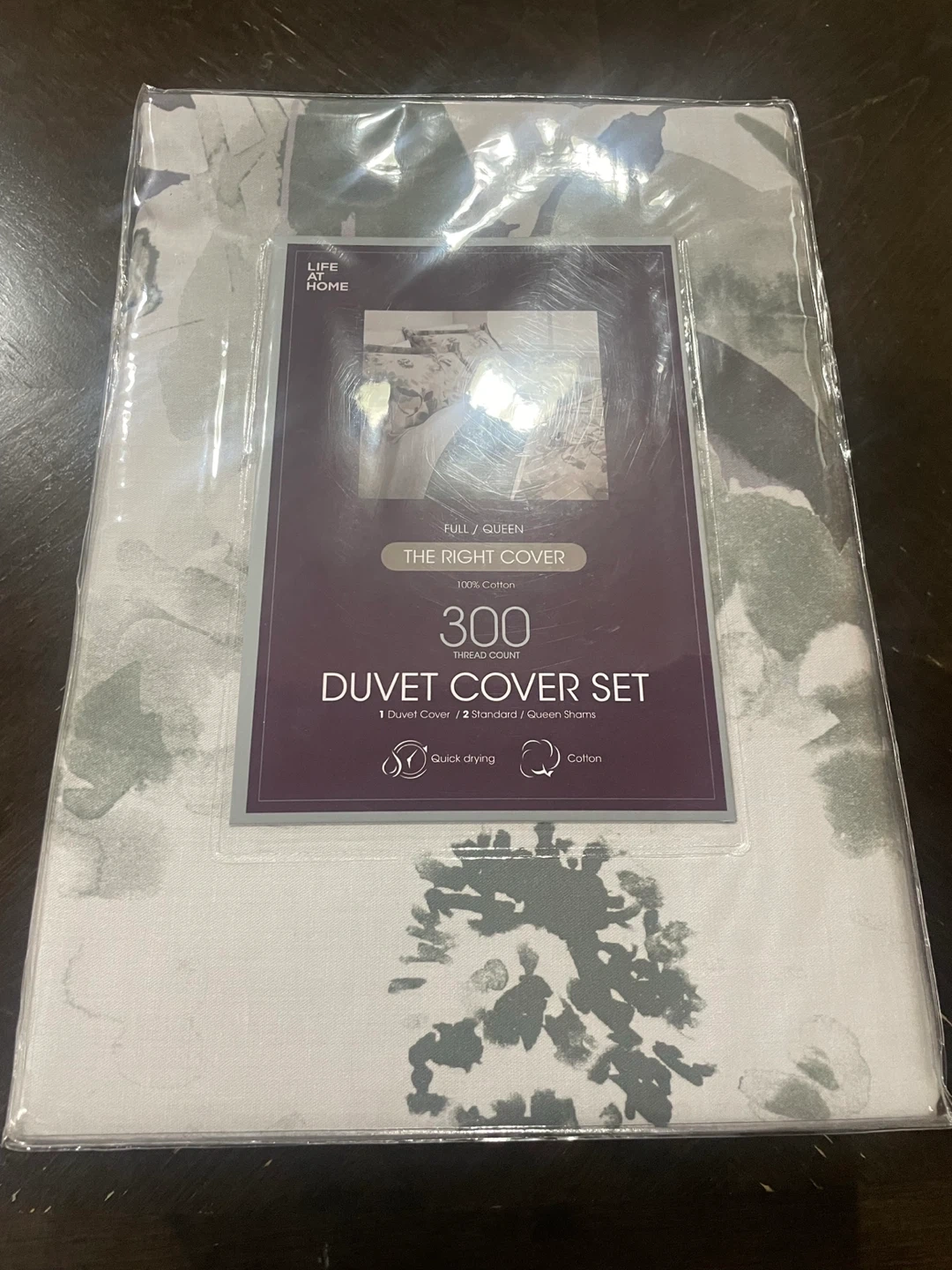 Selling a new Life At Home duvet cover set for a full/queen size bed. It's made of 100% cotton with a 300 thread count. The set includes one duvet cover (88 in x 90 in) and two standard/queen shams (21 in x 26 in + 2 in). It's quick drying and has a convenient button closure to keep your duvet from shifting!