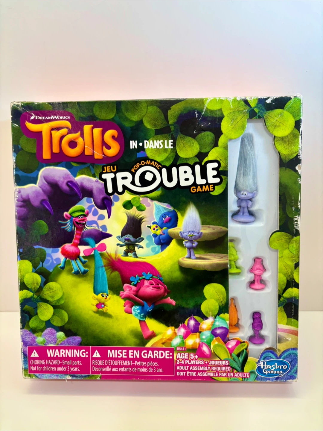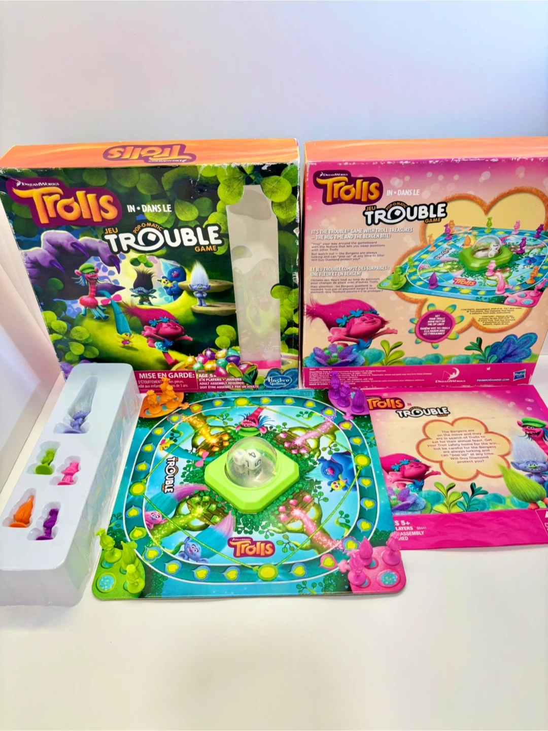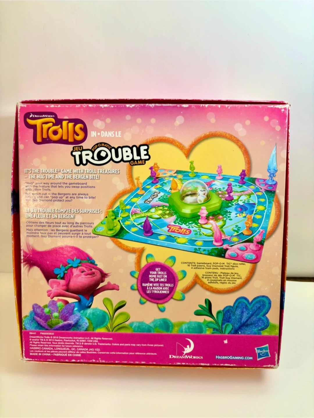 Trolls Trouble game by Dreamworks and Hasbro Gaming! It's a pop-o-matic kids game for ages 5+. The box includes all the pieces including the gameboard, pop-o-matic die roller, 16 troll pawns, and instructions