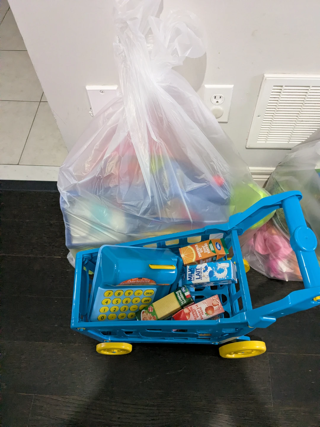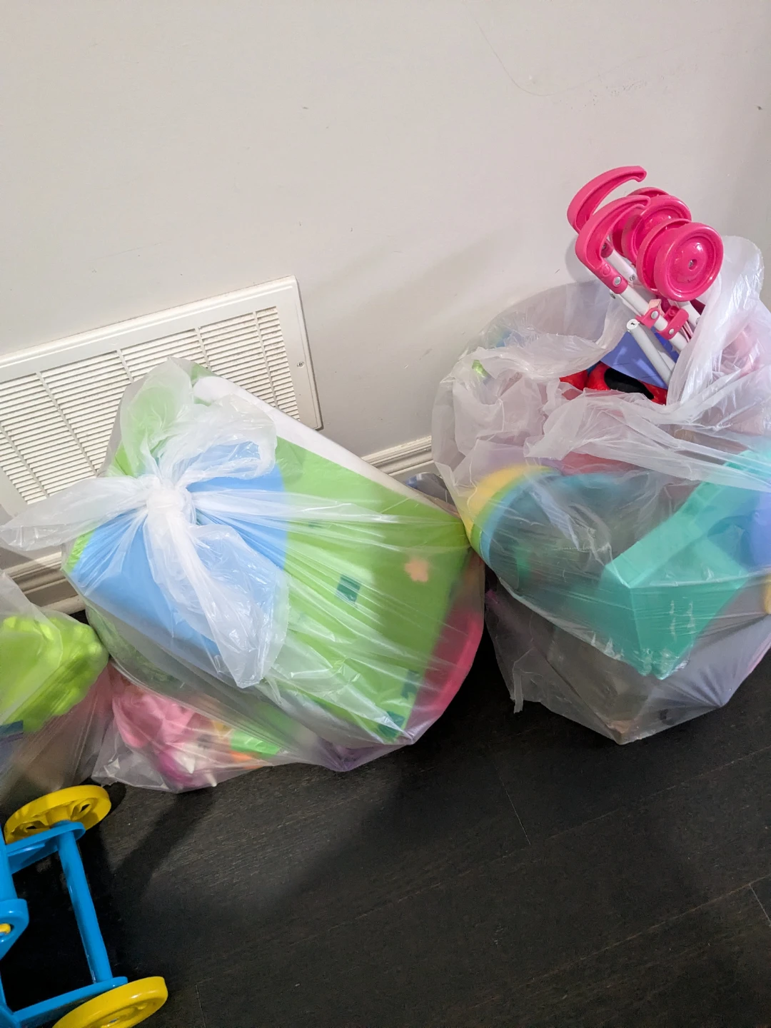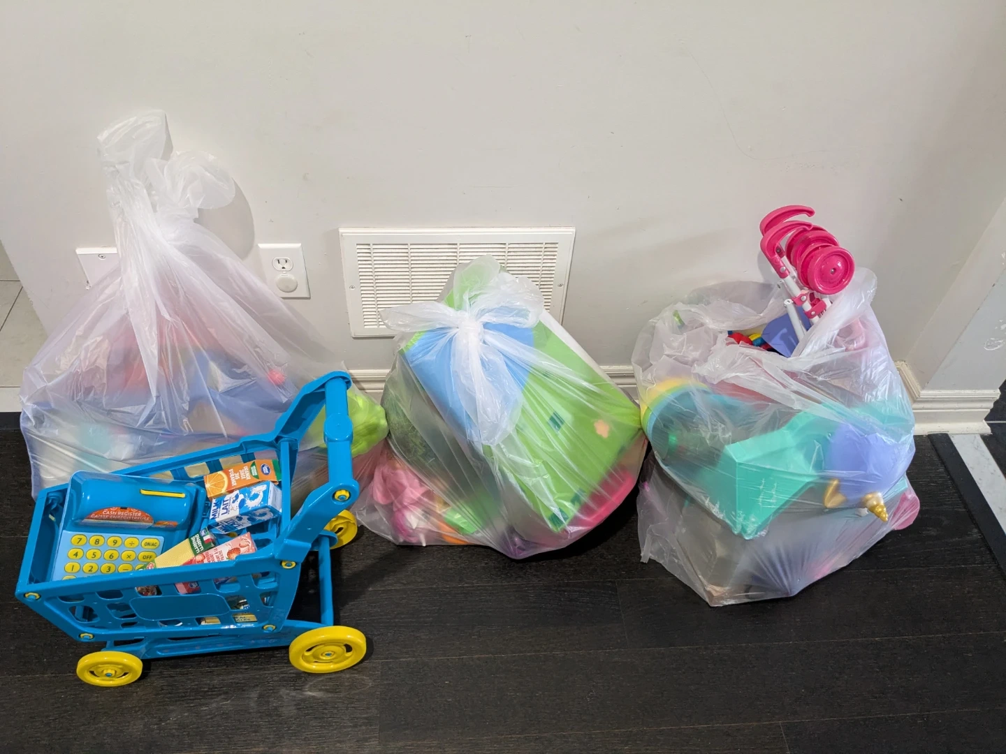 I have a few bags filled with various kids' toys for age 1-4. $5 goes to my kids piggy bank since she is voluntarily giving these up.