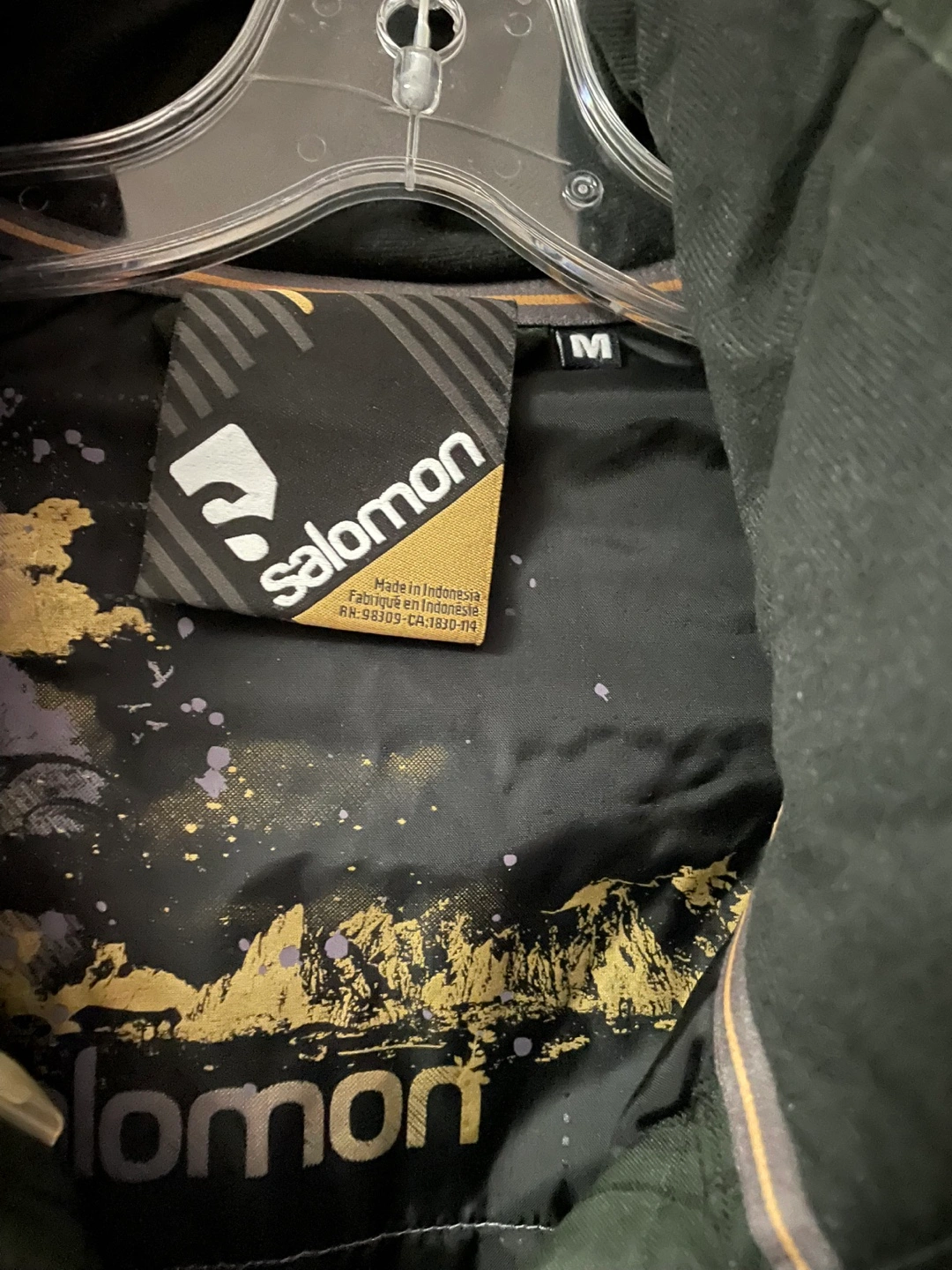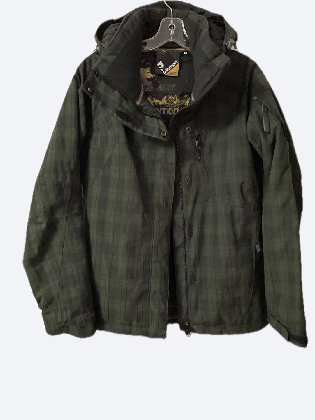 Selling a Salomon jacket in a green plaid pattern, size medium. It's in great condition and ready for the slopes or everyday wear!