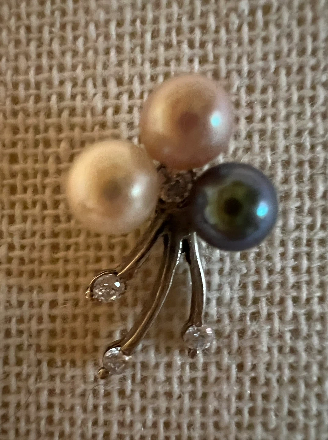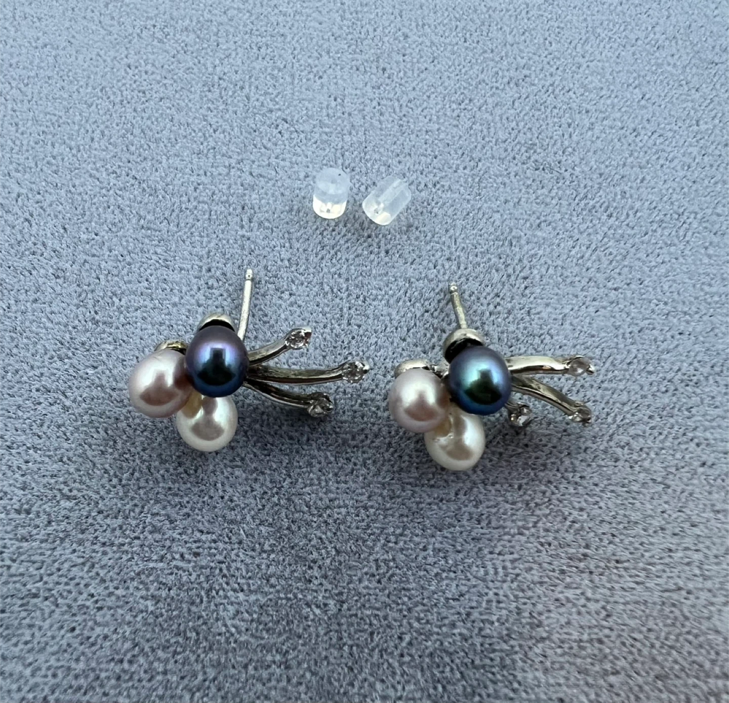 Three genuine pearls in white, pink, and dark grey, set in sterling silver