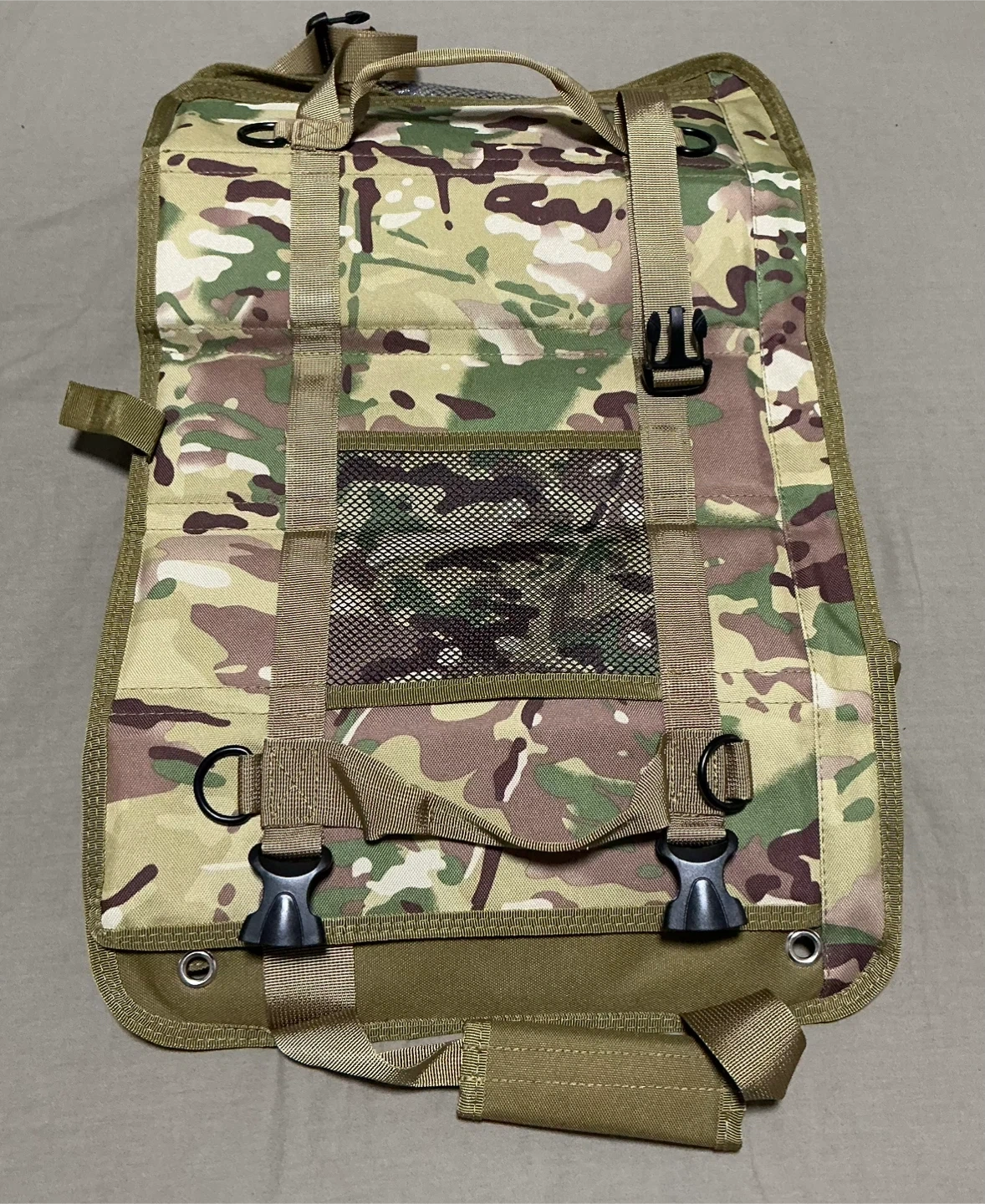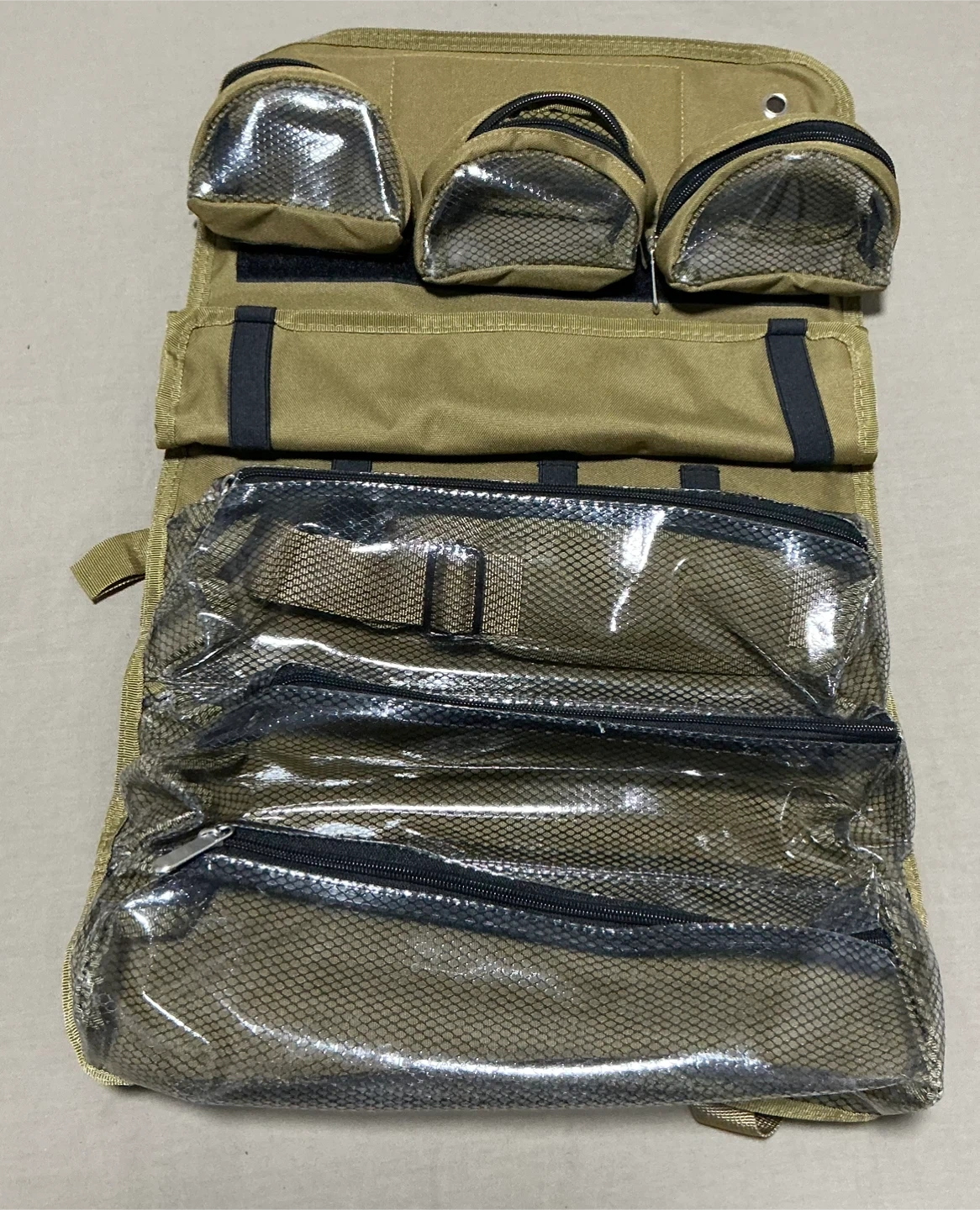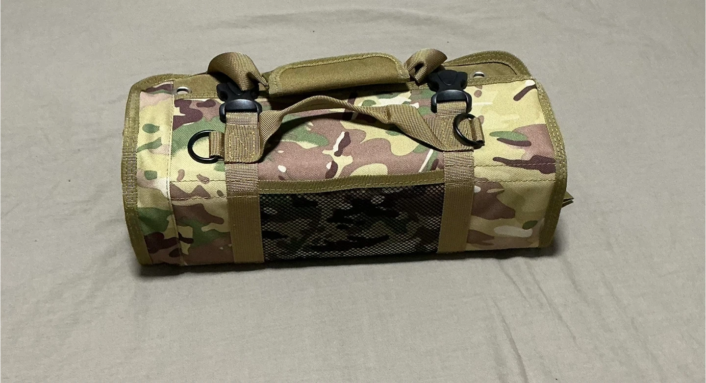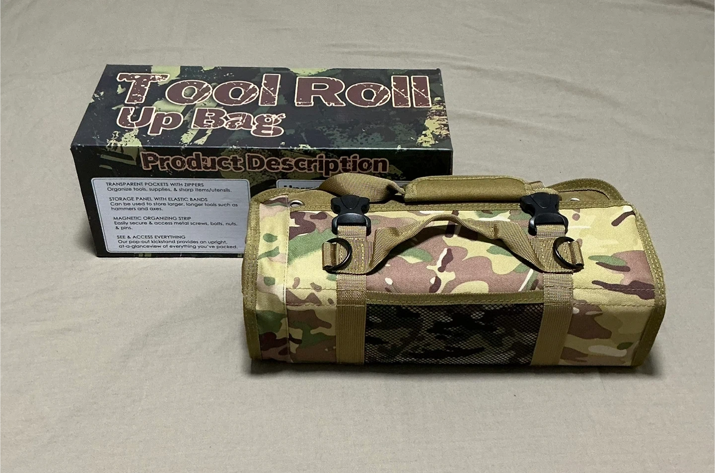 Tool Roll Up Bag in a camouflage pattern! It features transparent pockets with zippers to organize your tools and supplies. There are also storage panels with elastic bands, perfect for holding items like hammers and axes. The magnetic fastening strip helps keep metal screws, bolts, nuts, and pins in place. The bag also has a pop-out kickstand.