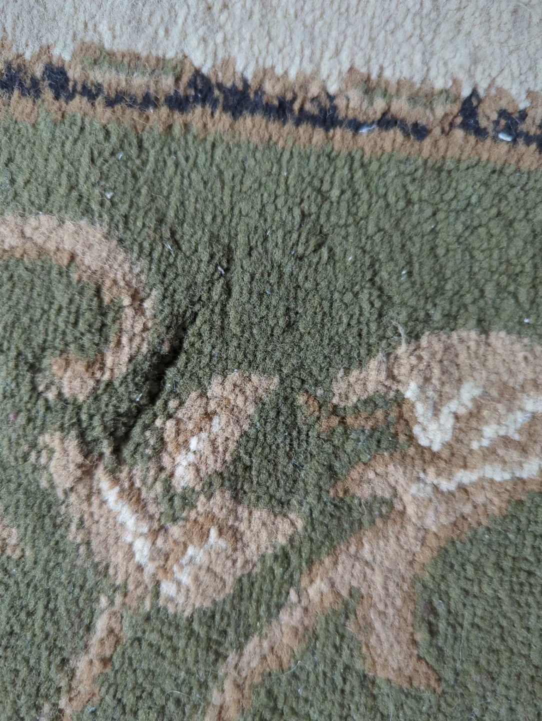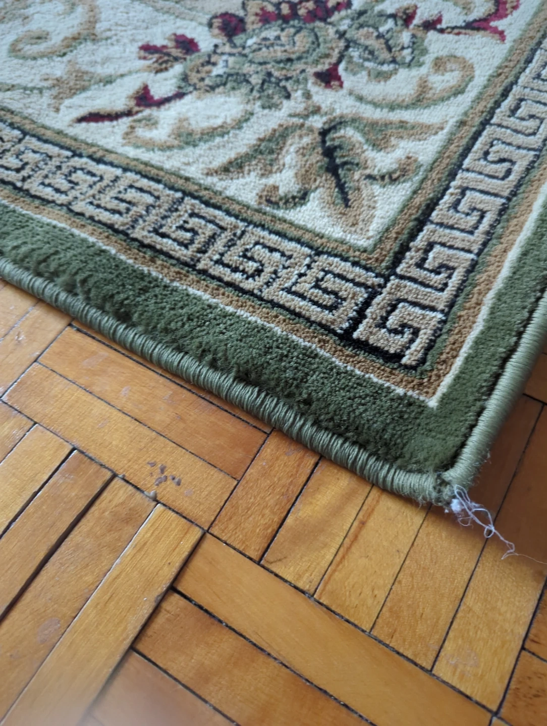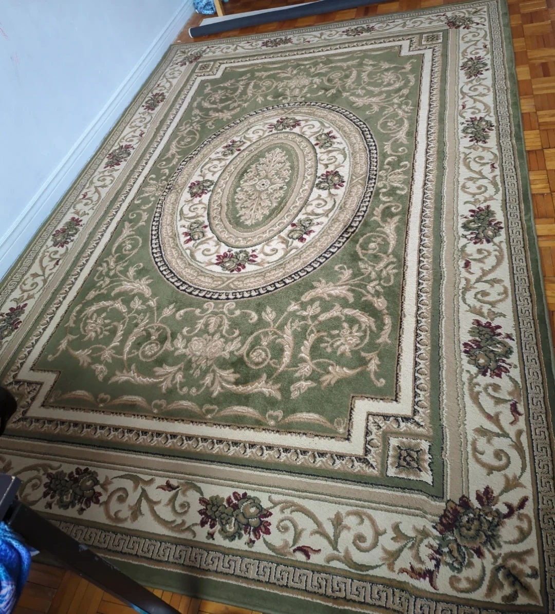 Selling a lovely area rug with a green and floral pattern. It's in good condition and would look great in any room. The rug features a detailed floral design with a green border and a central oval pattern. Perfect for adding a touch of elegance to your home!
