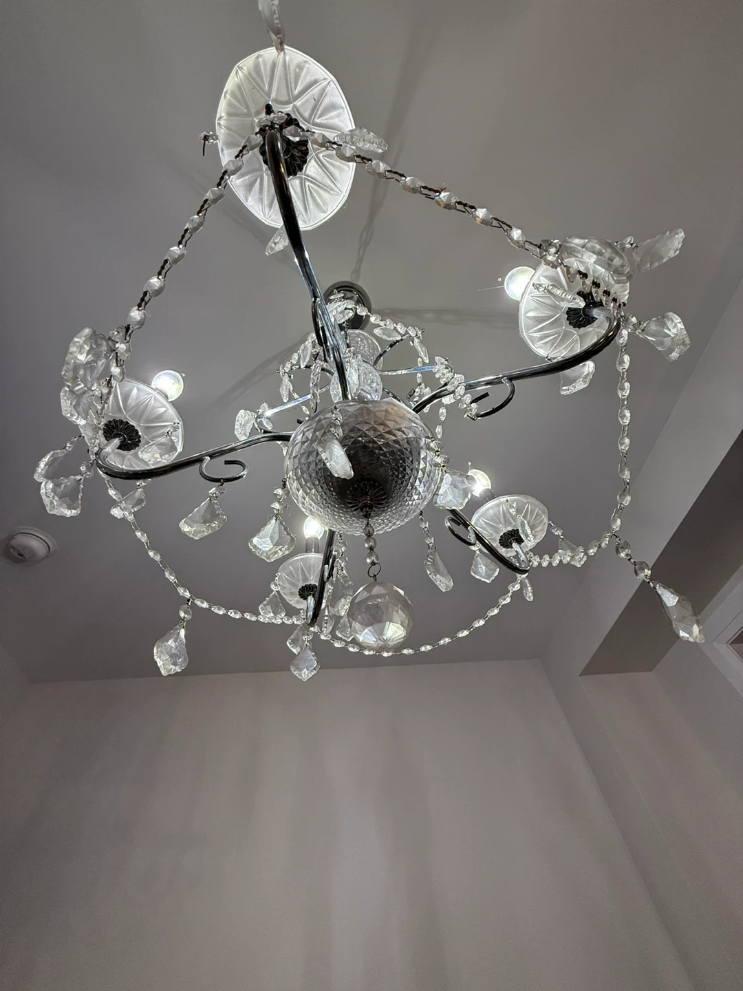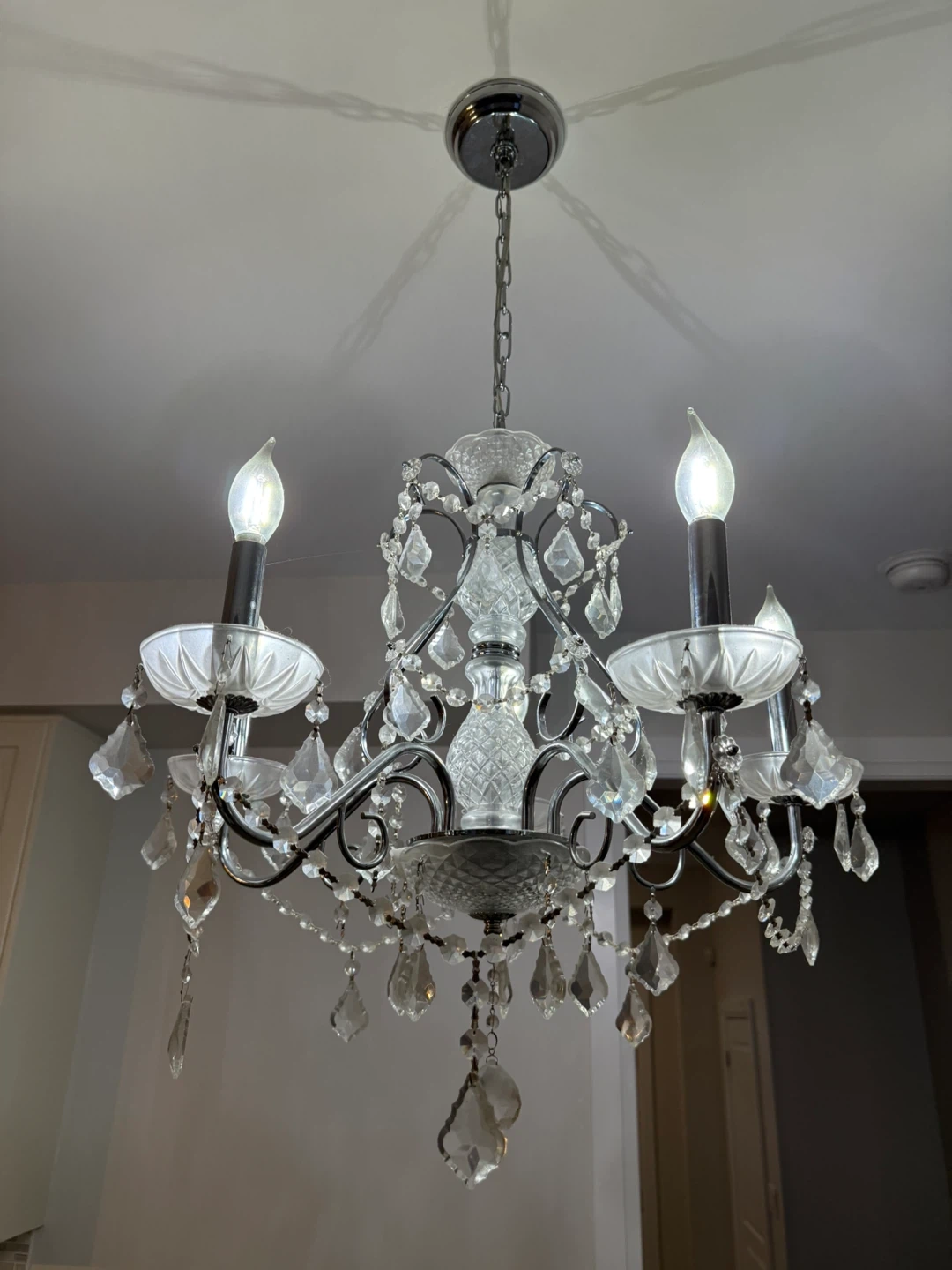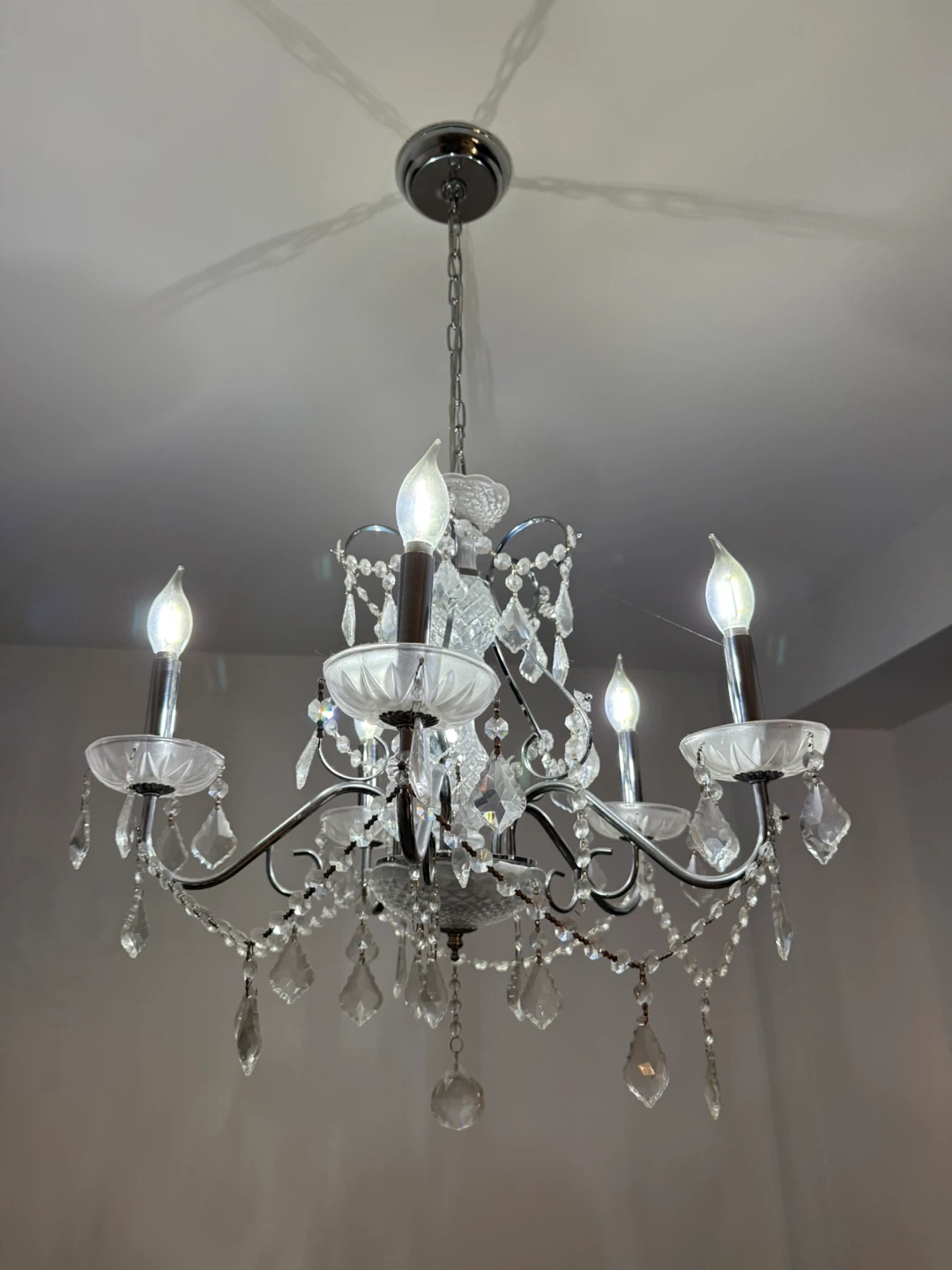 Here's a beautiful crystal chandelier that would add a touch of elegance to any room! It features delicate crystals and a classic design. Perfect for a dining room, living room, or entryway! Real crystals add elegance to this chandelier.