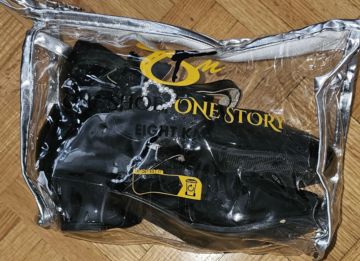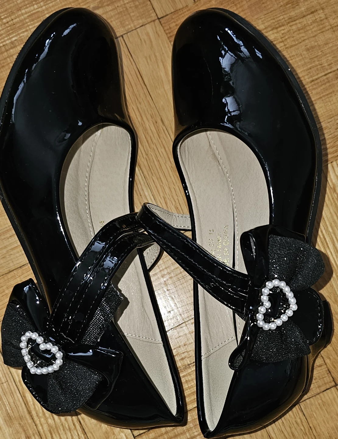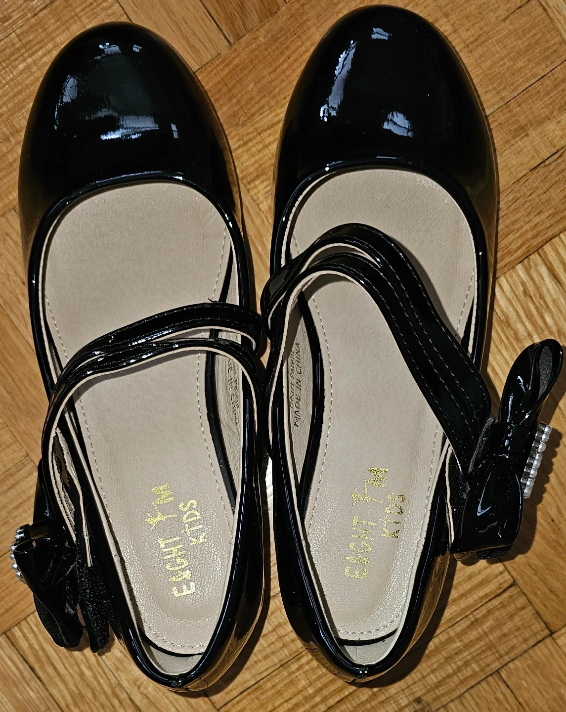 These are a pair of adorable black patent shoes from Eight Km Kids! They feature a cute bow detail with a pearl heart accent. Perfect for dressing up any outfit.Size is US1