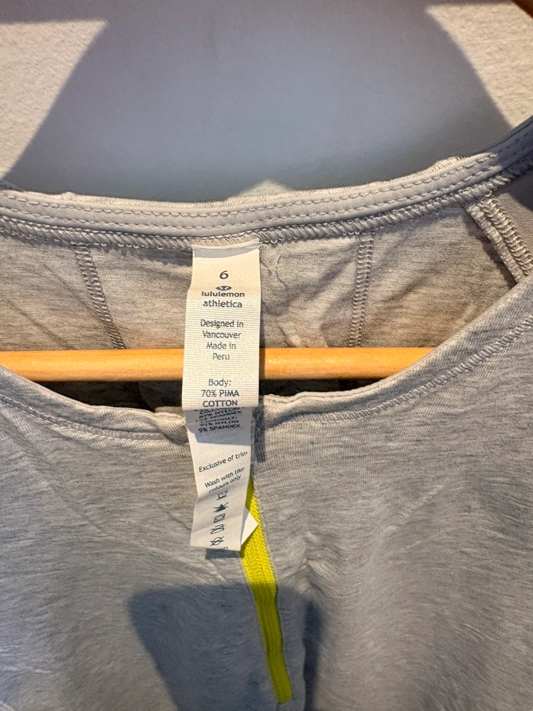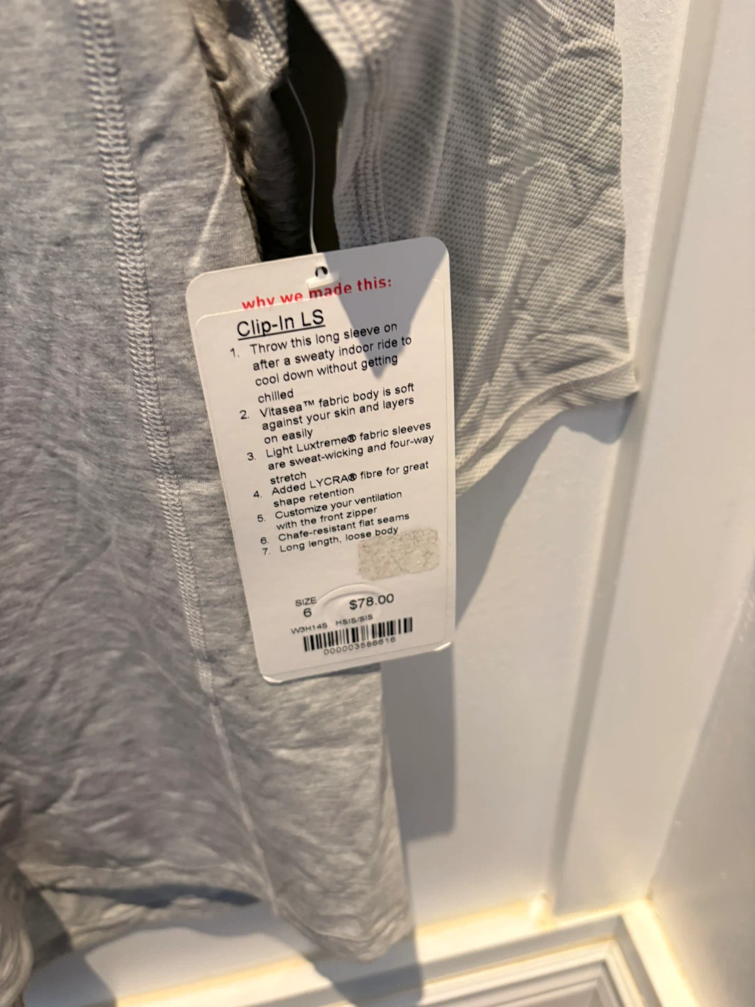 Selling a Lululemon Athletica Clip-In Long Sleeve top in size 6. The material is 70% Pima Cotton and 5% Spandex. It has a front zipper for ventilation and is designed for a long length and loose body. Originally bought for $78.00
